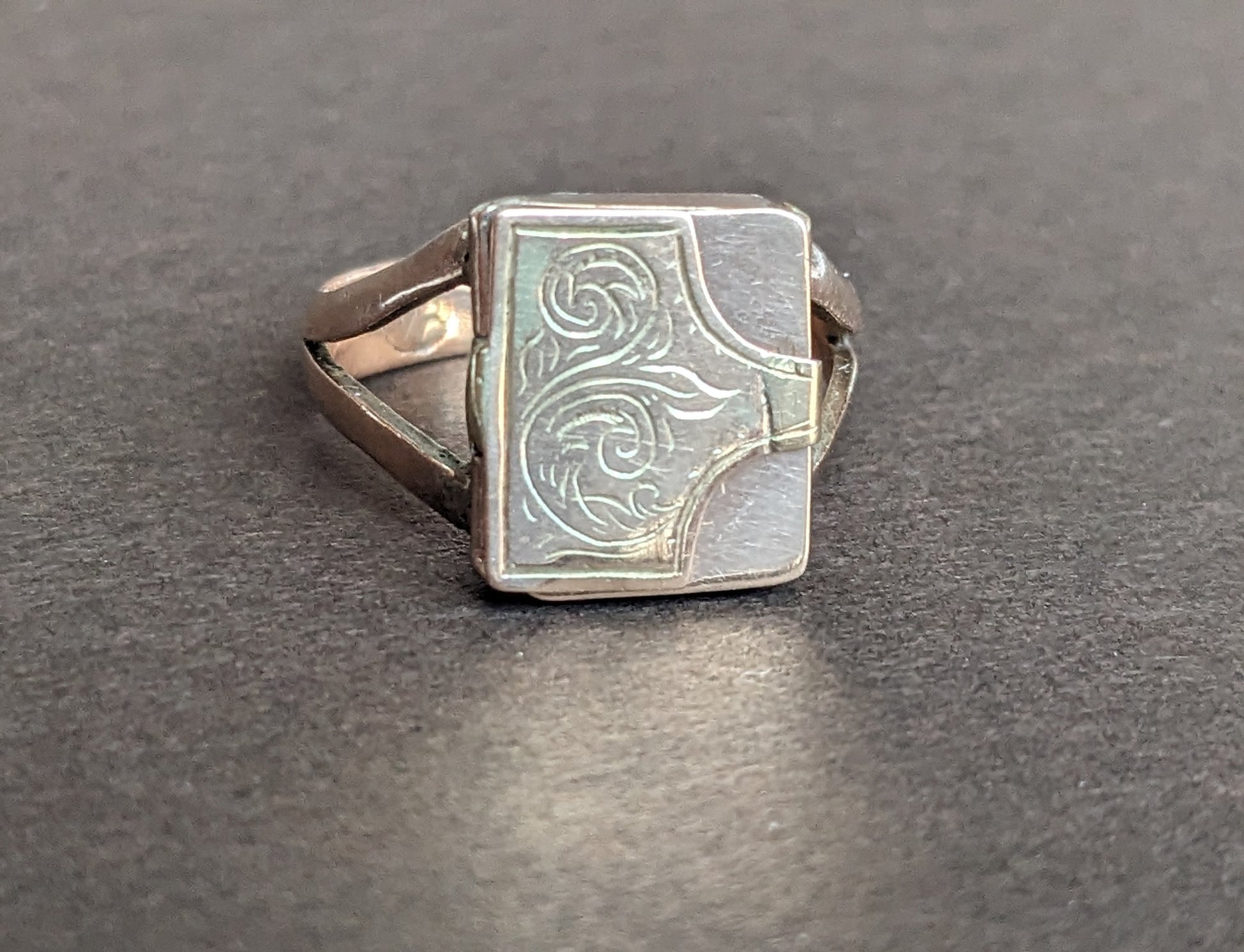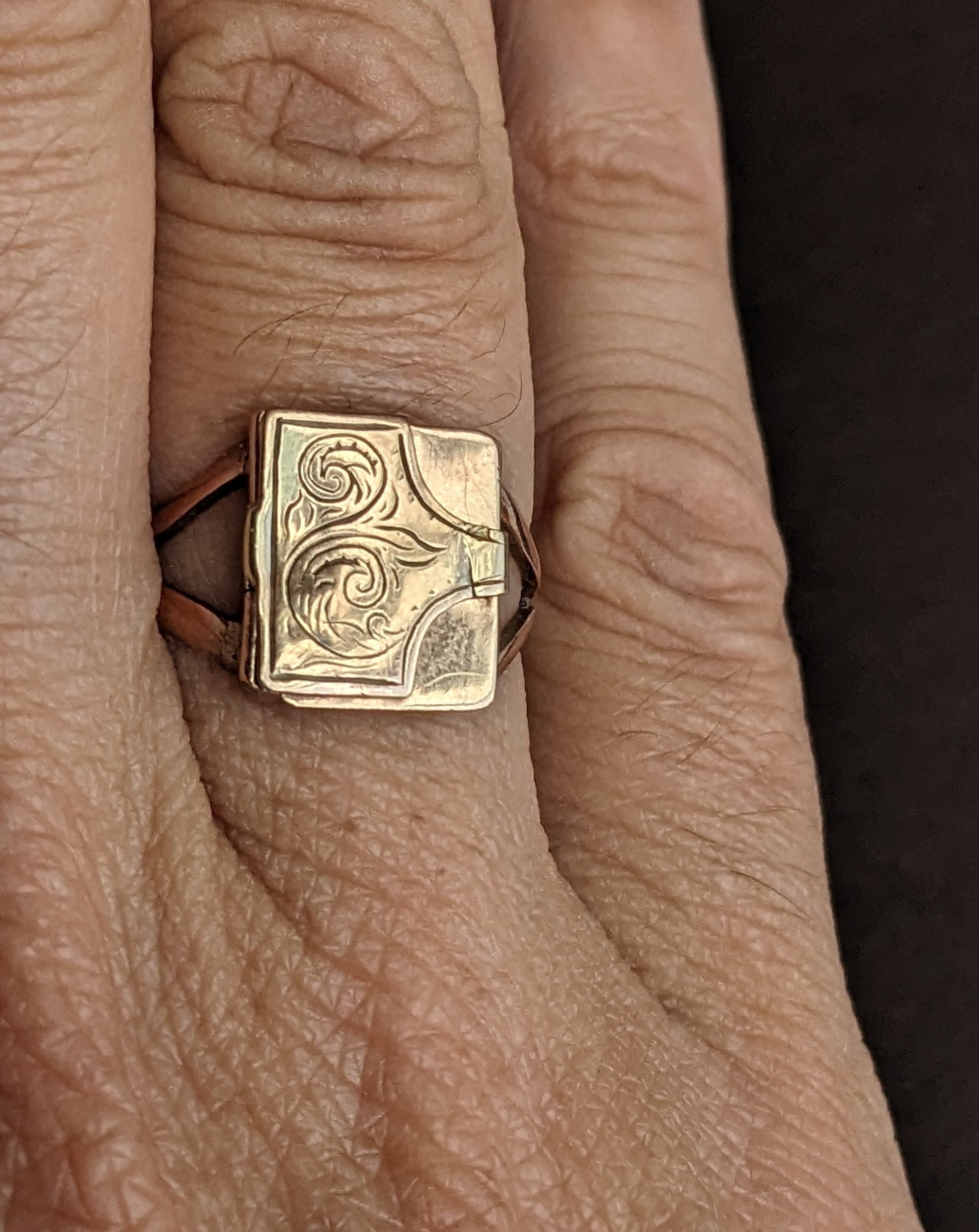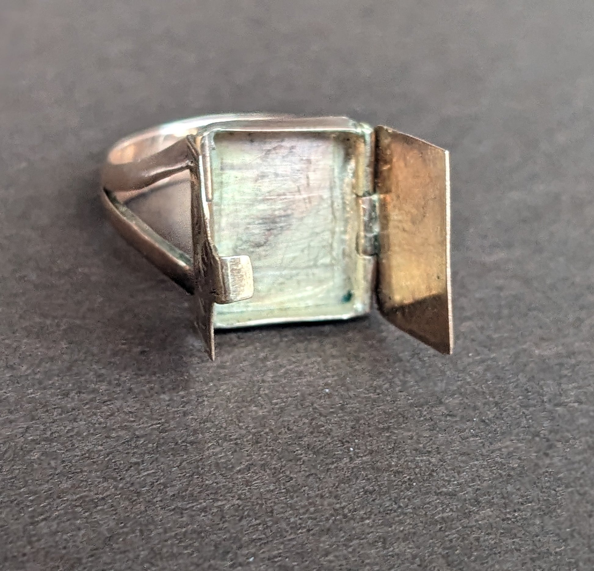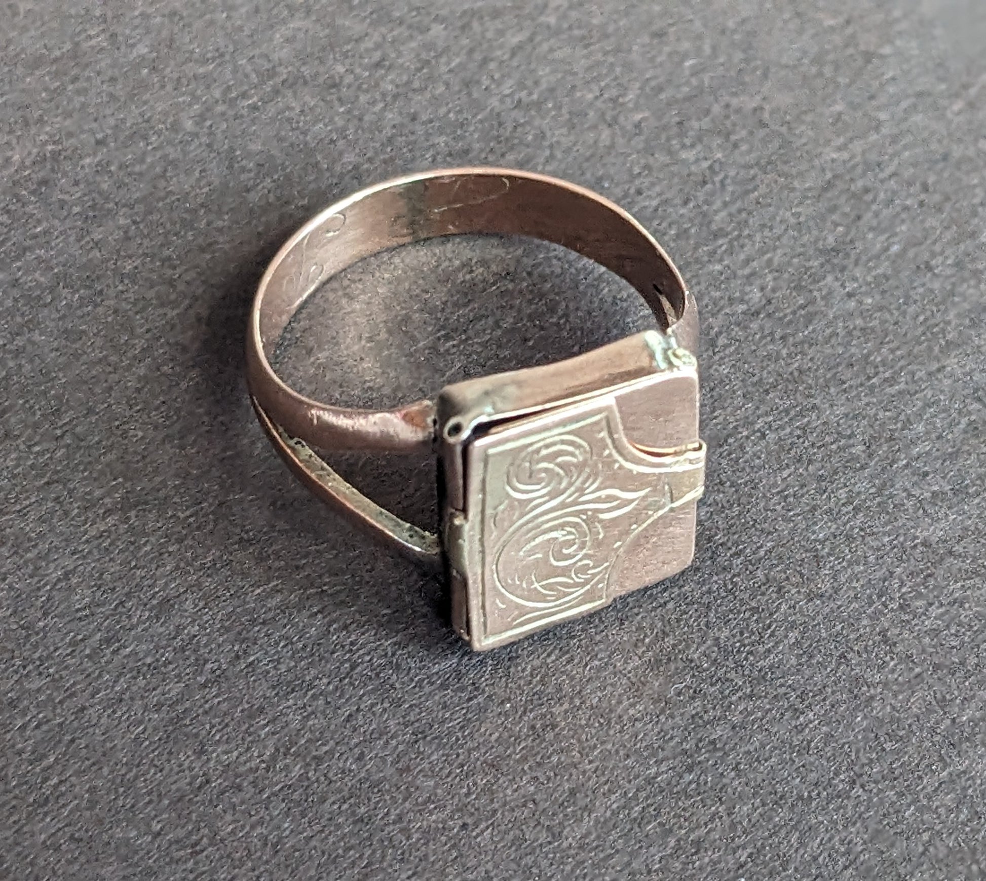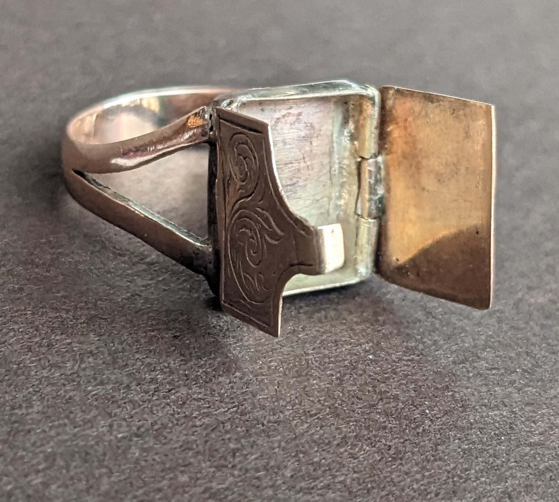 This precious envelope ring was intended to hold a love note and lock of hair.