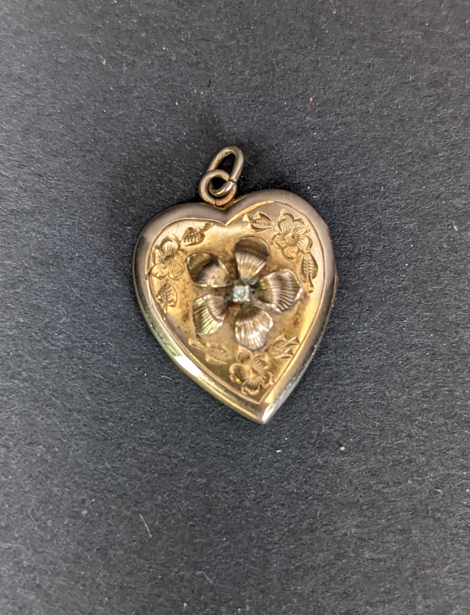 Small mine cut diamond set in the center of 3-d flower in the center of the heart shaped locket.