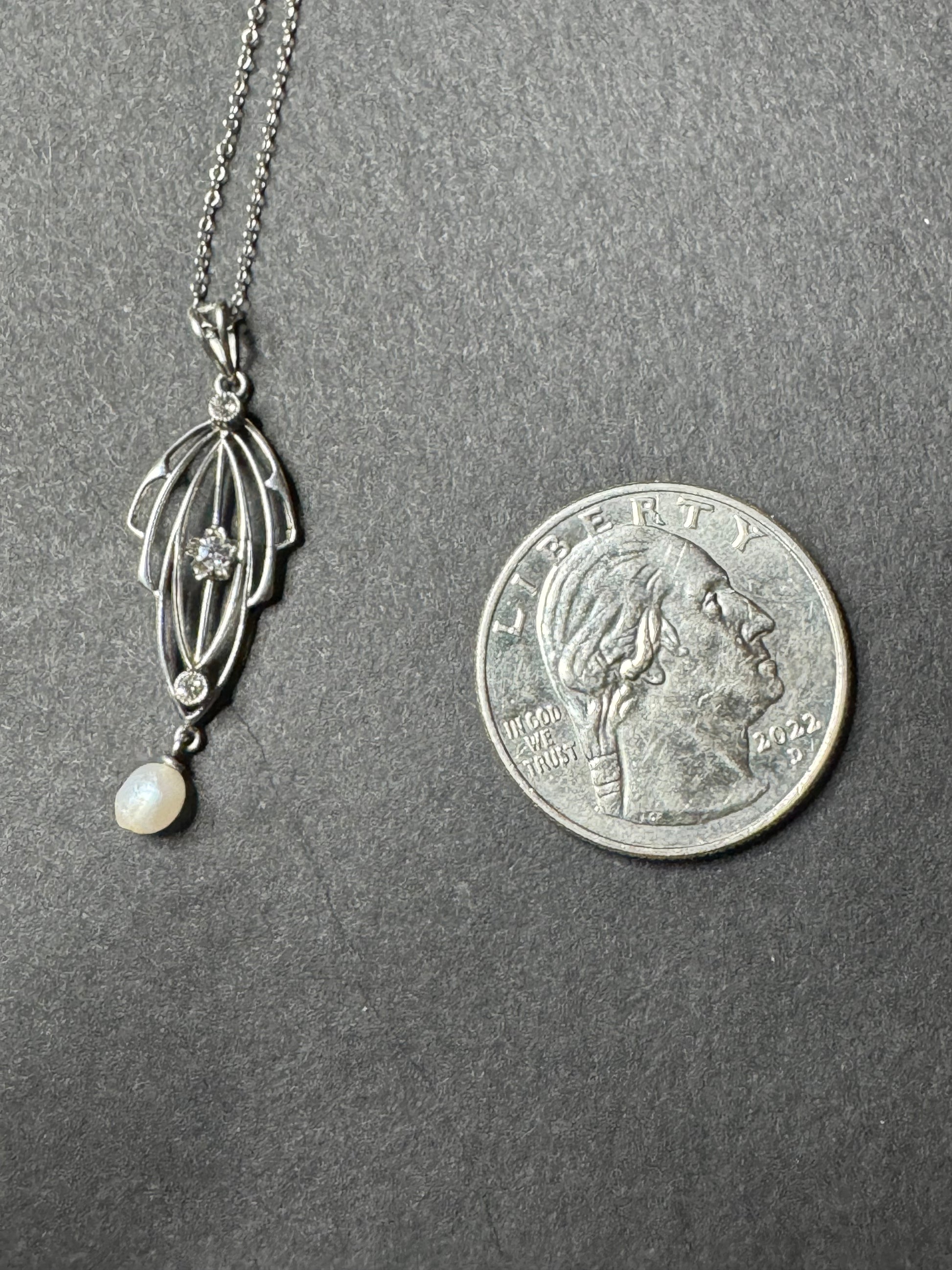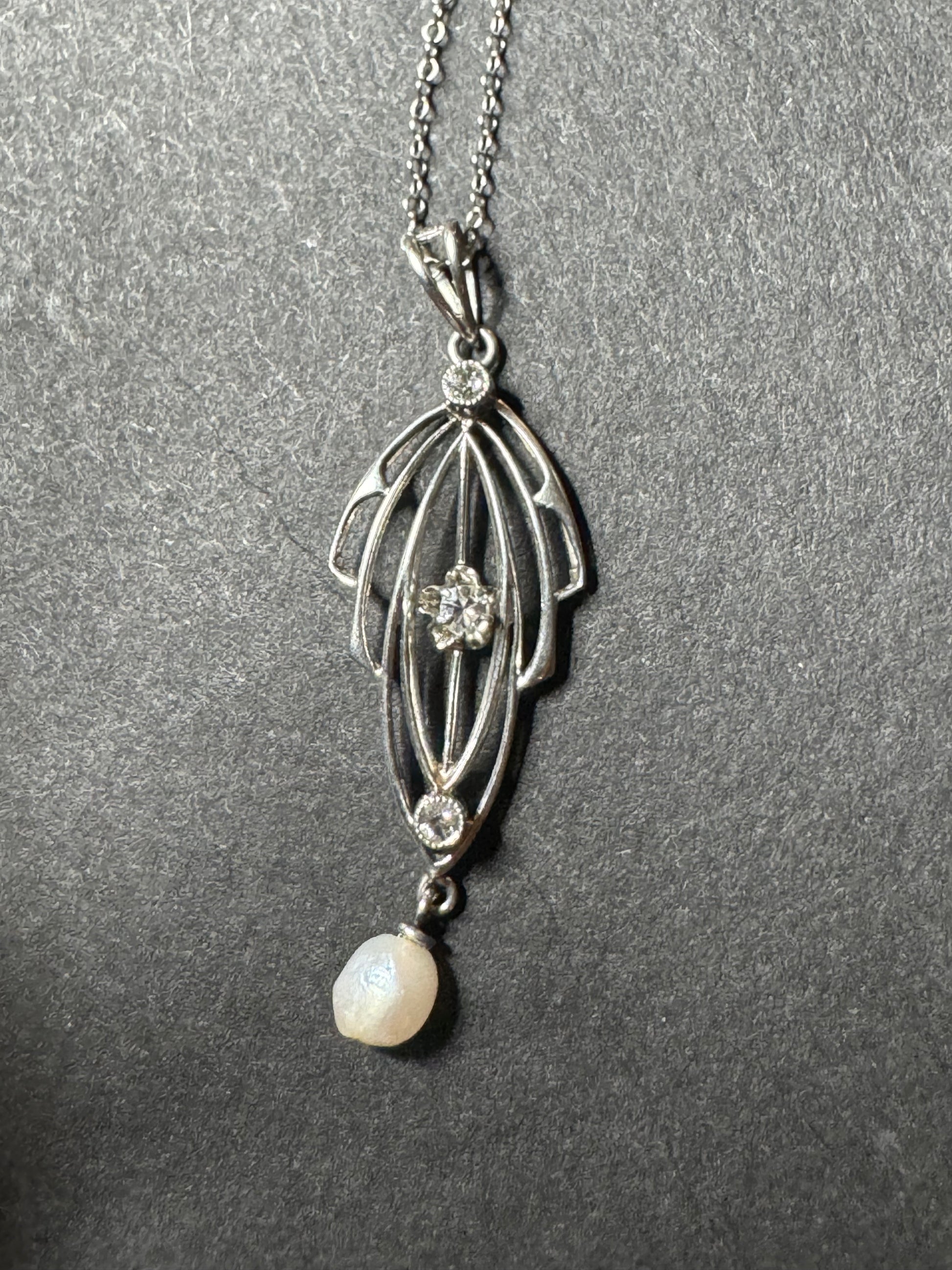 10k Art Nouveau White Gold Mine Cut Diamond and Pearl Lavalier