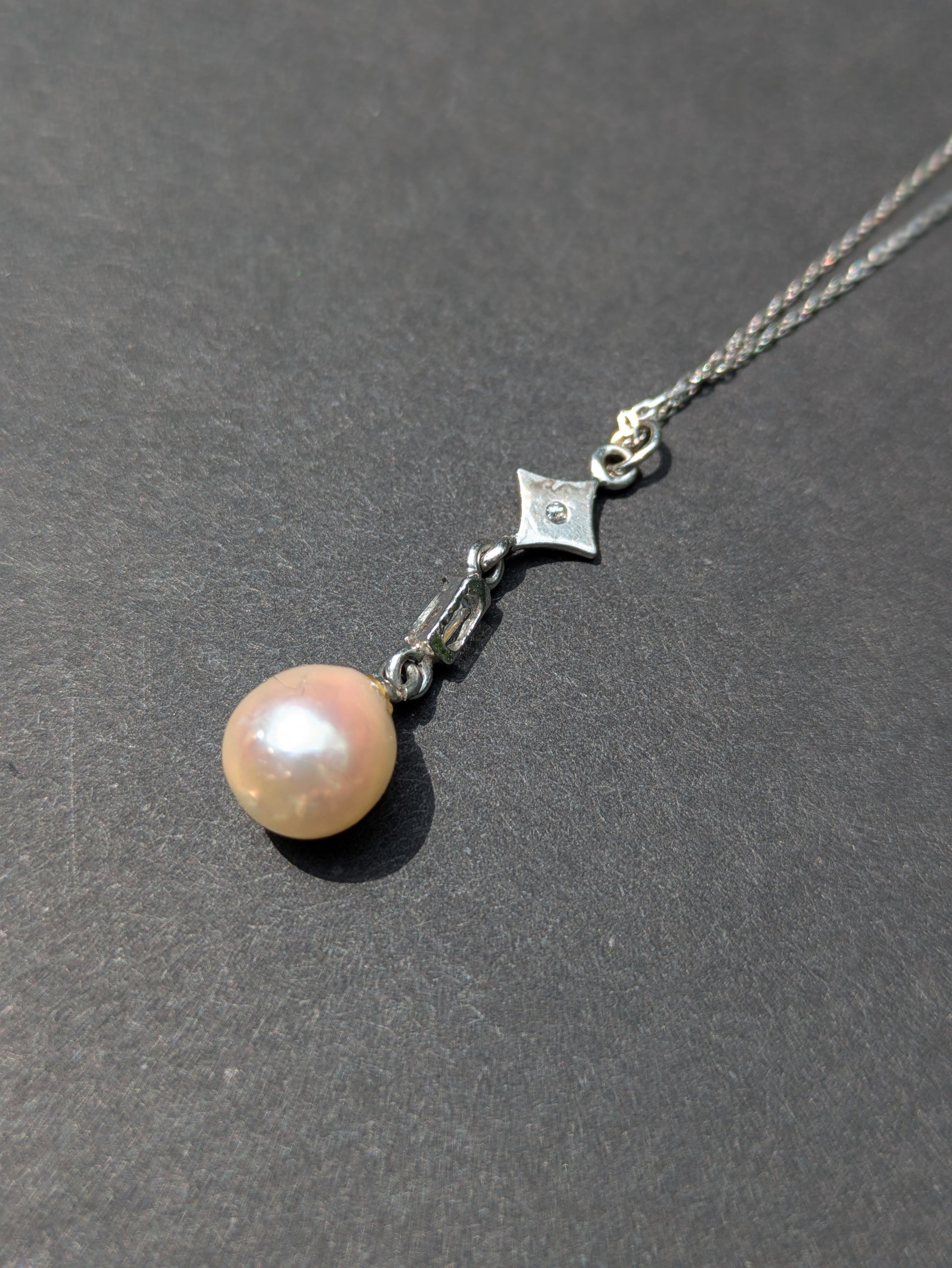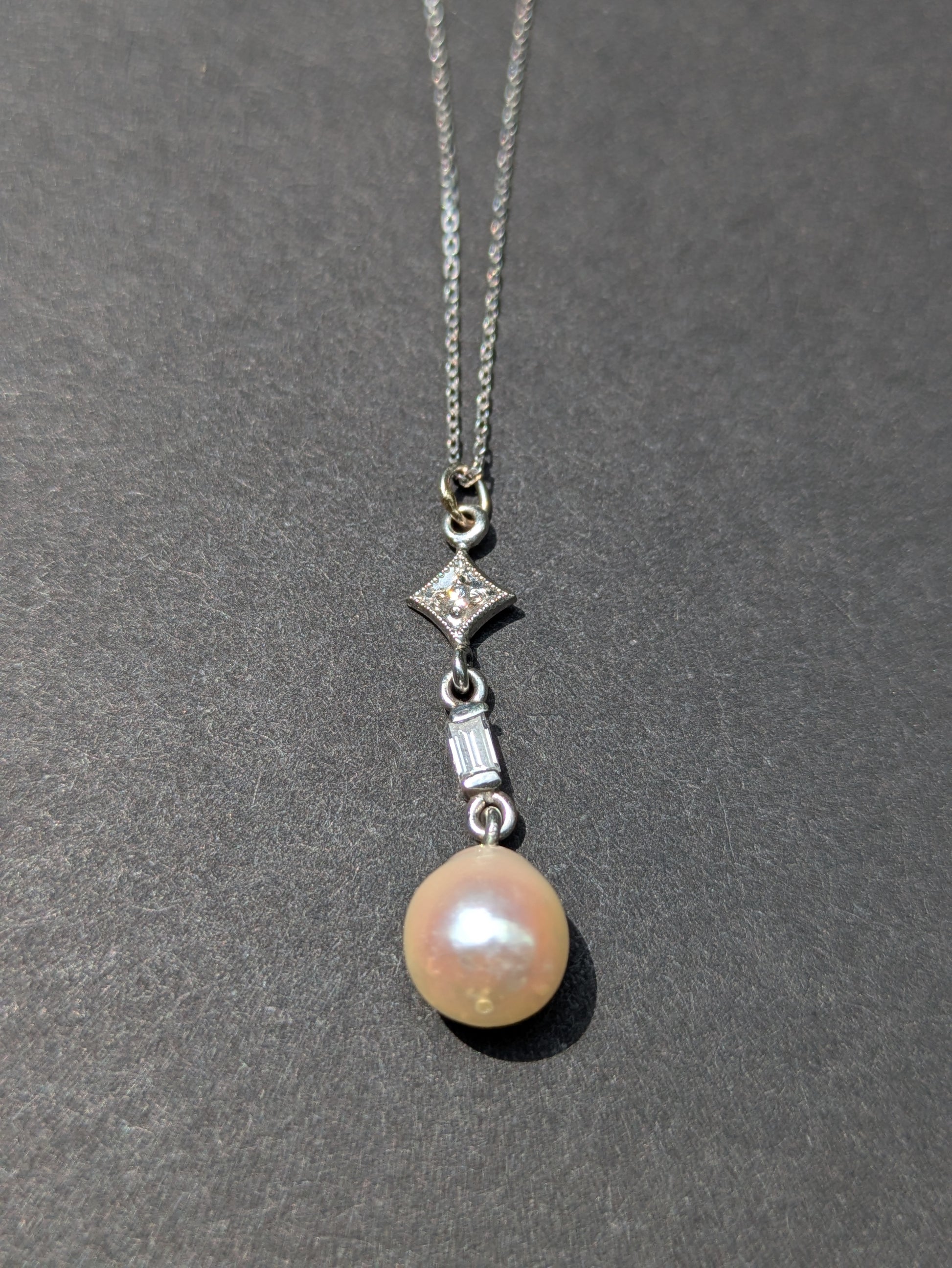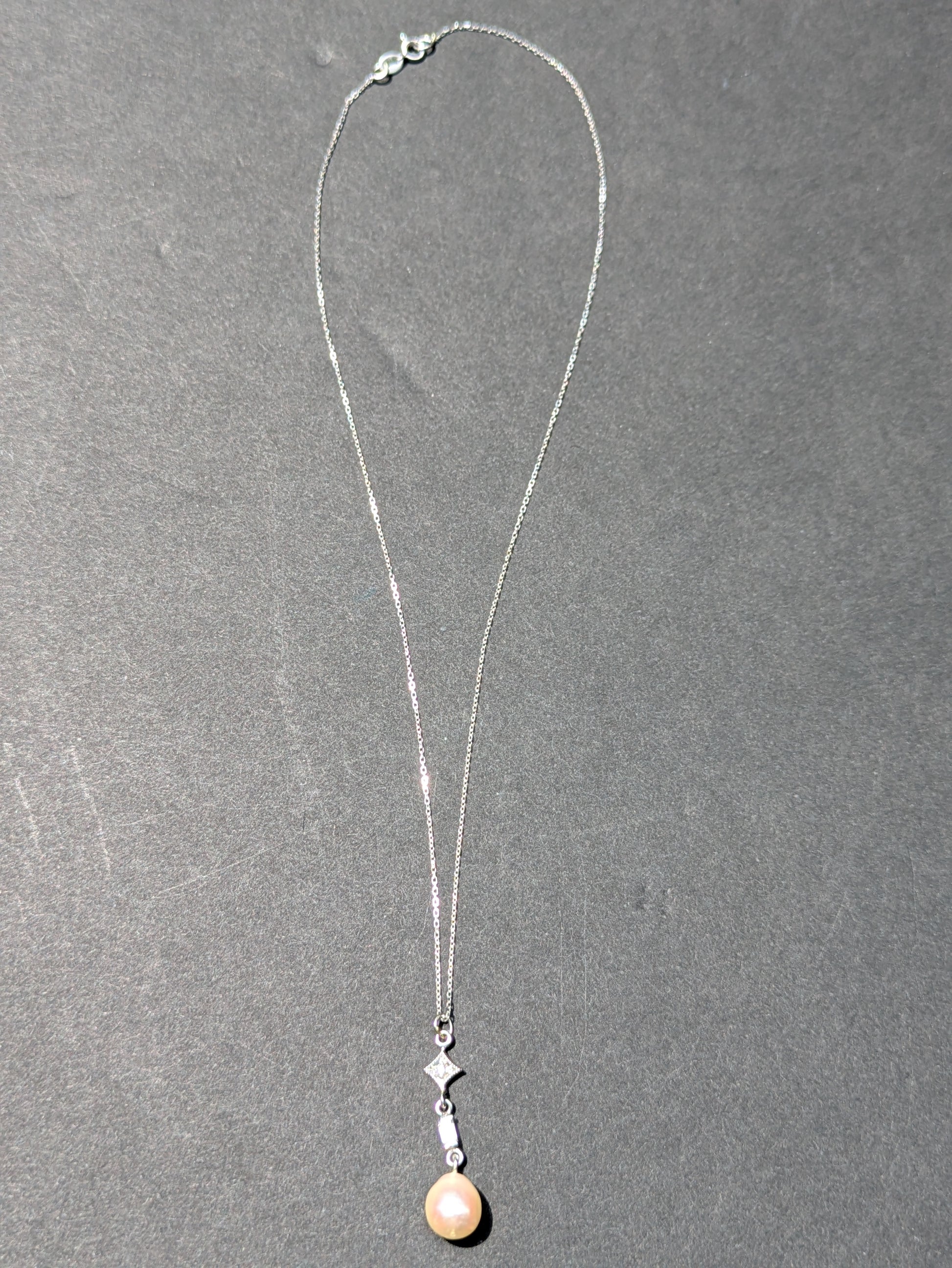 14K 1920's white gold diamond and pearl necklace