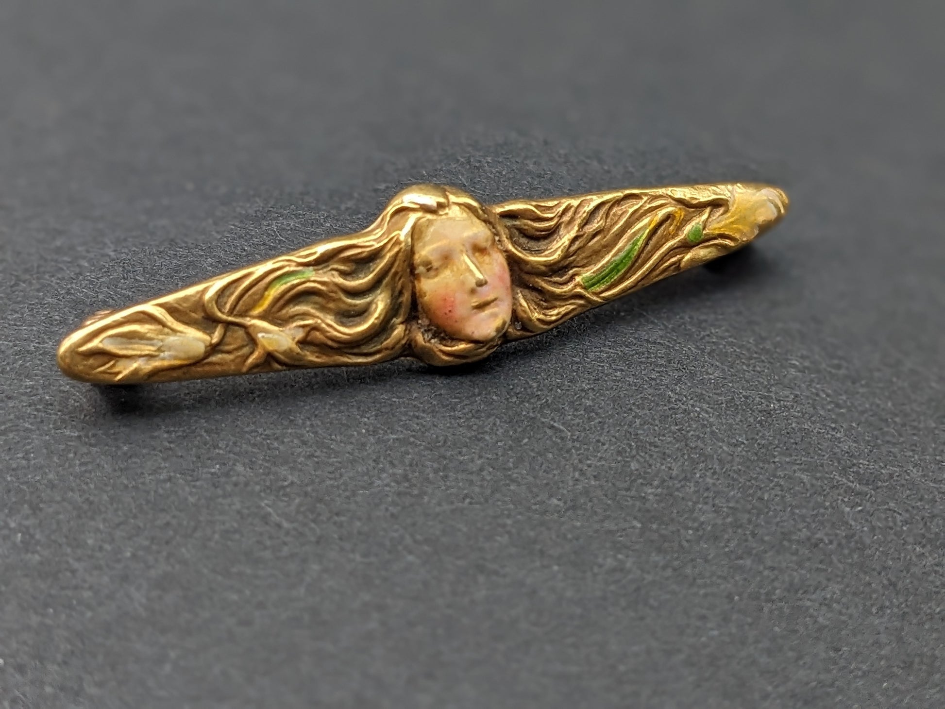14K Art Nouveau Brooch 14K Enamel Lady with Hair