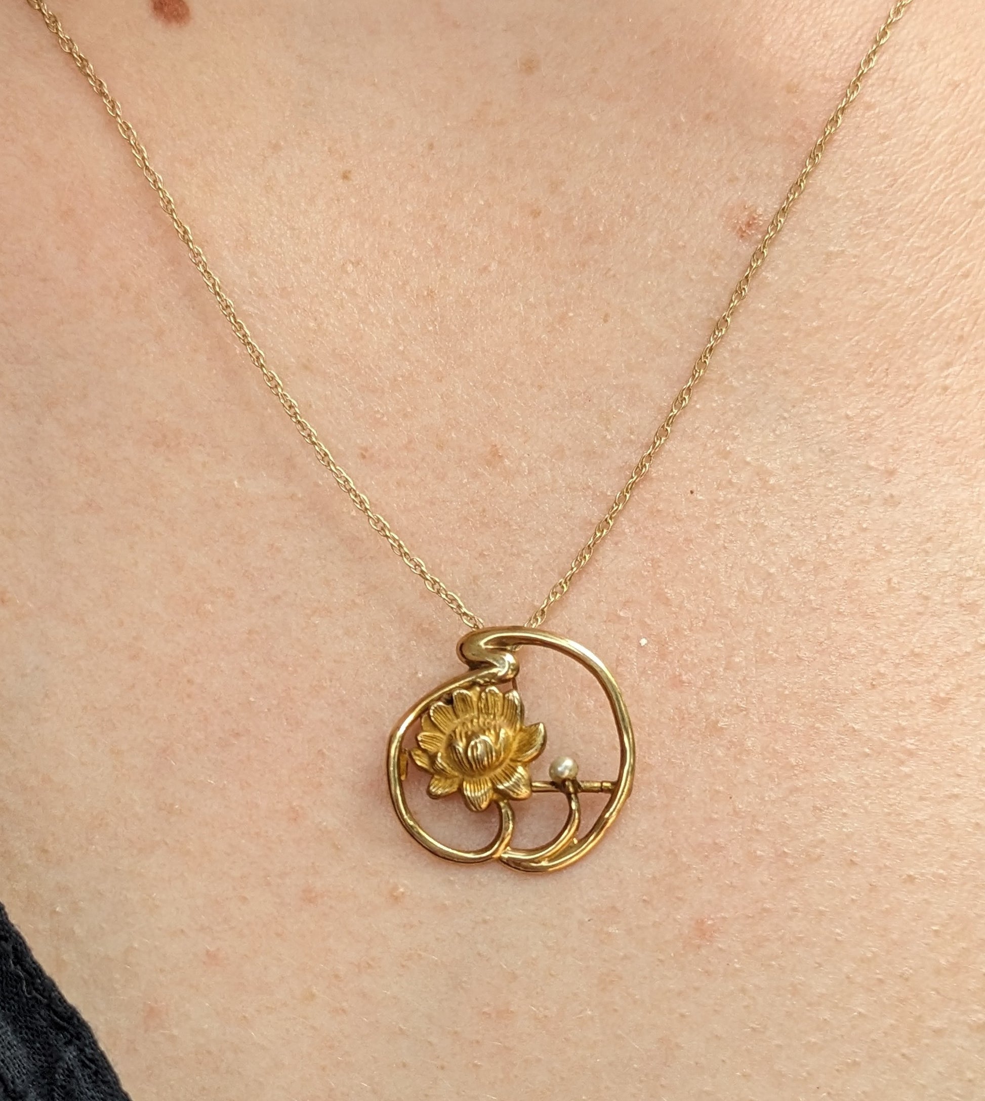 14K Art Nouveau Pearl Lotus Brooch on Chain