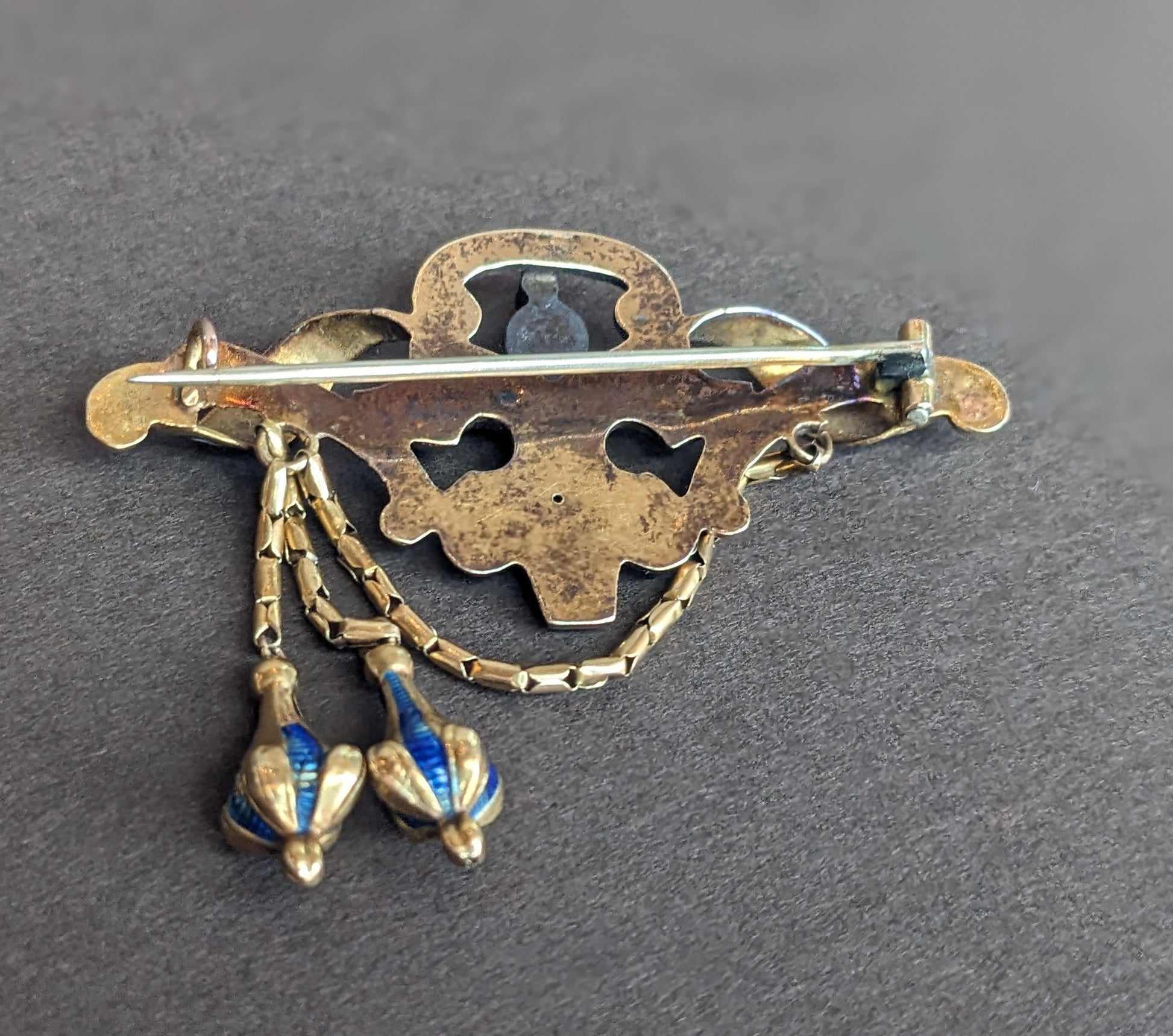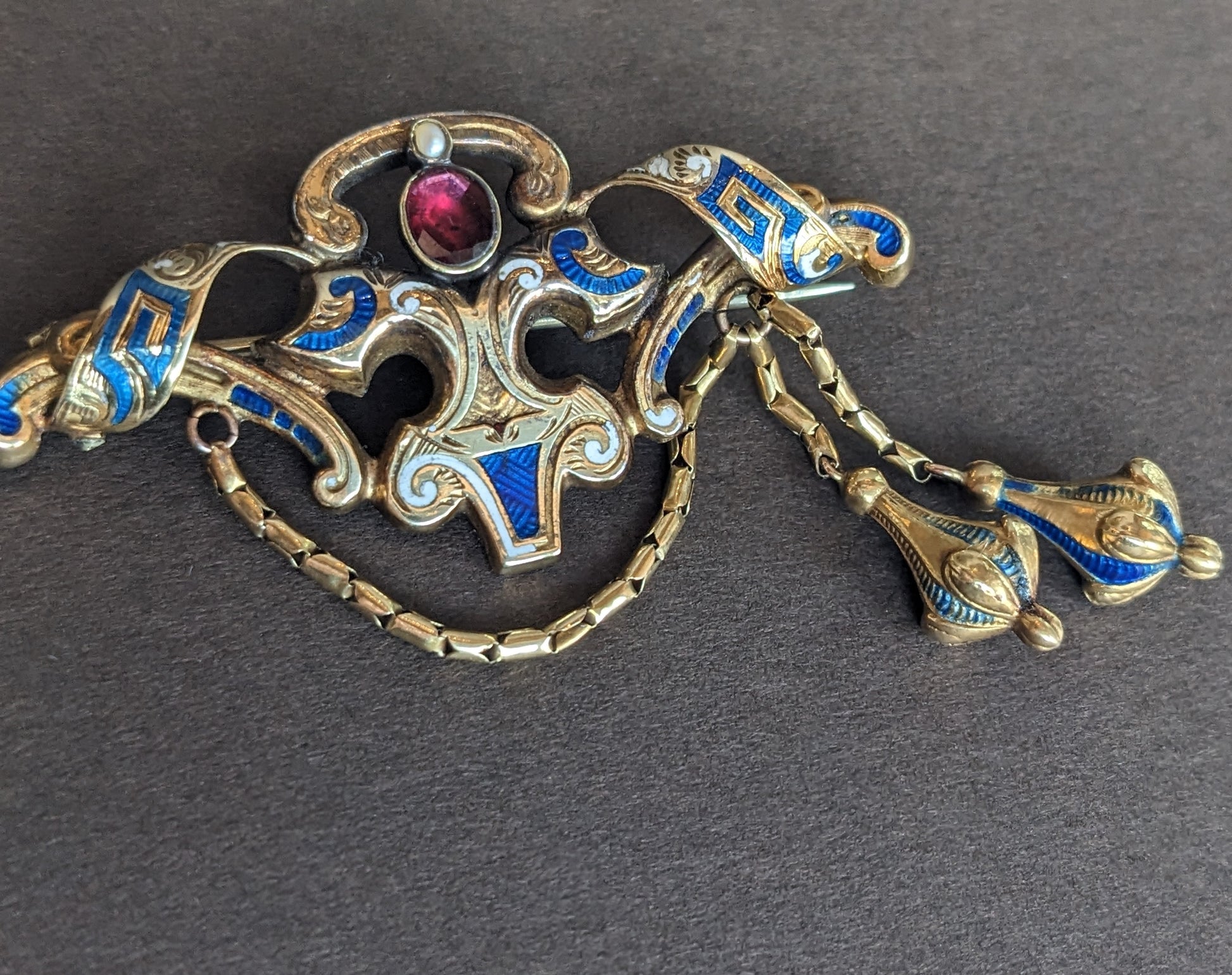 14k Gold, Blue and White Enamel Brooch with Foil Backed Garnet Stone