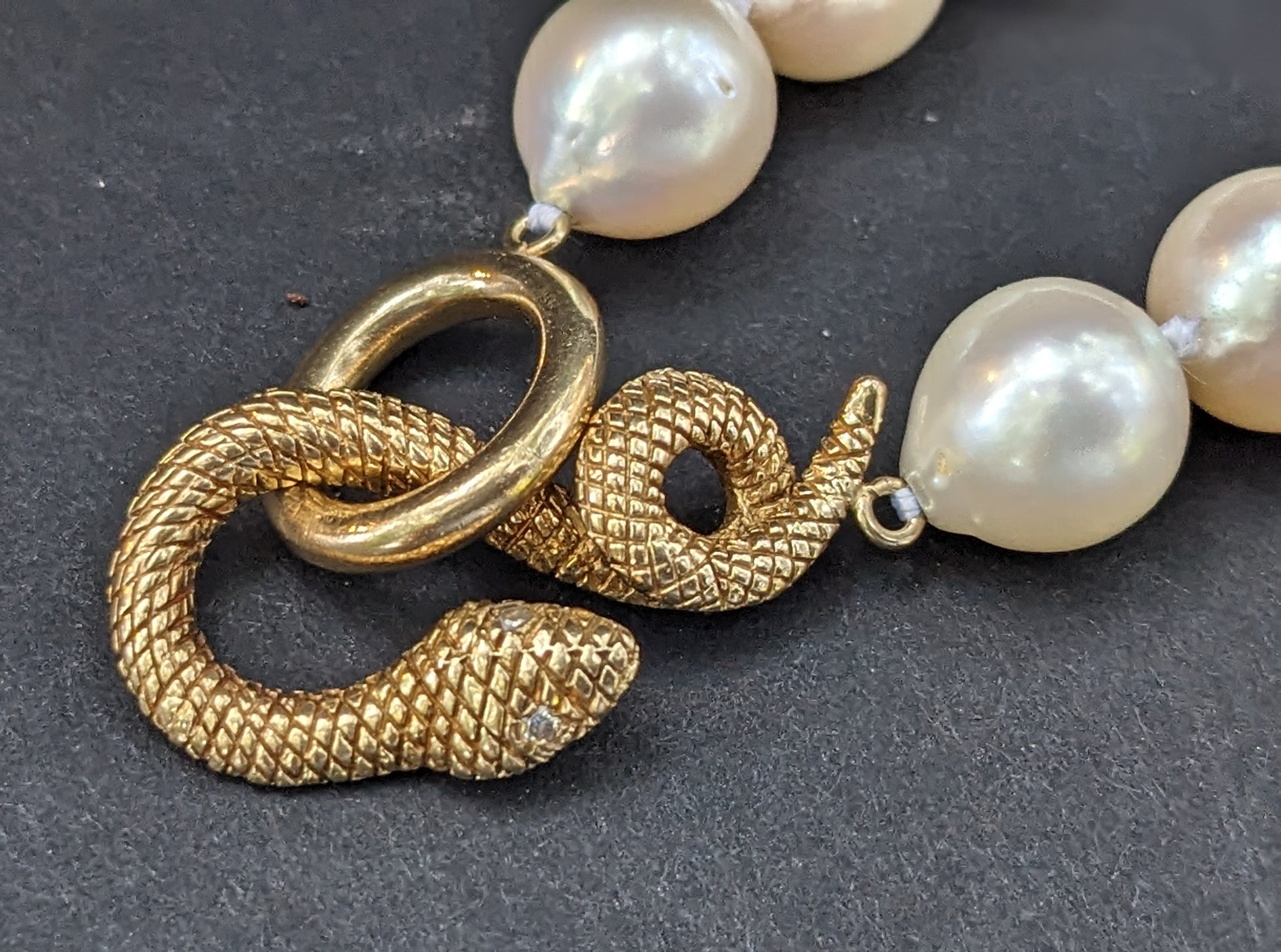 14k Gold, Diamond, and Pearl Necklace with snake clasp