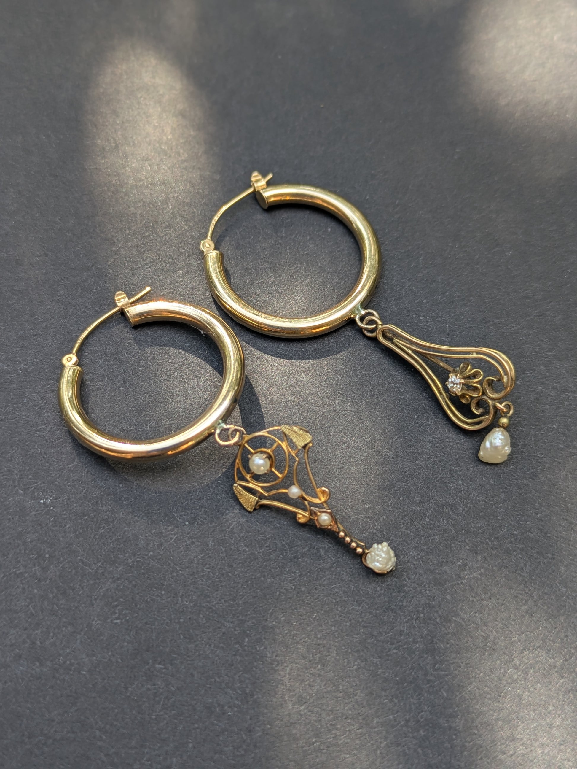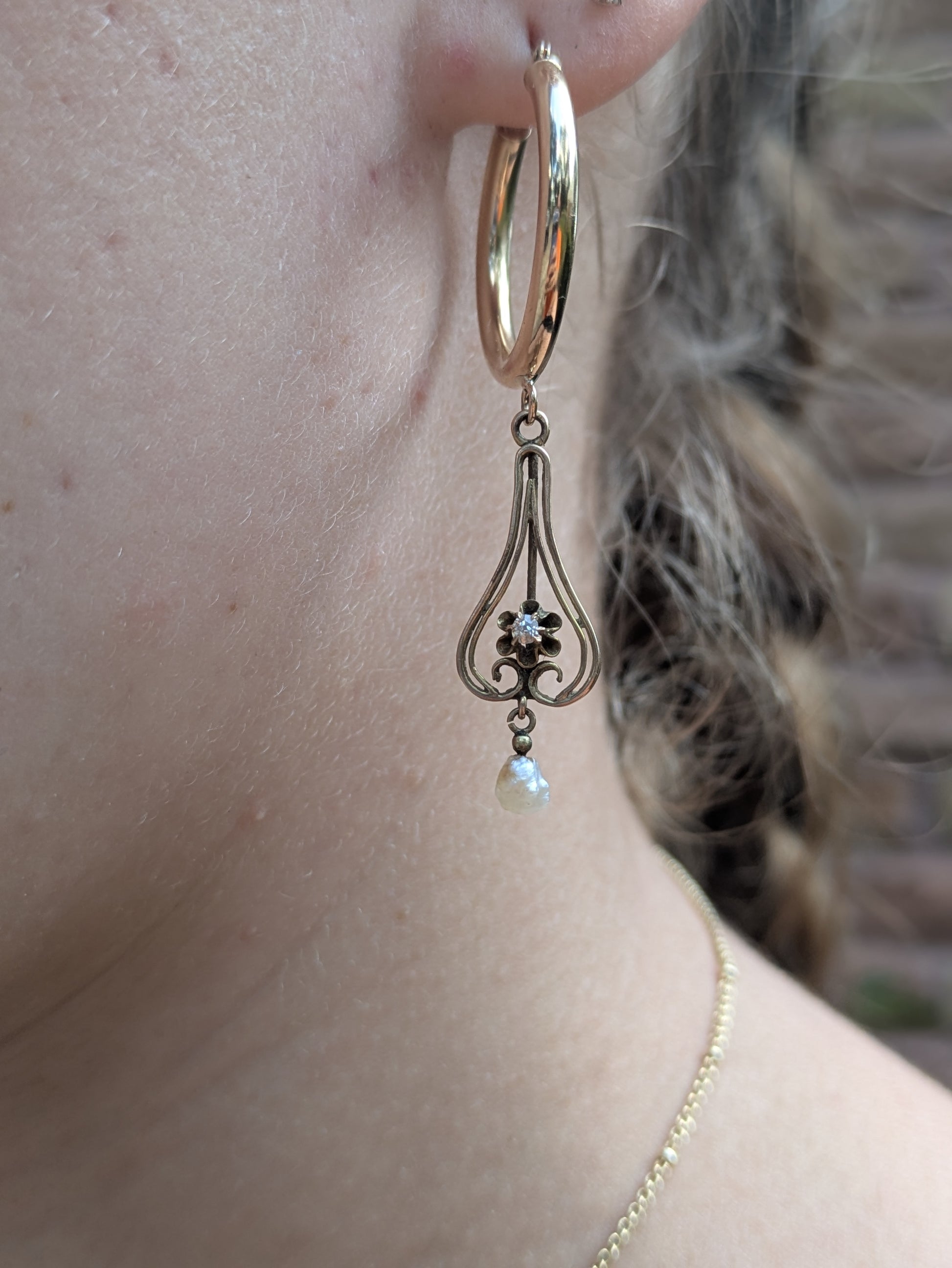 14k Hoop Earrings with Art Nouveau Diamond and Pearl Lavelier
