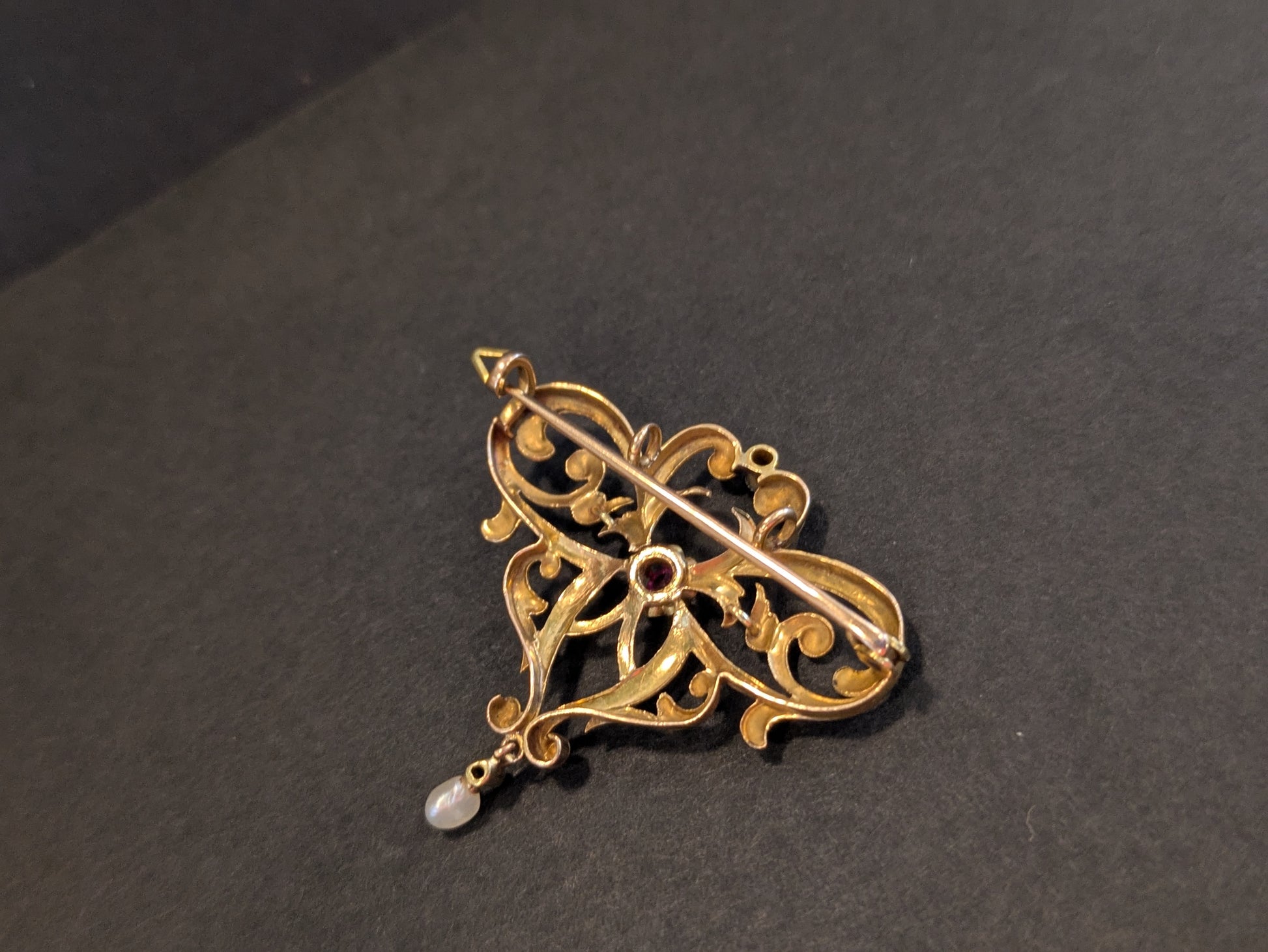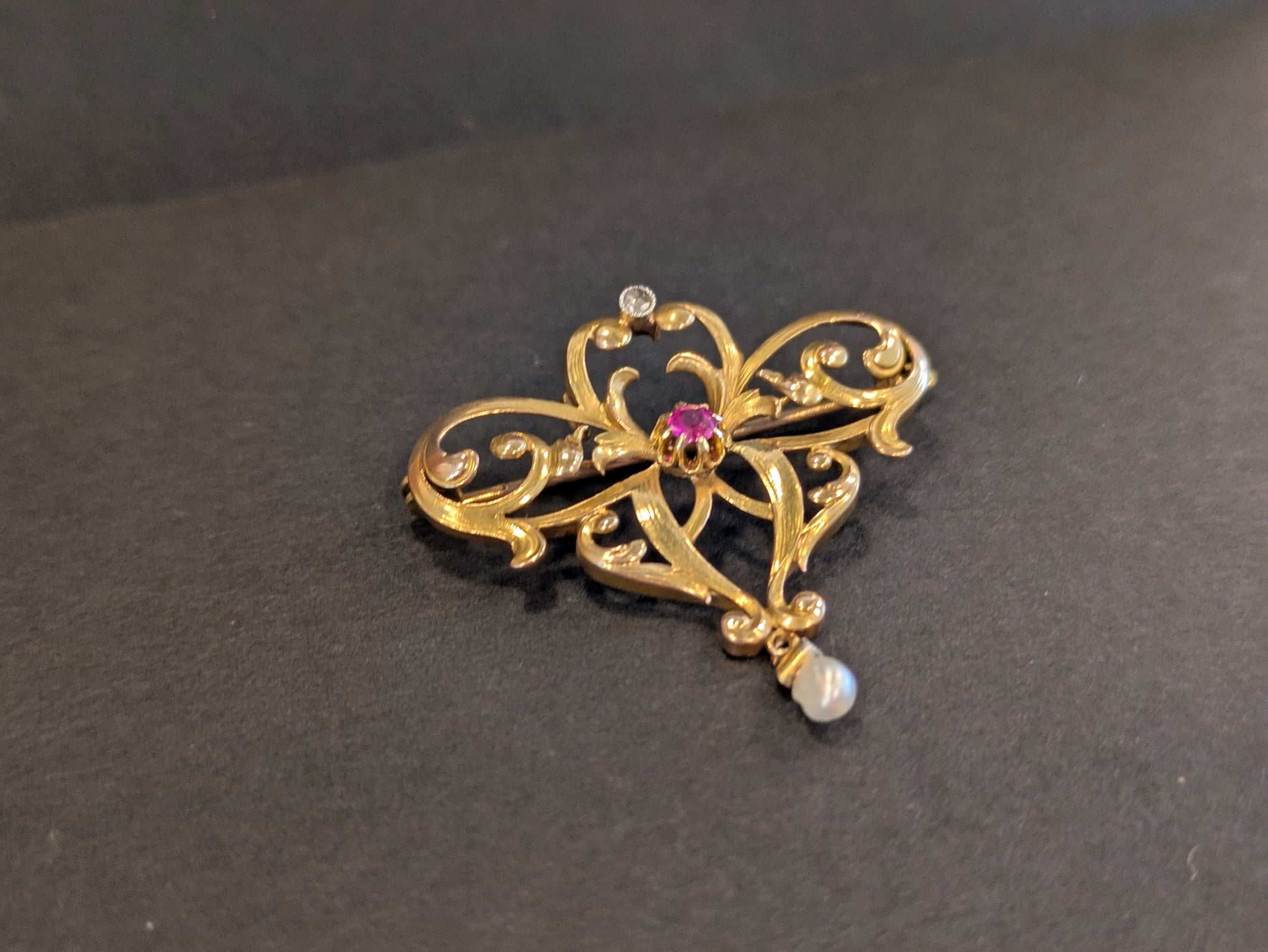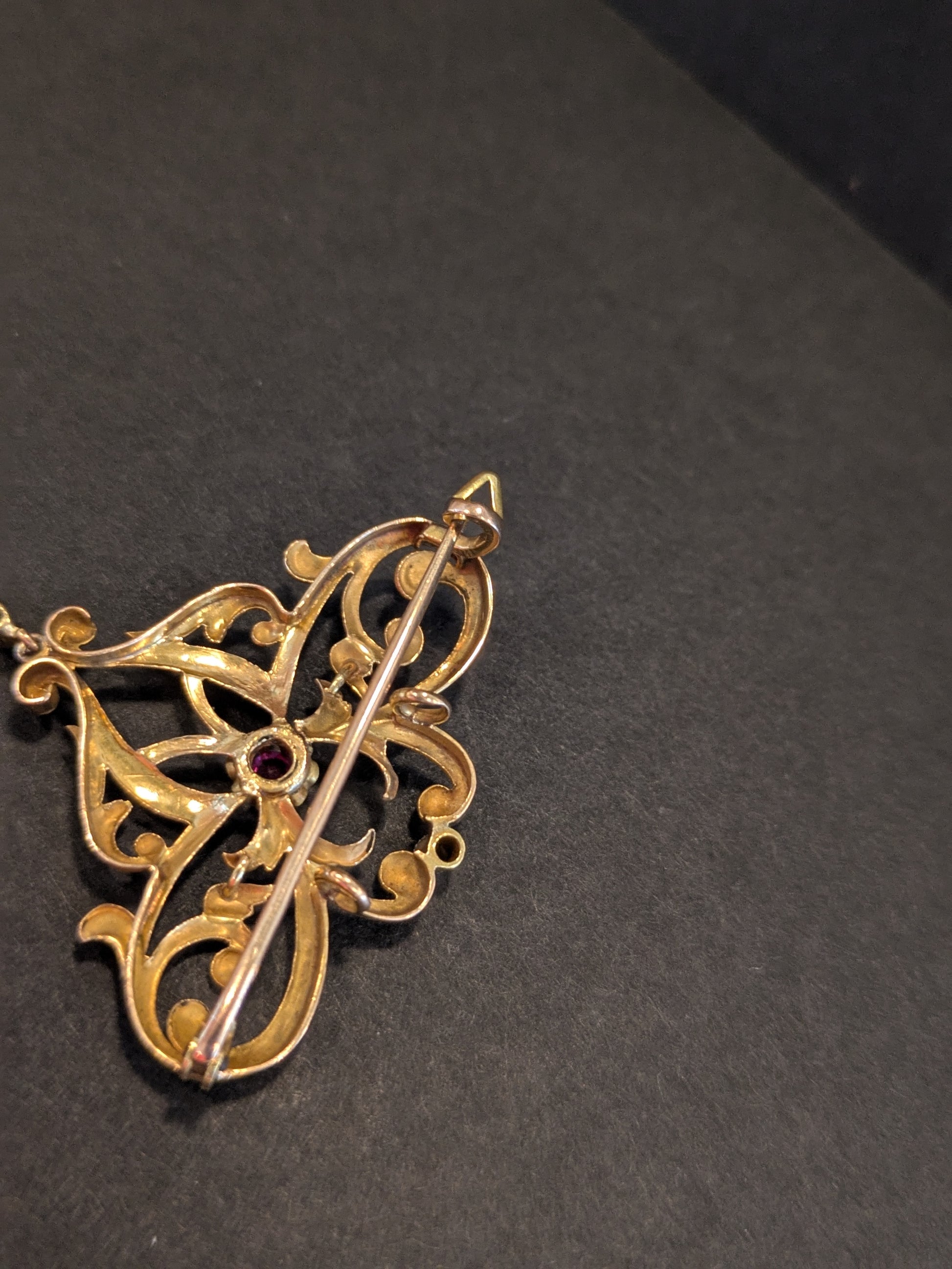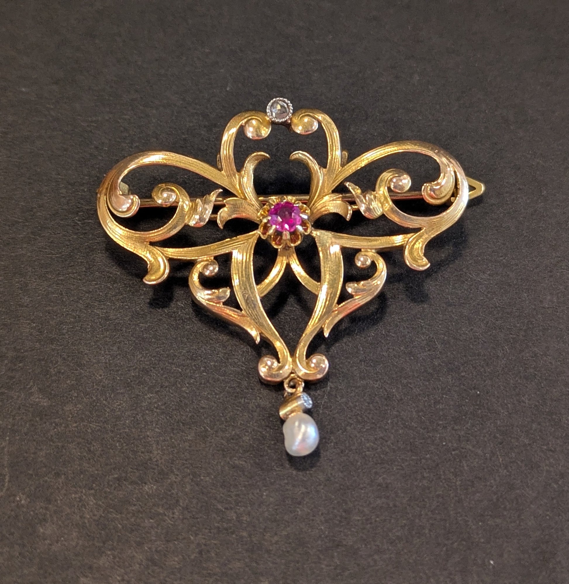 14k Jugendstil Brooch and Pendant with Pearl Diamond and Ruby