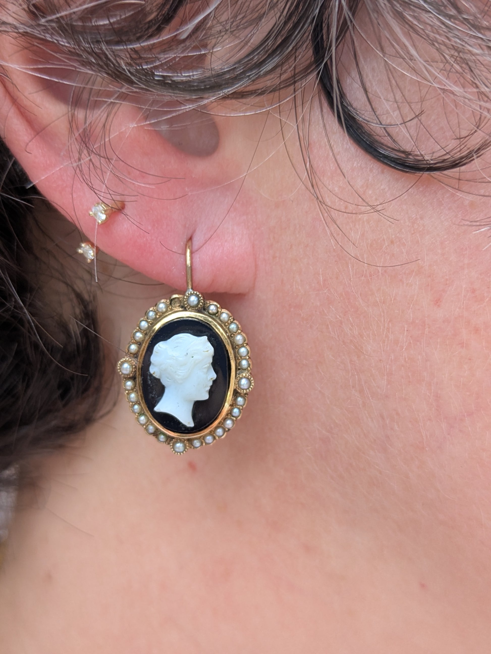 14k Onyx Cameo Conversion Earrings with Pearl and Shepherd Hooks