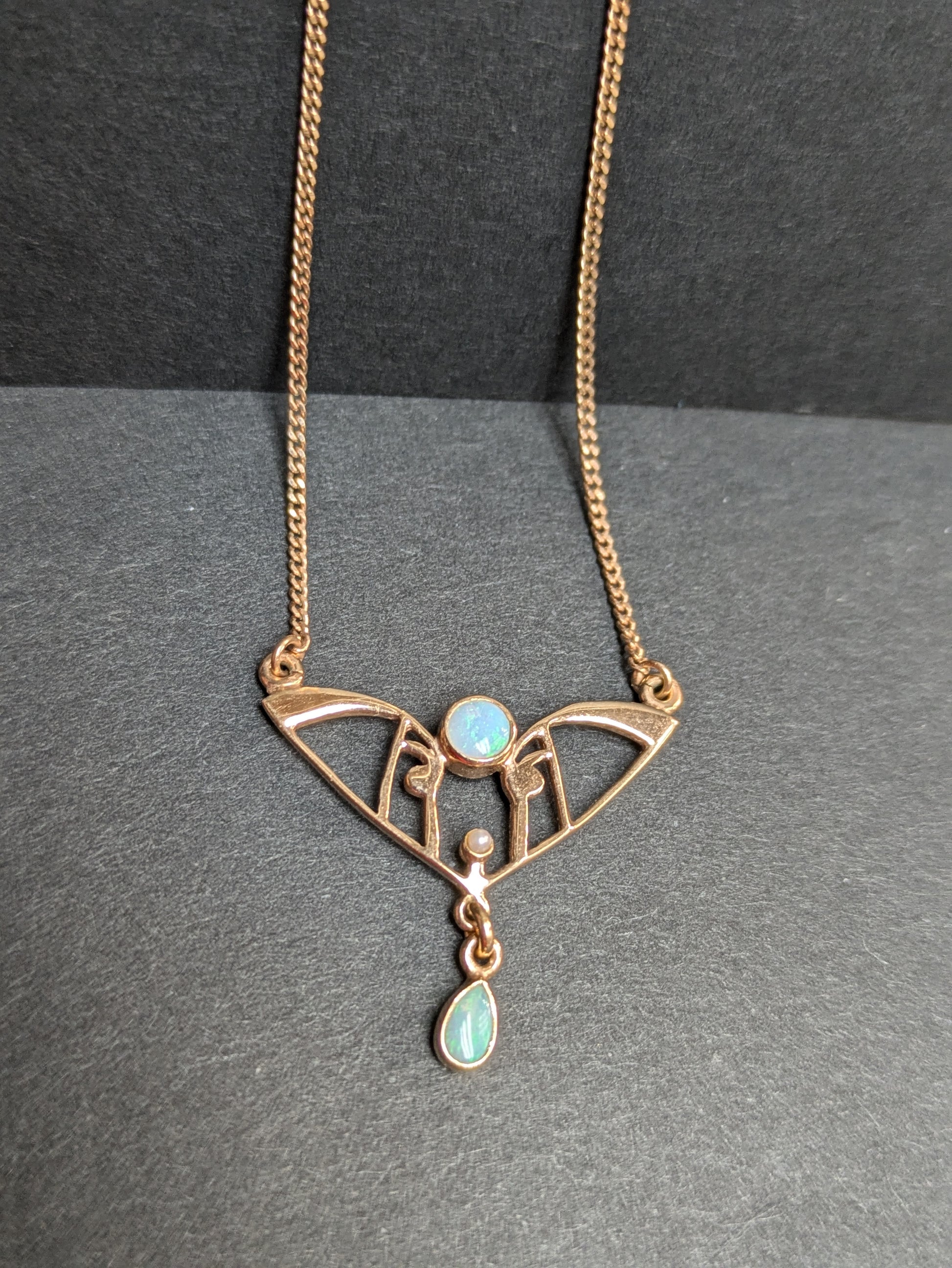 14k Arts and Crafts Opal and Seed Pearl Necklace
