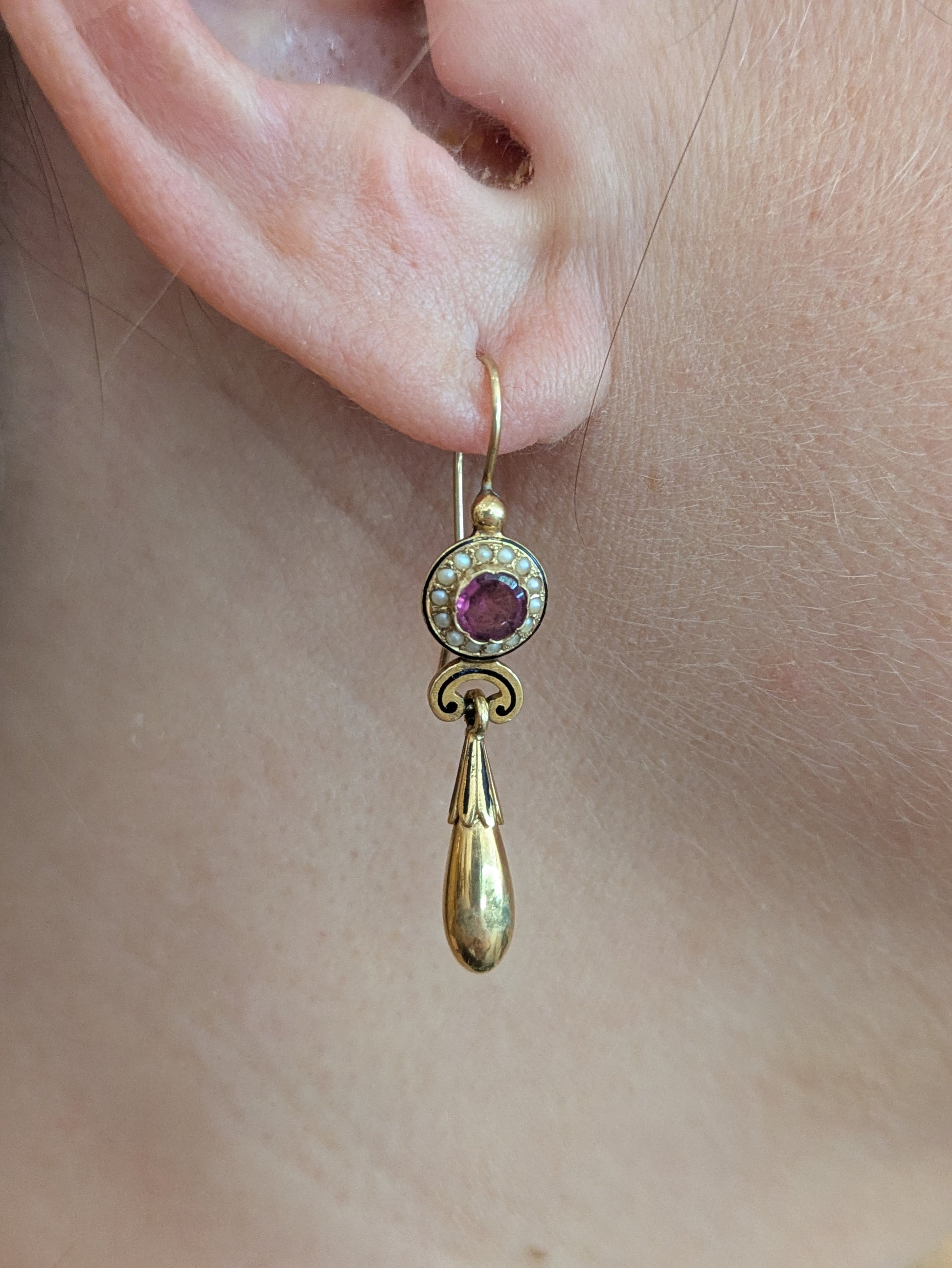 14kt Art Deco Amethyst Seed Pearl Enamel Drop Earring