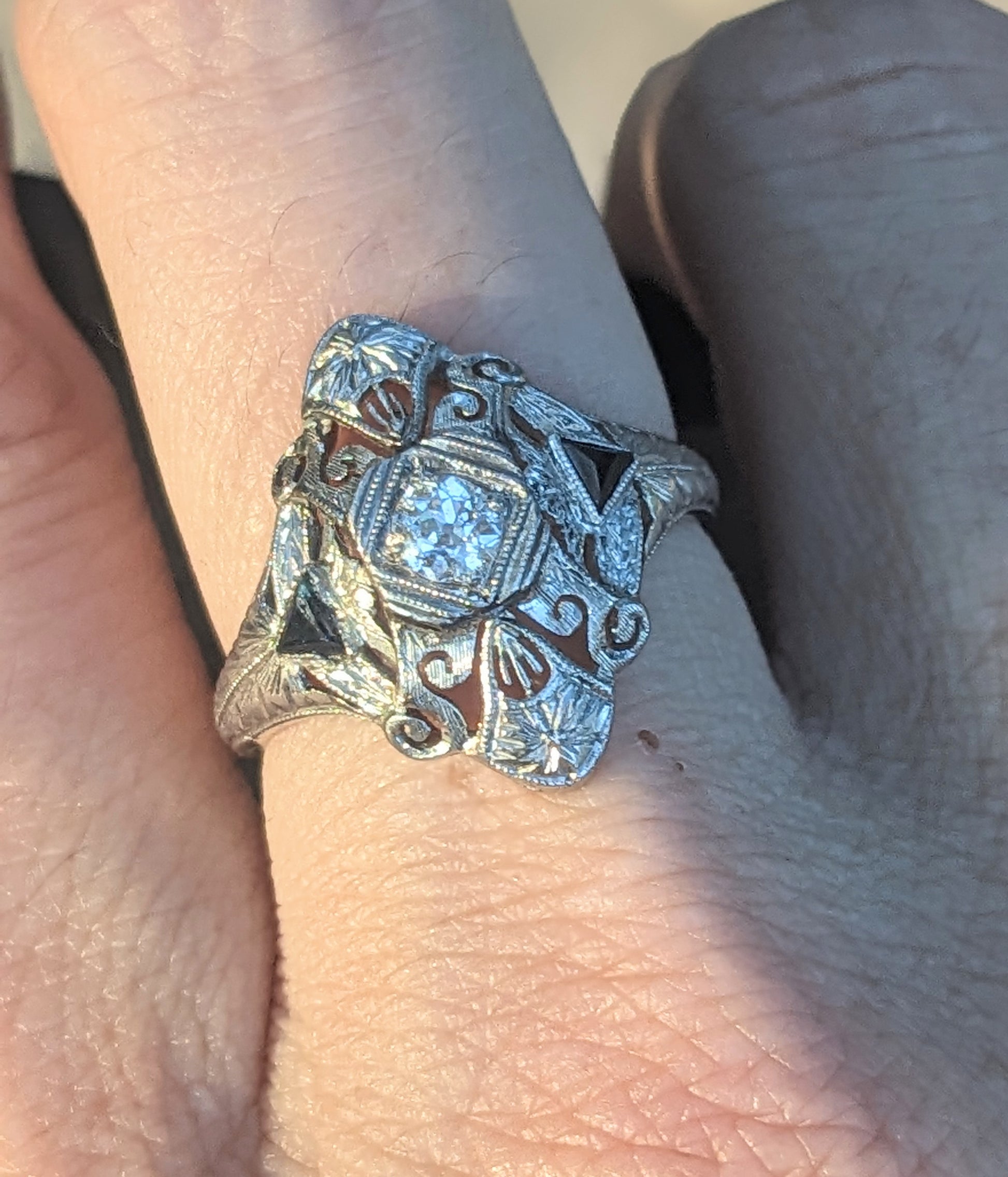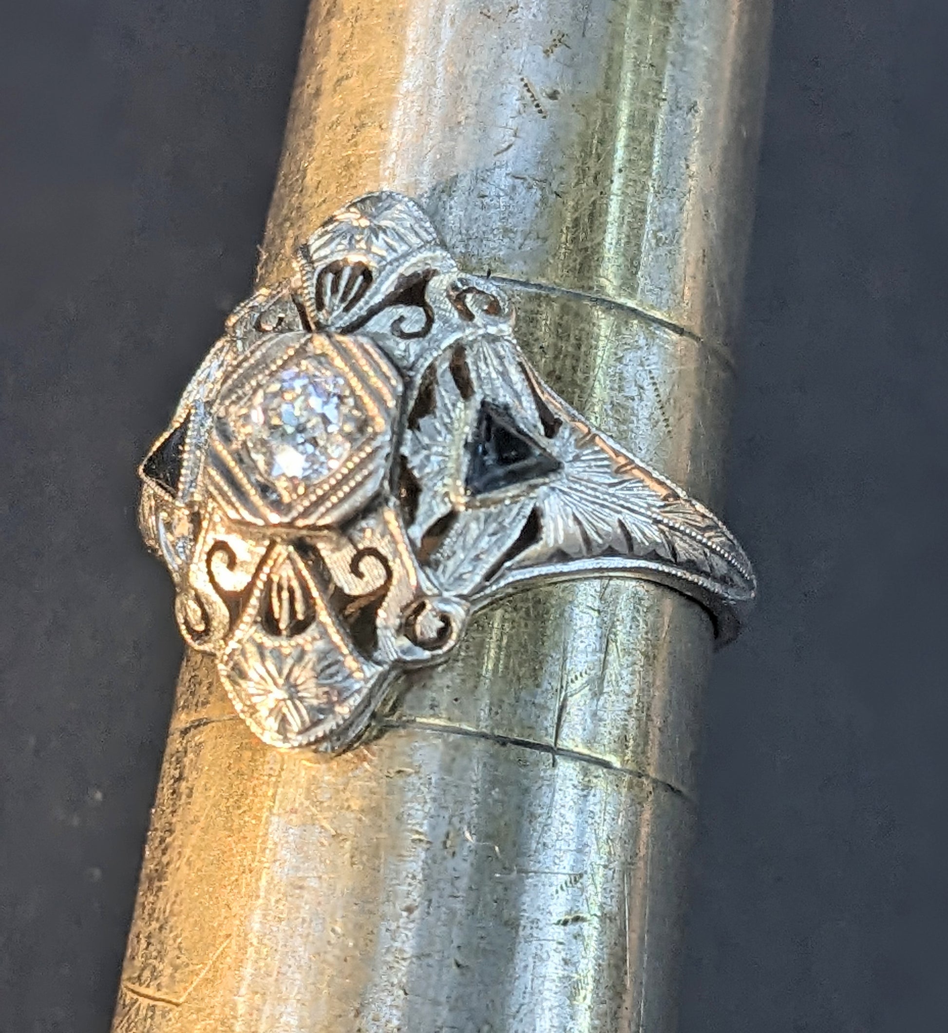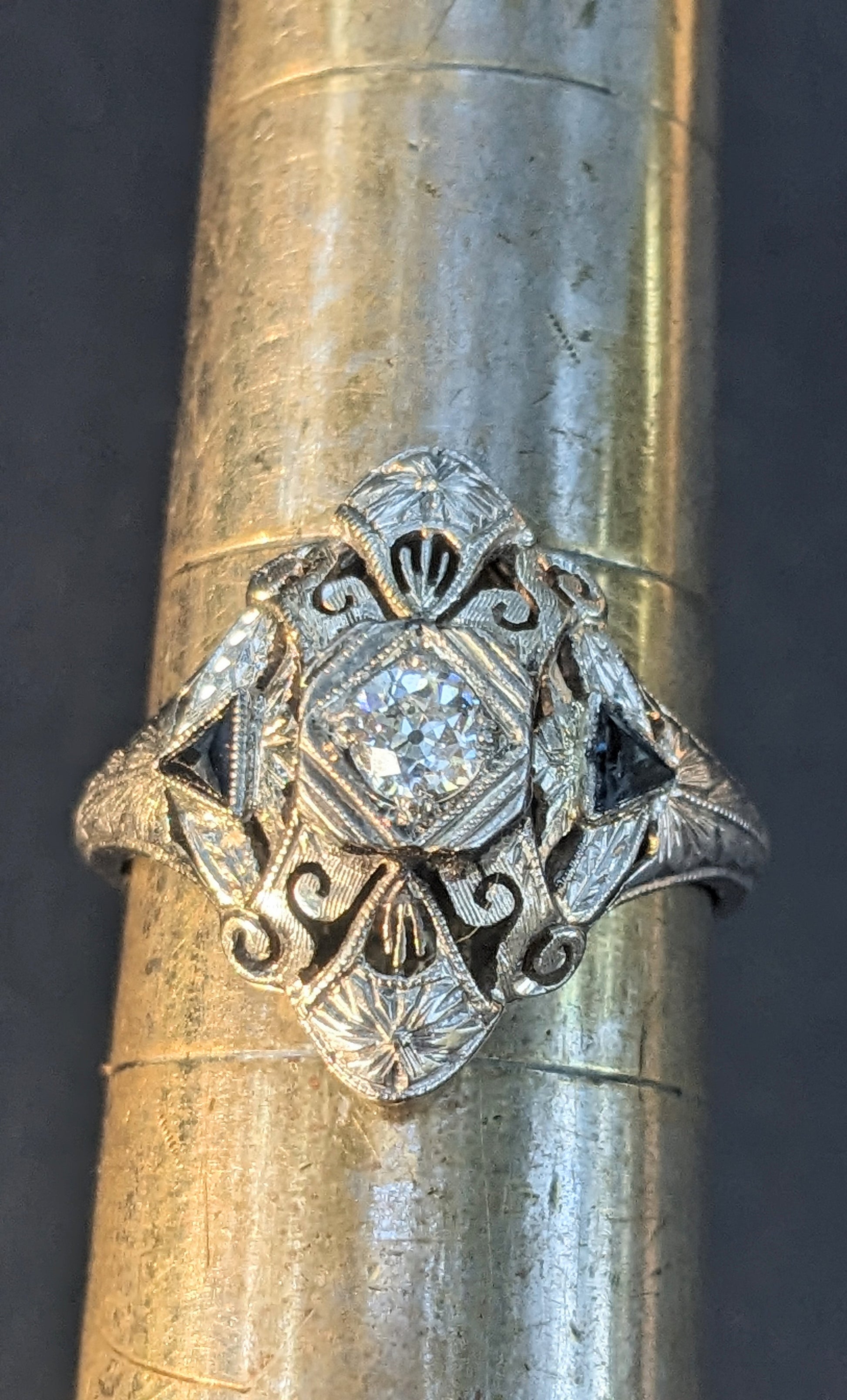 14Kt Art Deco Bridge Ring with Center Diamond and Triangle Sapphires