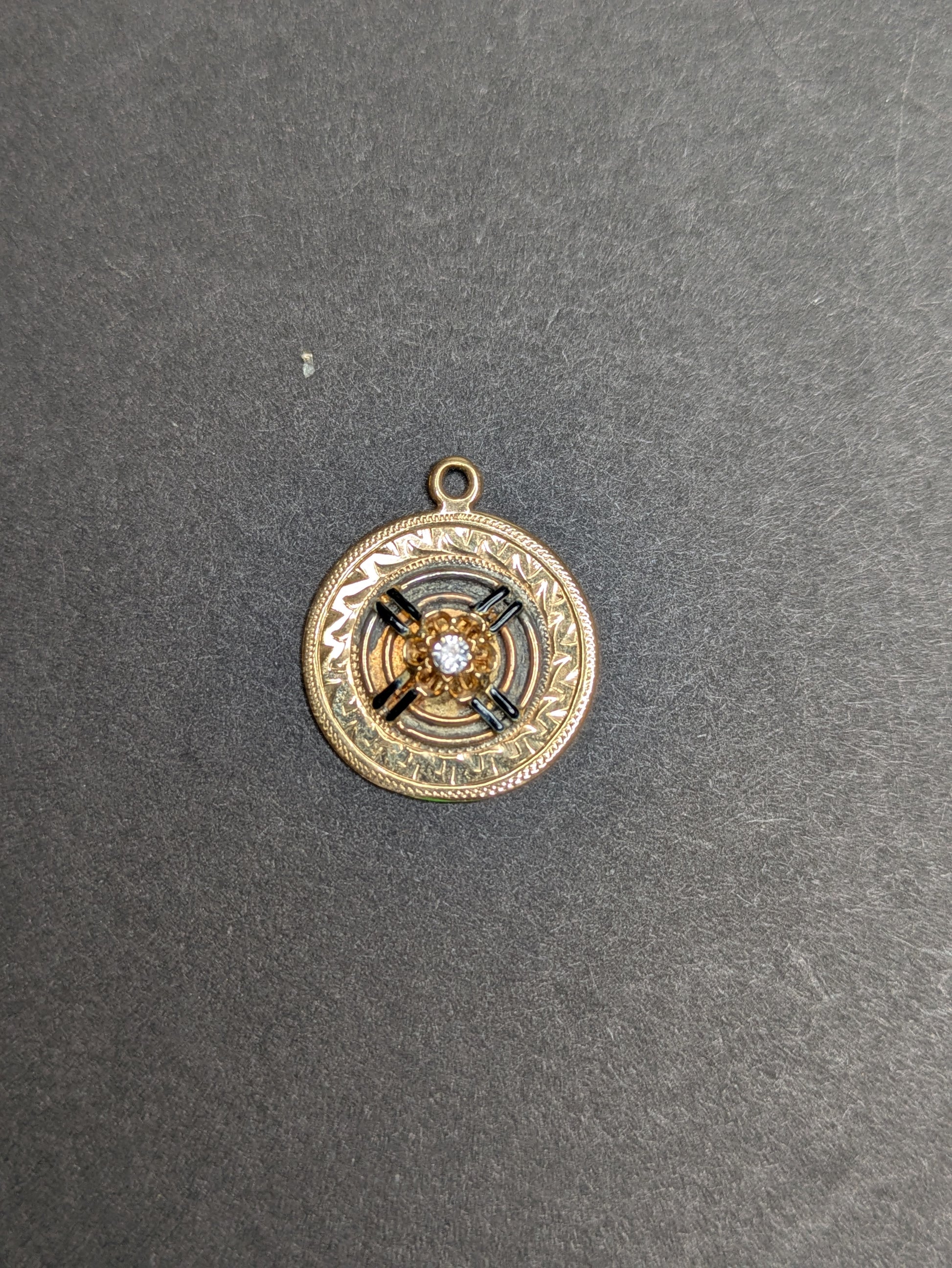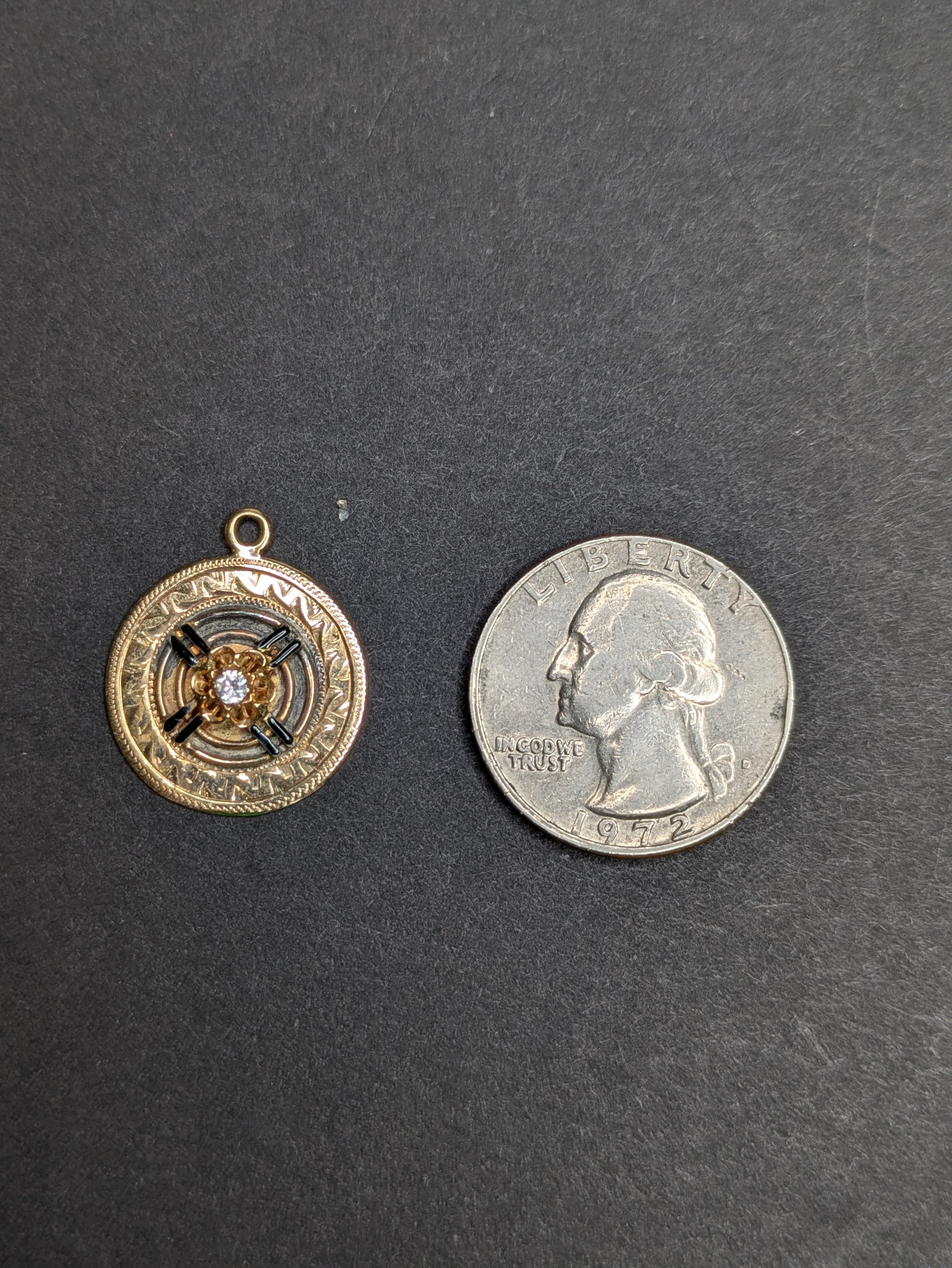 14kt Engraved Disk Charm with added Stick Pin Bull's Eye and Diamond