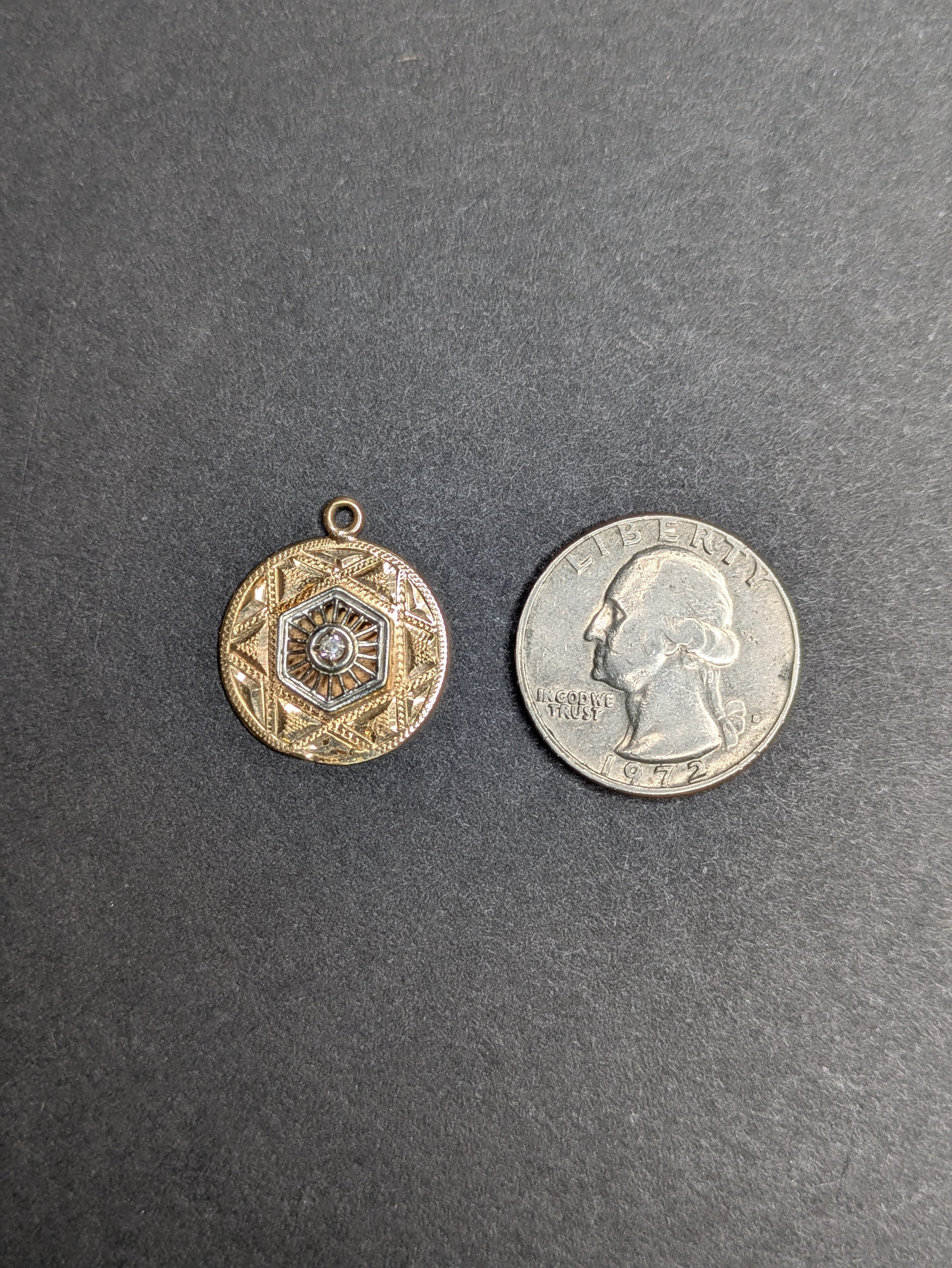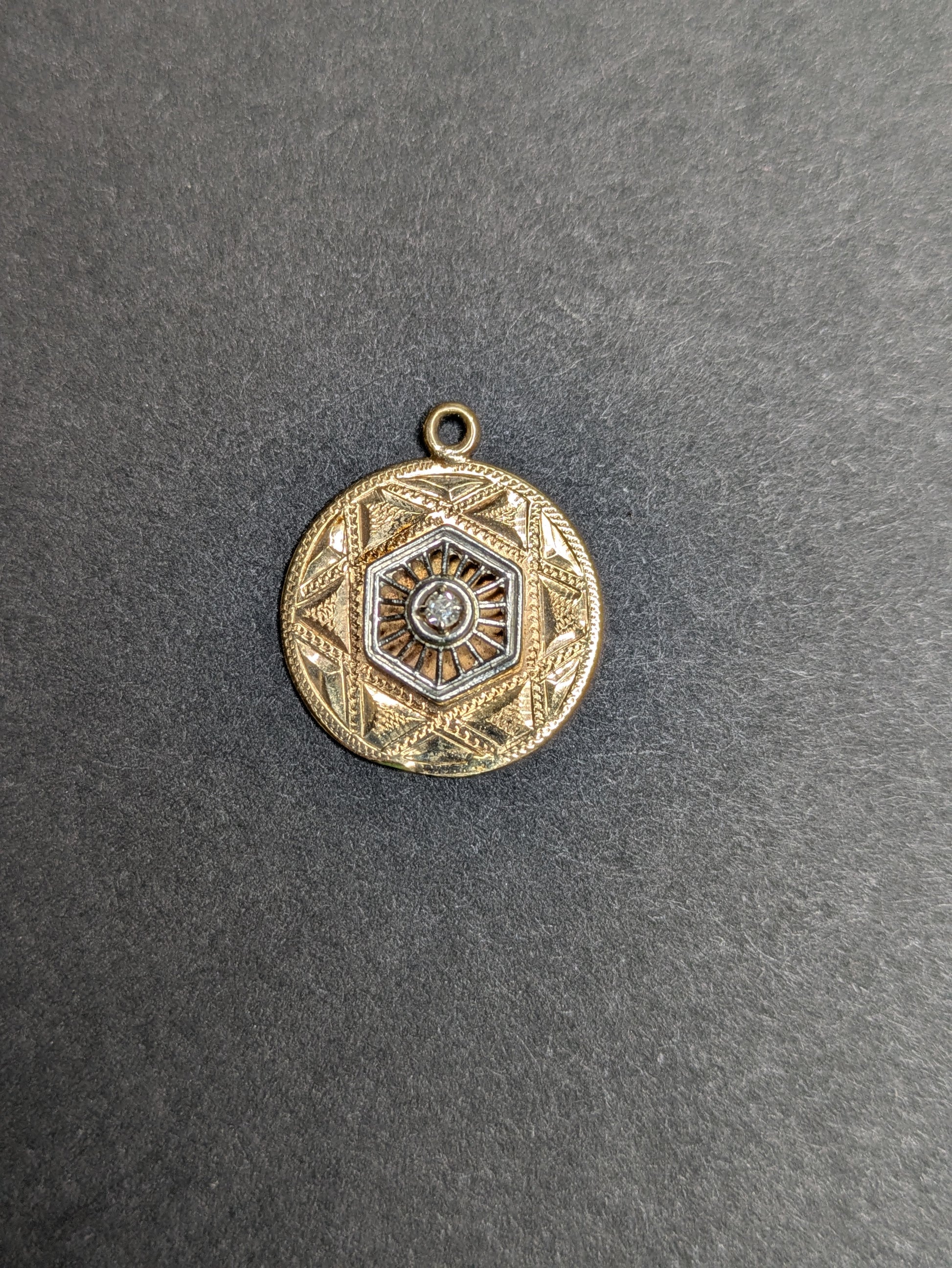 14kt Engraved Disk Charm with added Stick Pin Hexagon and Diamond