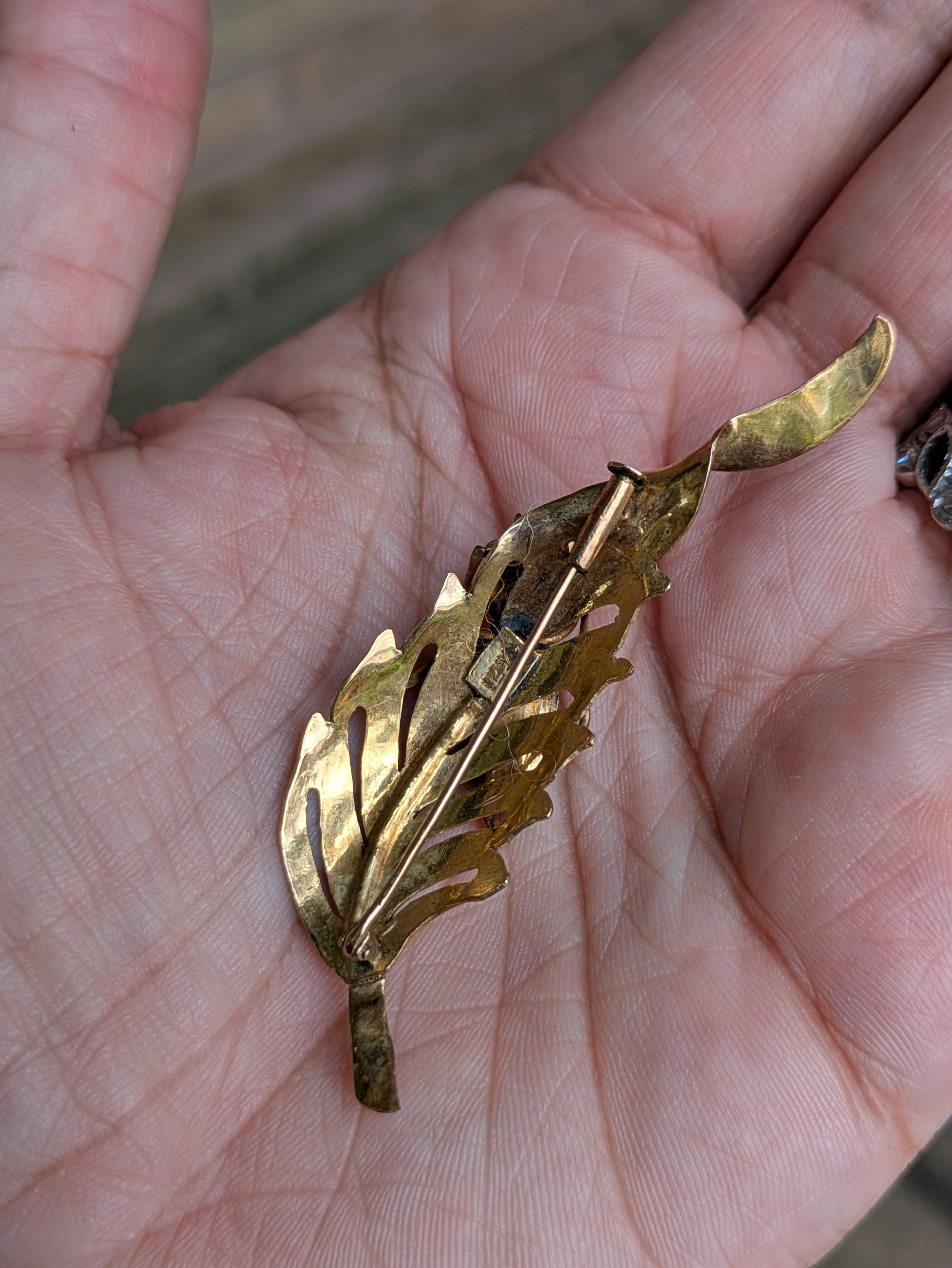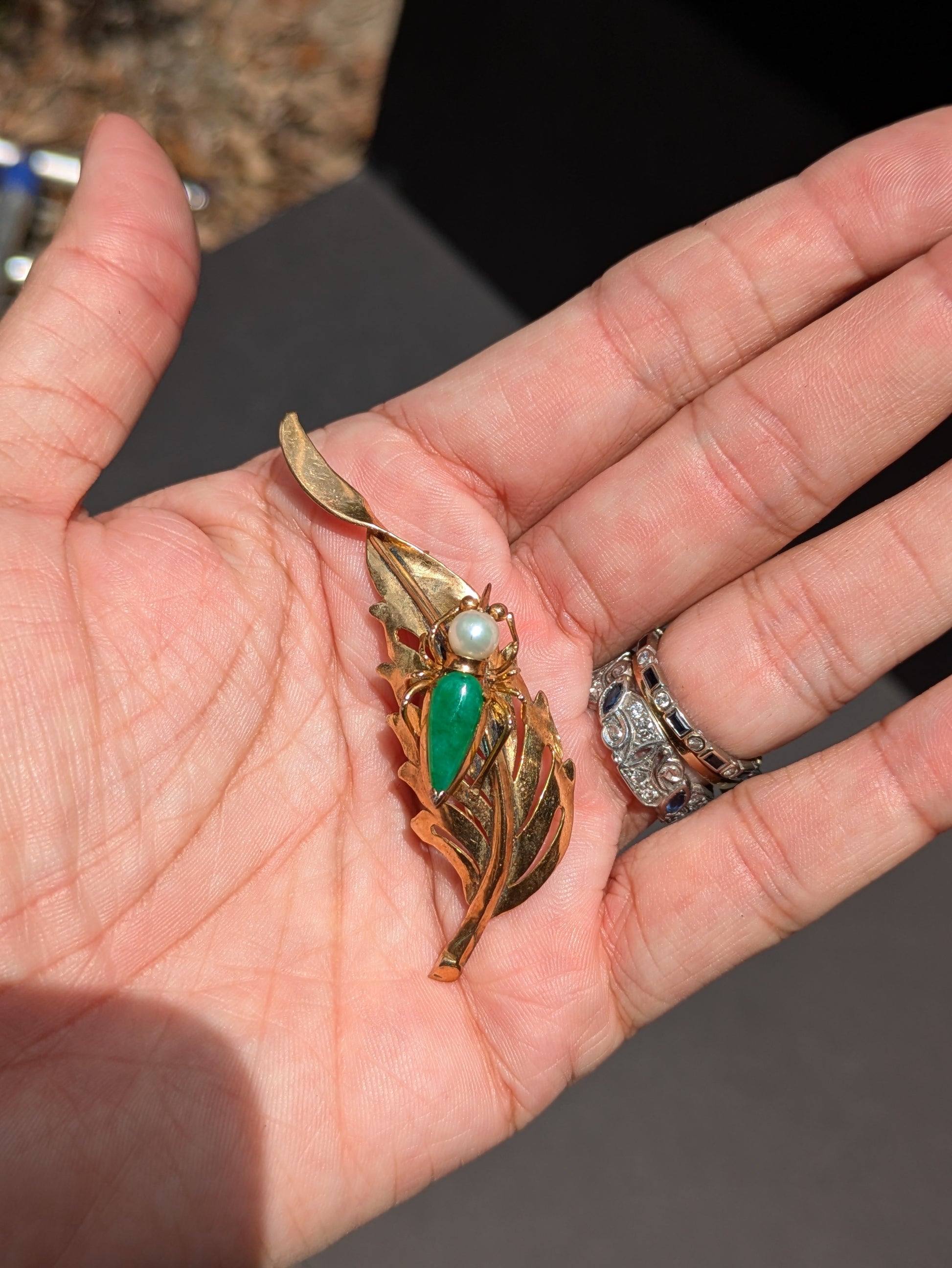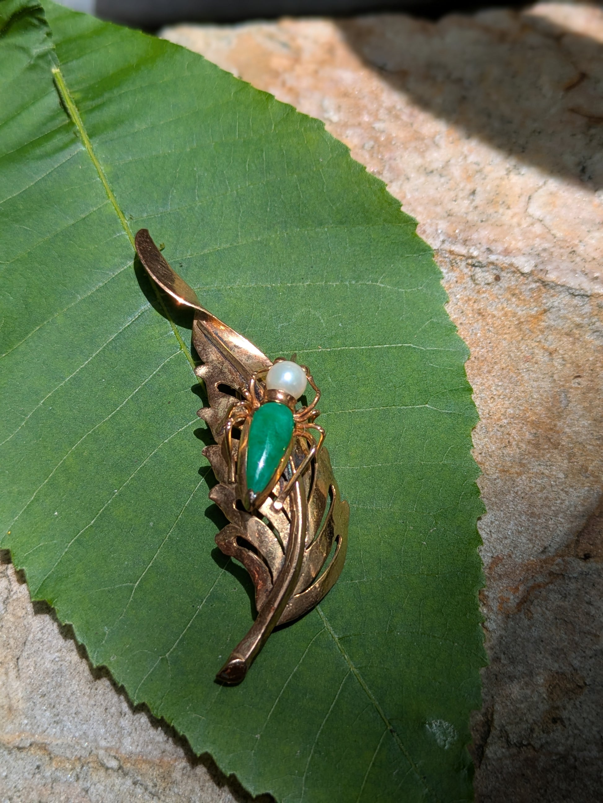14kt Jade and Pearl Grasshoper on Leaf Brooch
