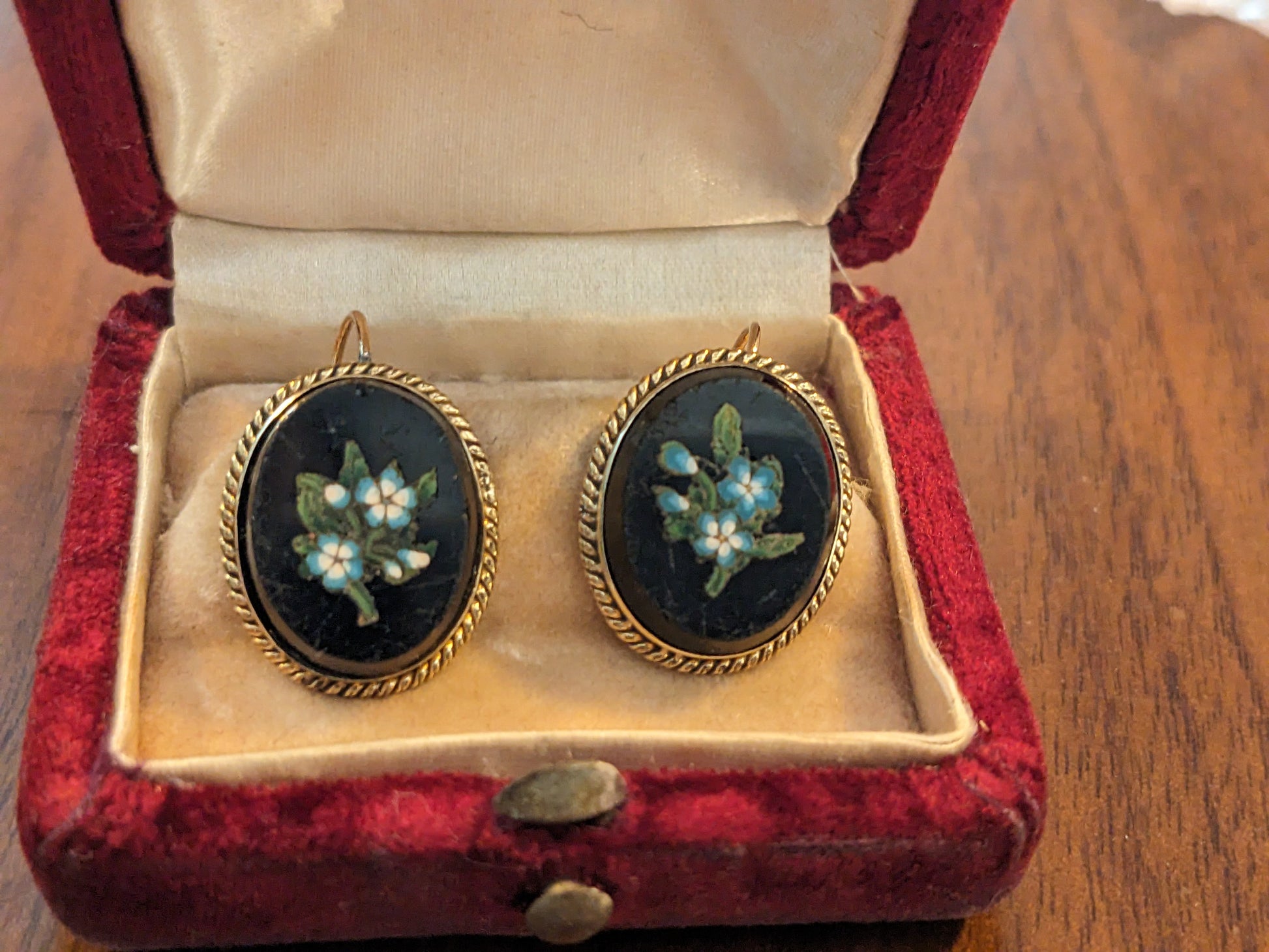 14k Pietra Dura Leverback Earrings Blue Floral Motif