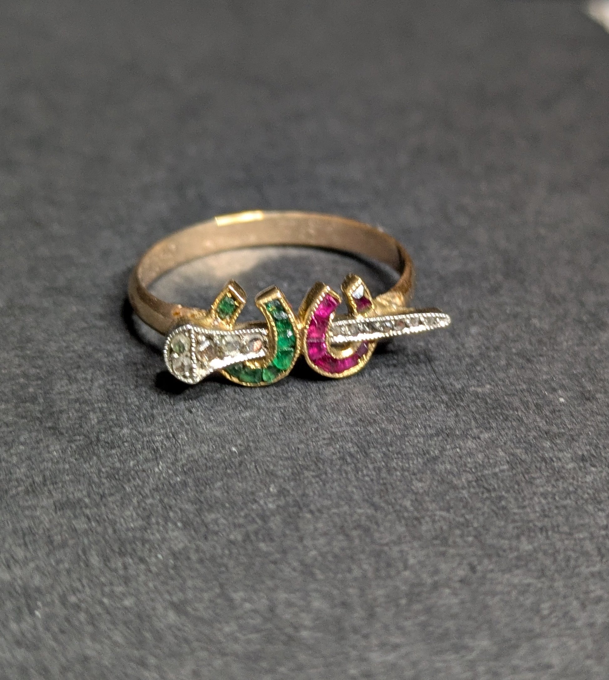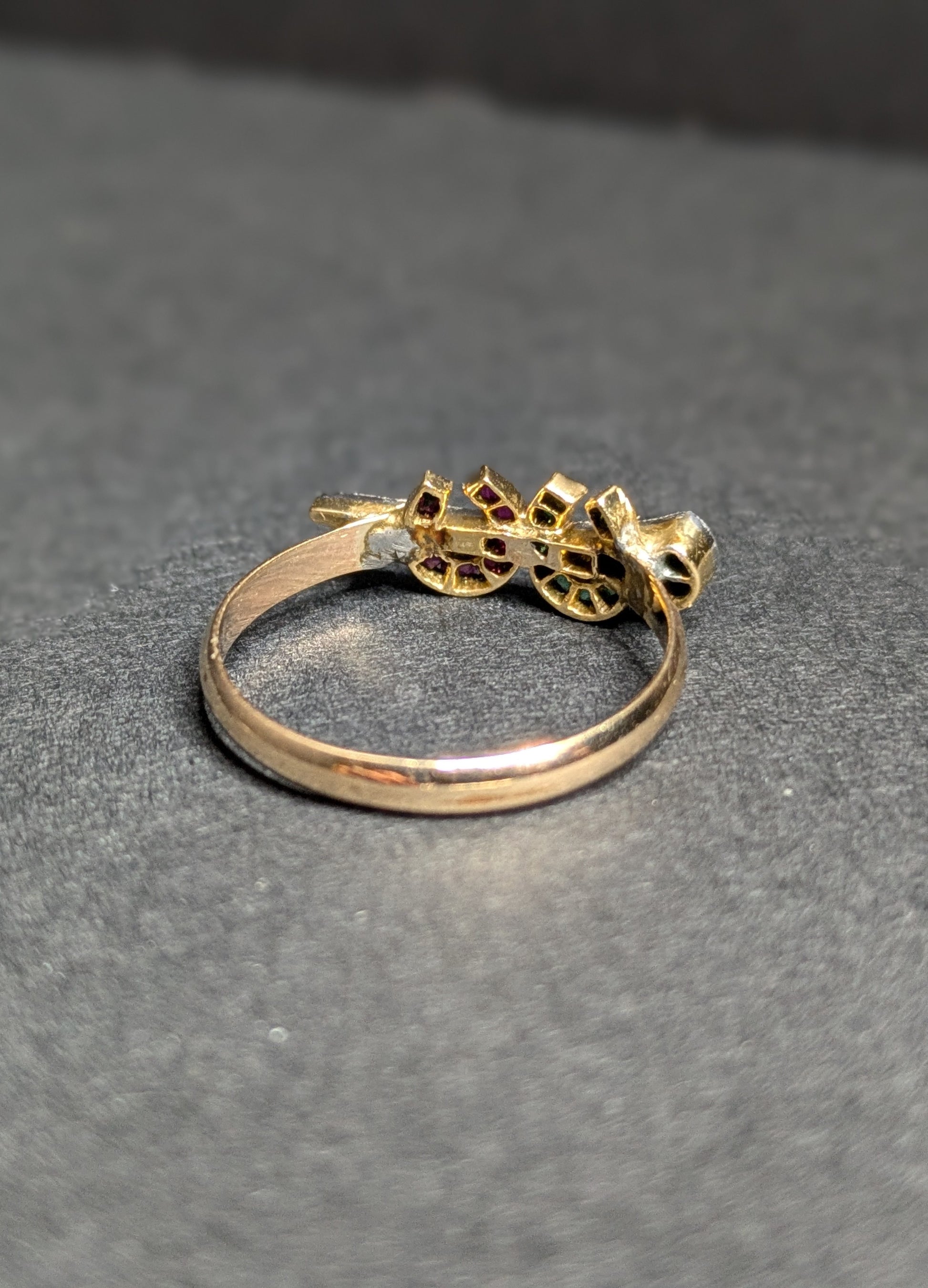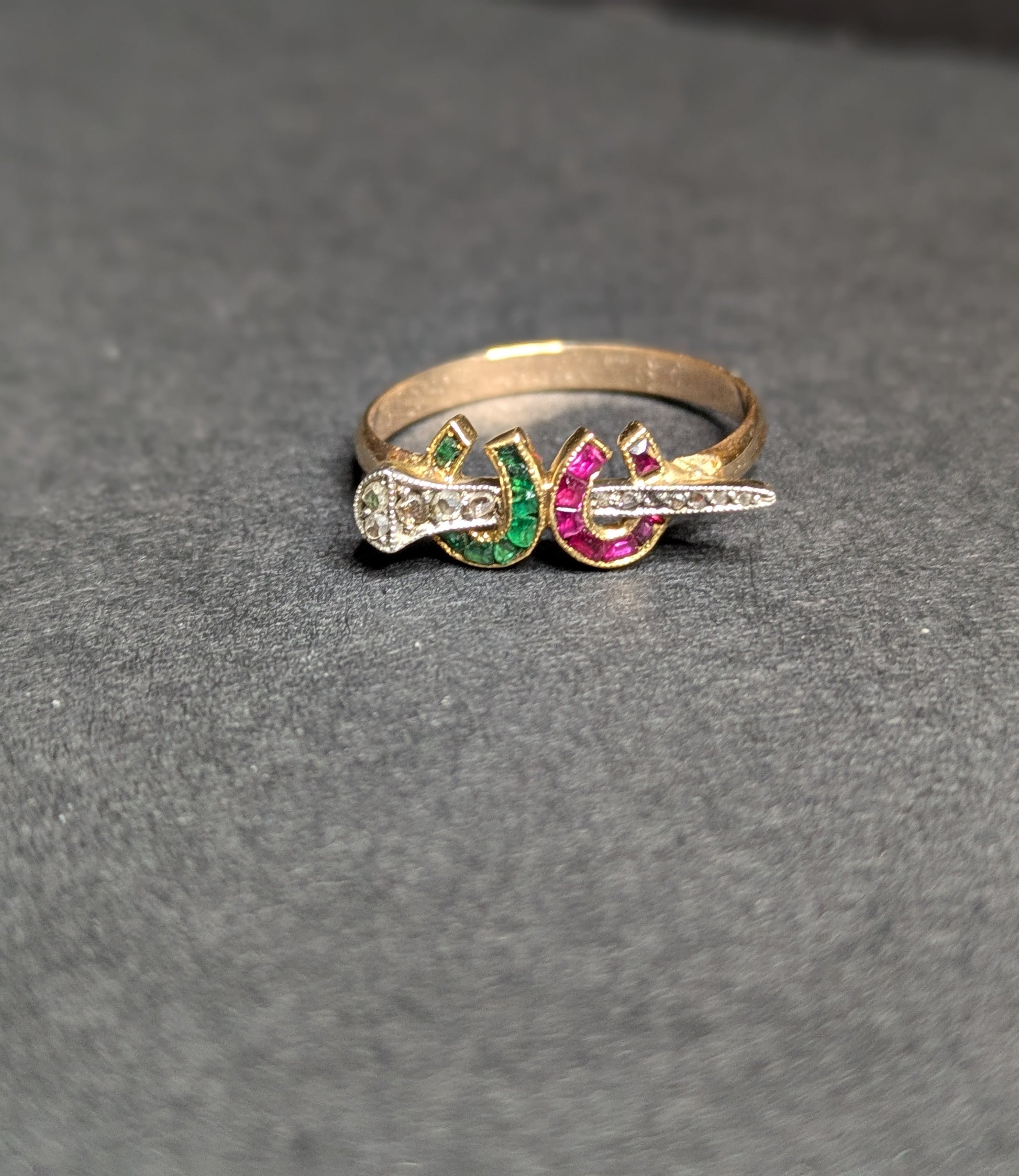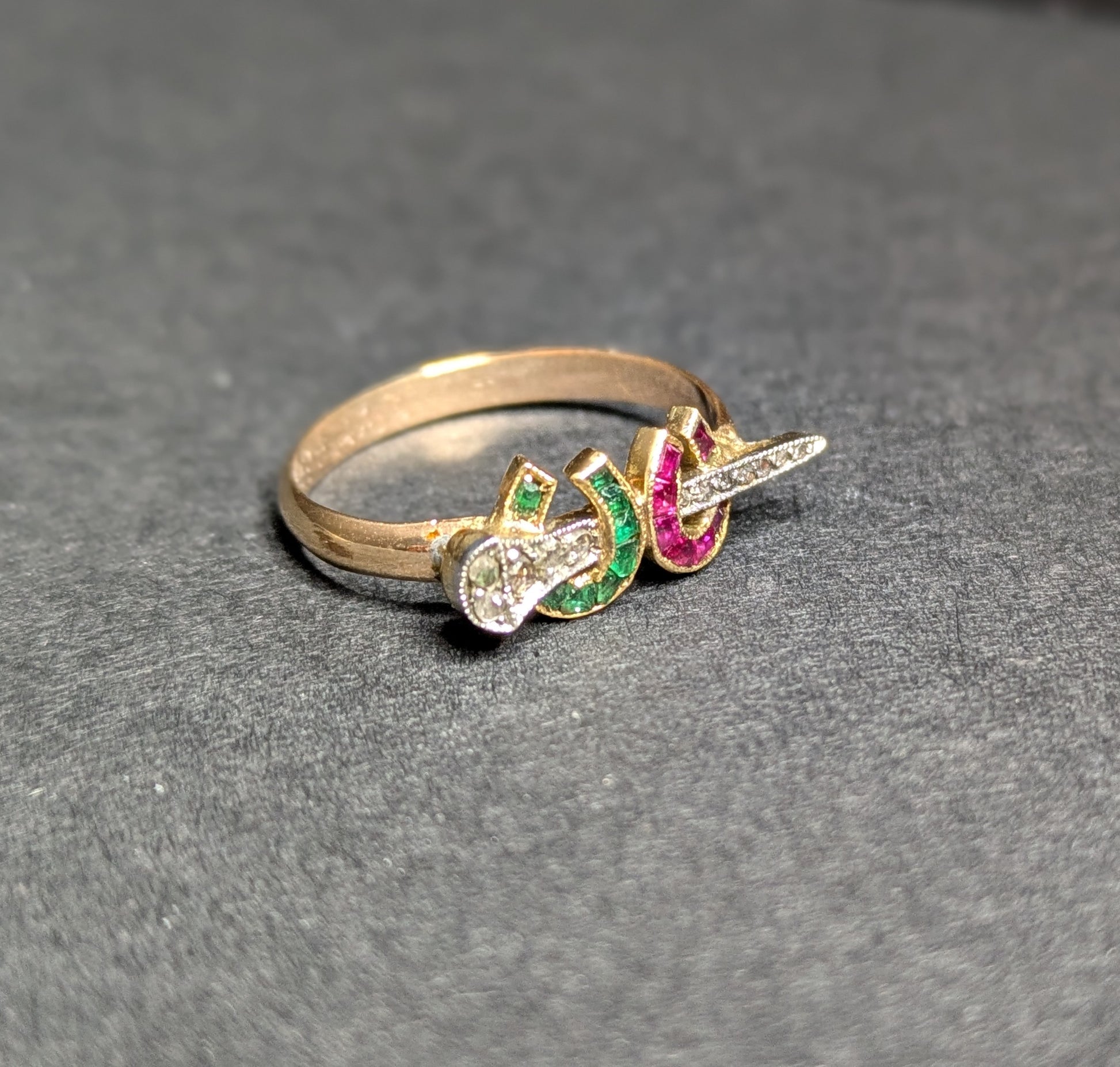 18k and Platinum Ruby and Emerald Horseshoe with Diamond Nail- Conversion to 14k Ring
