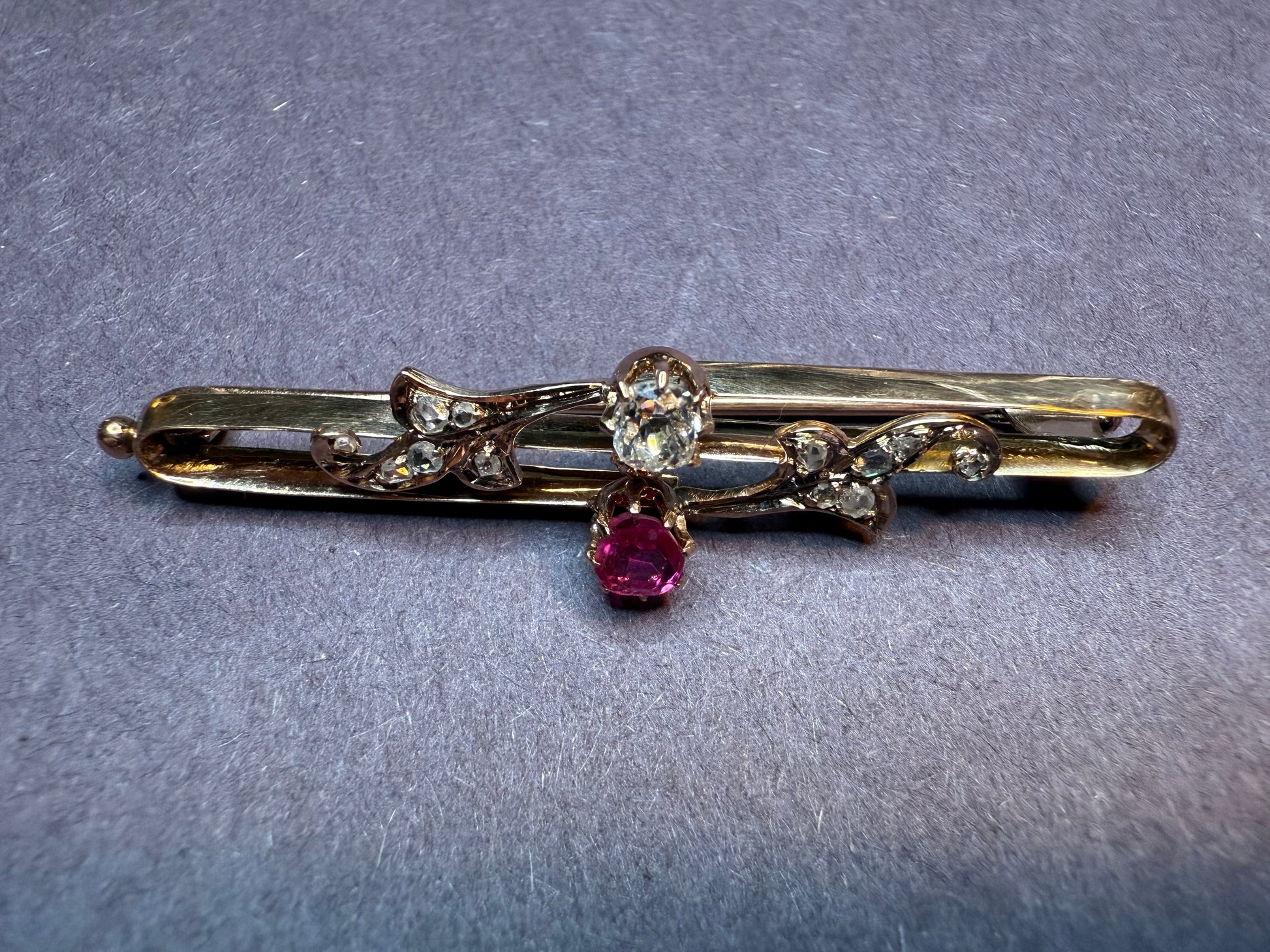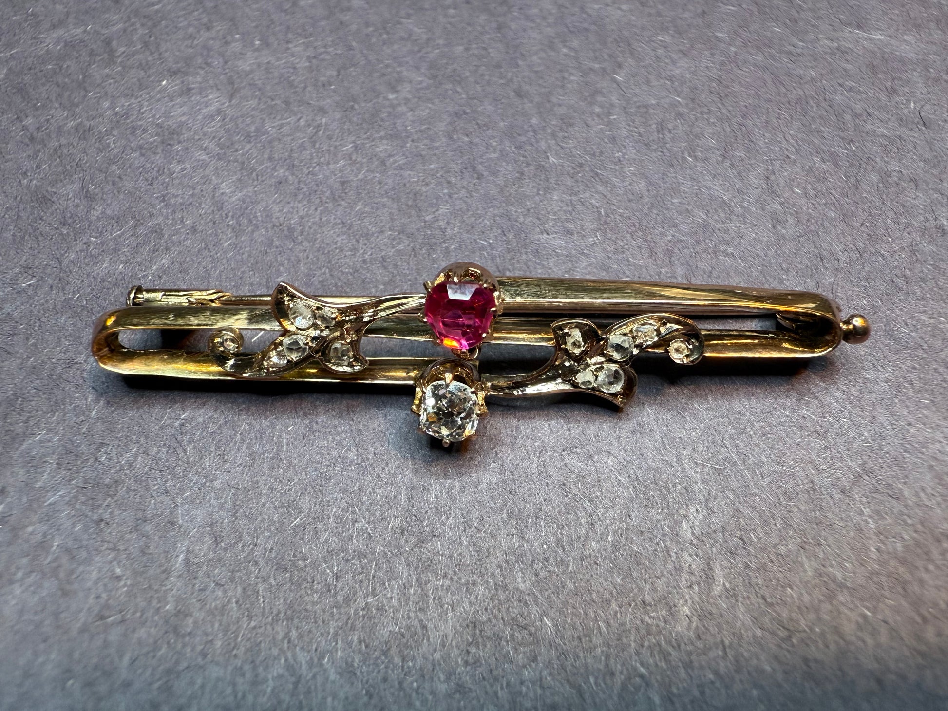 18k Art Nouveau Ruby and Diamond Brooch with Trumpet Clasp