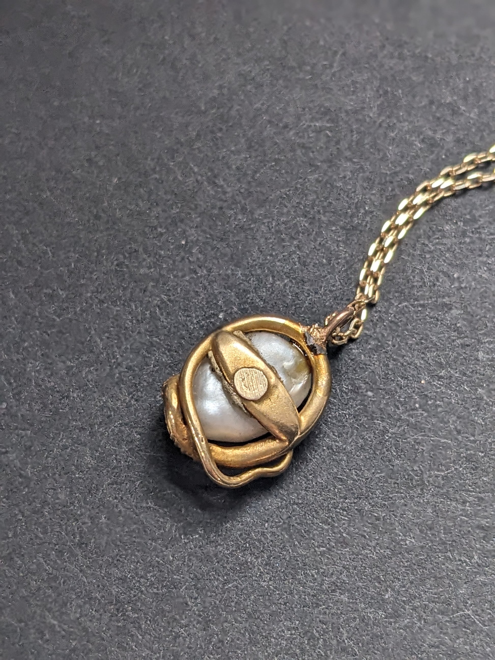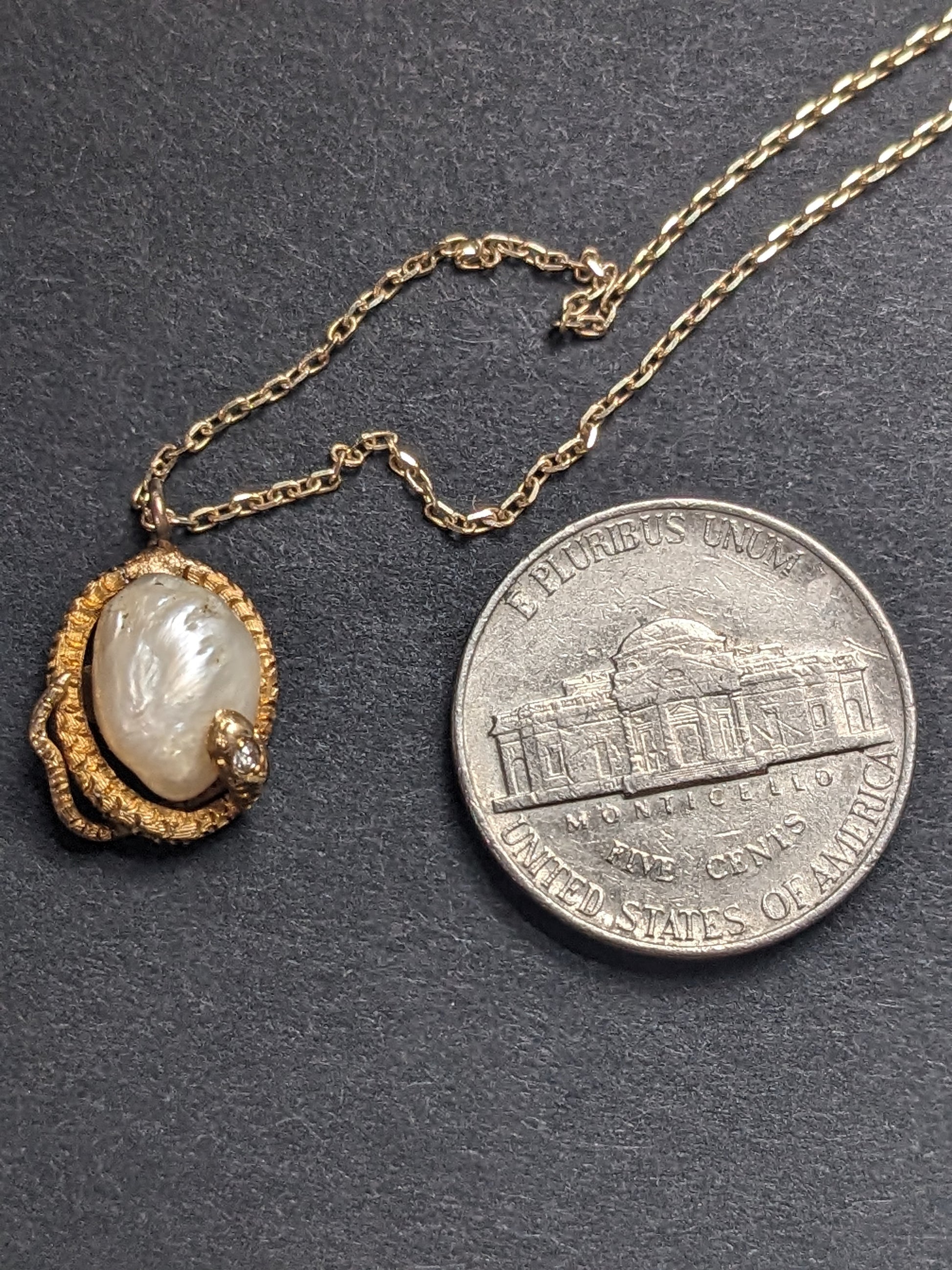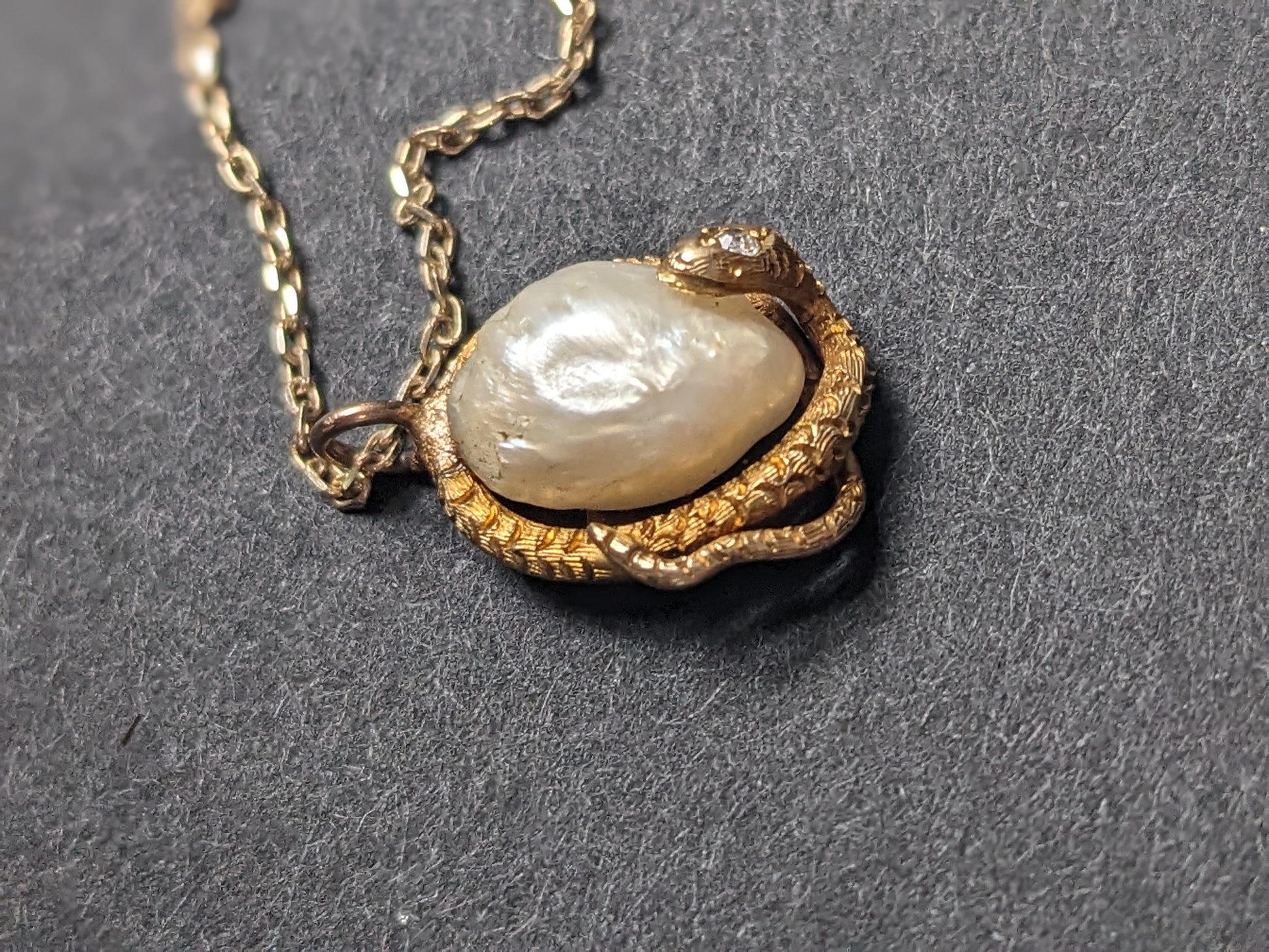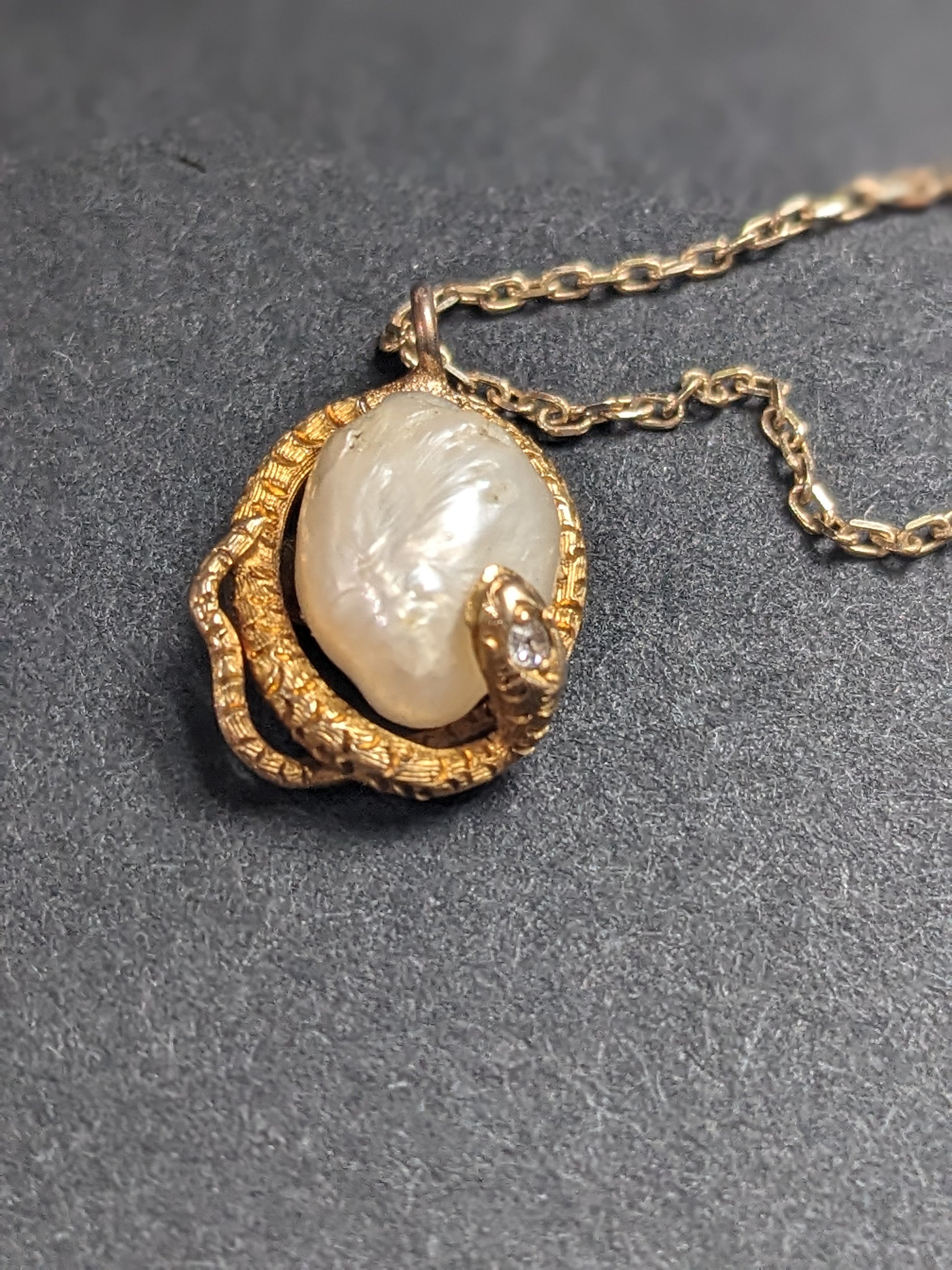 18K Art Nouveau Snake with Mine Cut Diamond and Natural Pearl on 14K Chain