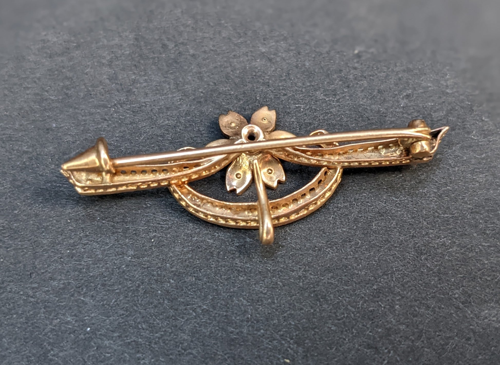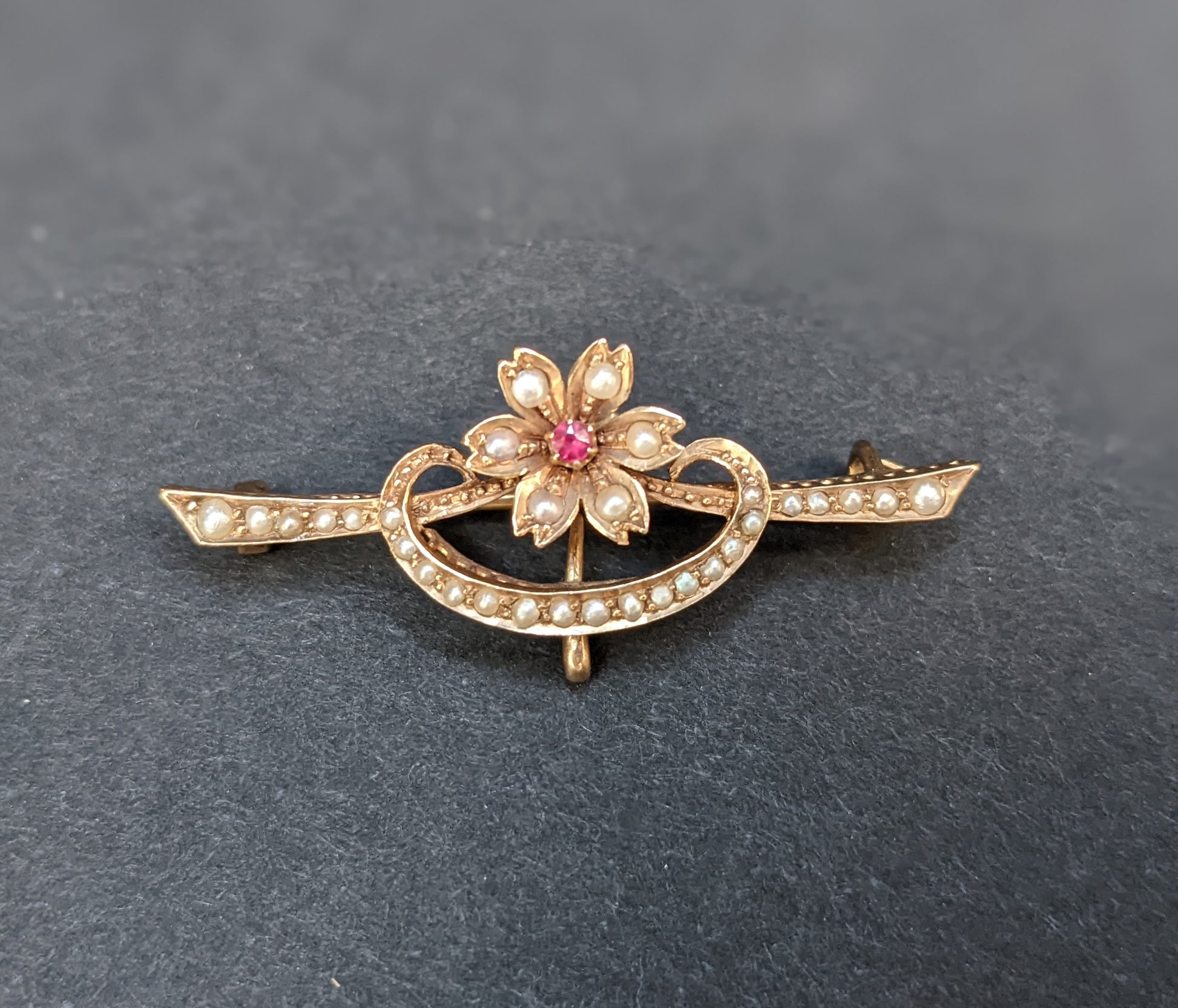 This lovely 18 karat Art Nouveau watch pin has the original hook and tulip style catch. It has half-cut seed pearls and a ruby center. The center flower is designed to spin. It is in fine working condition with two pearls replaced.