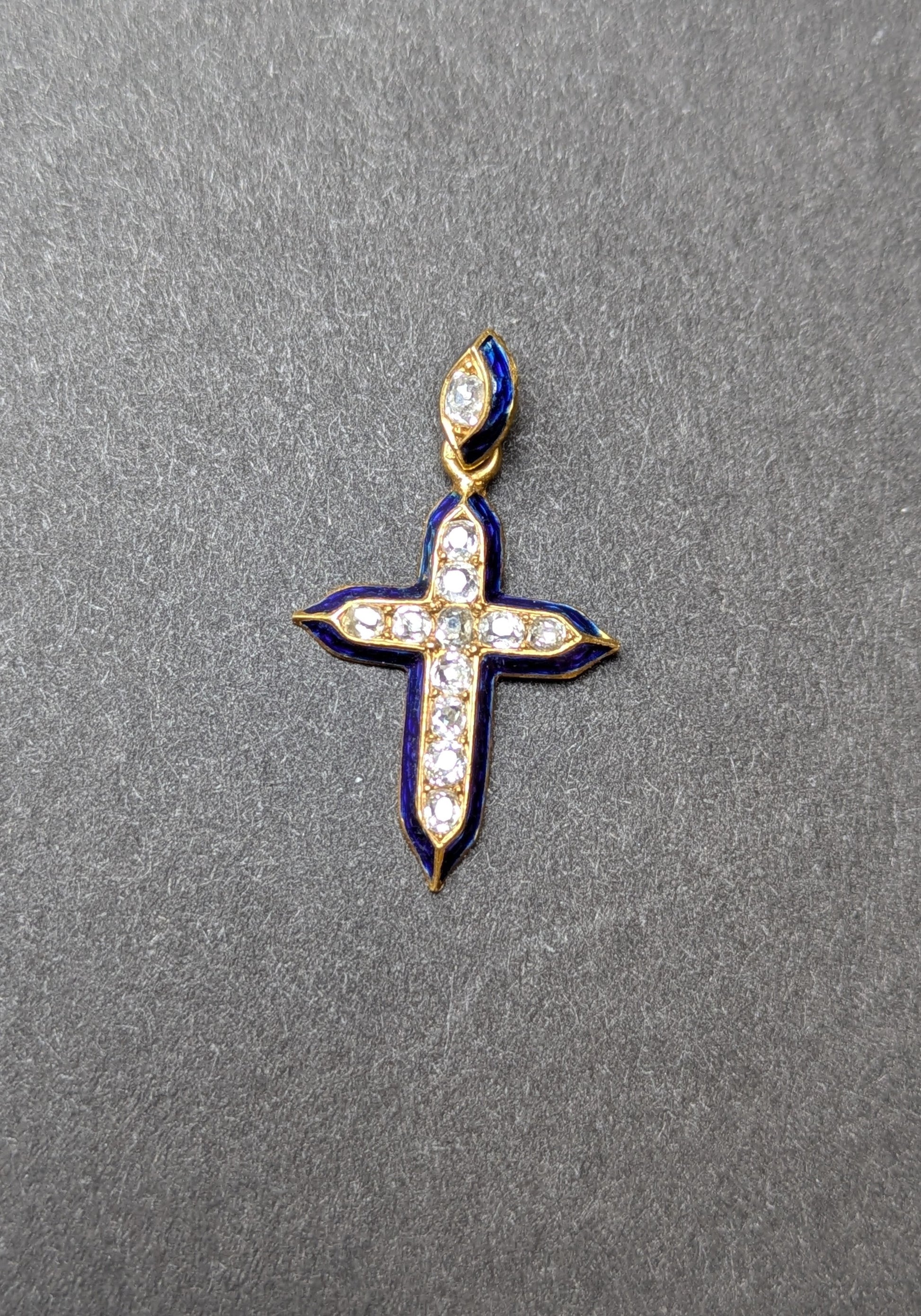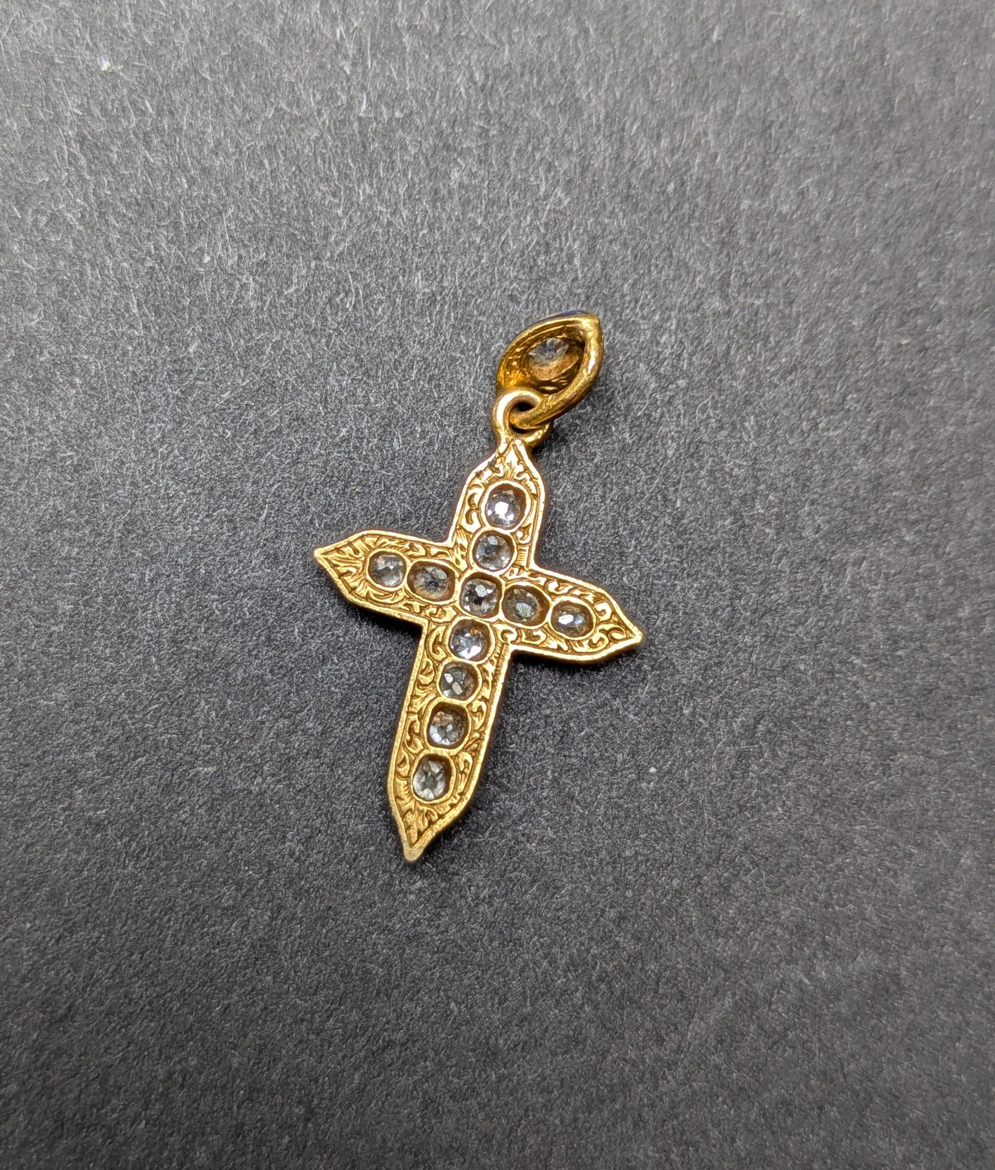 18k Early Victorian Engraved Blue Enamel and Diamond Cross Charm