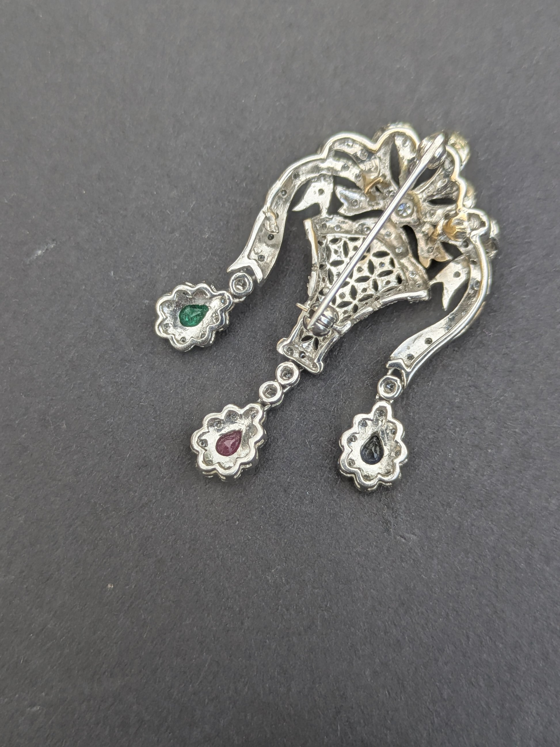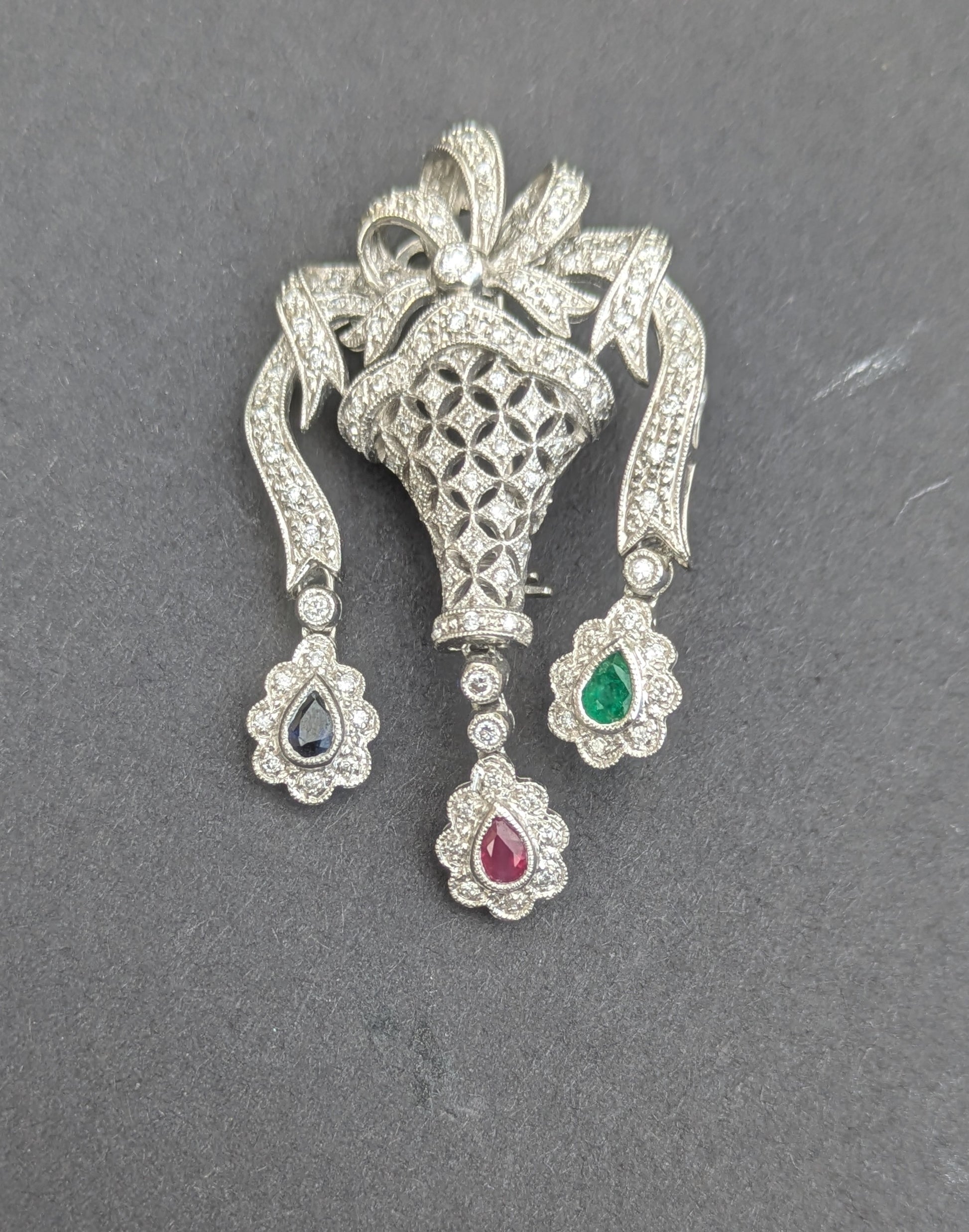 18k White Gold, Diamond, Sapphire, Ruby and Emerald Brooch