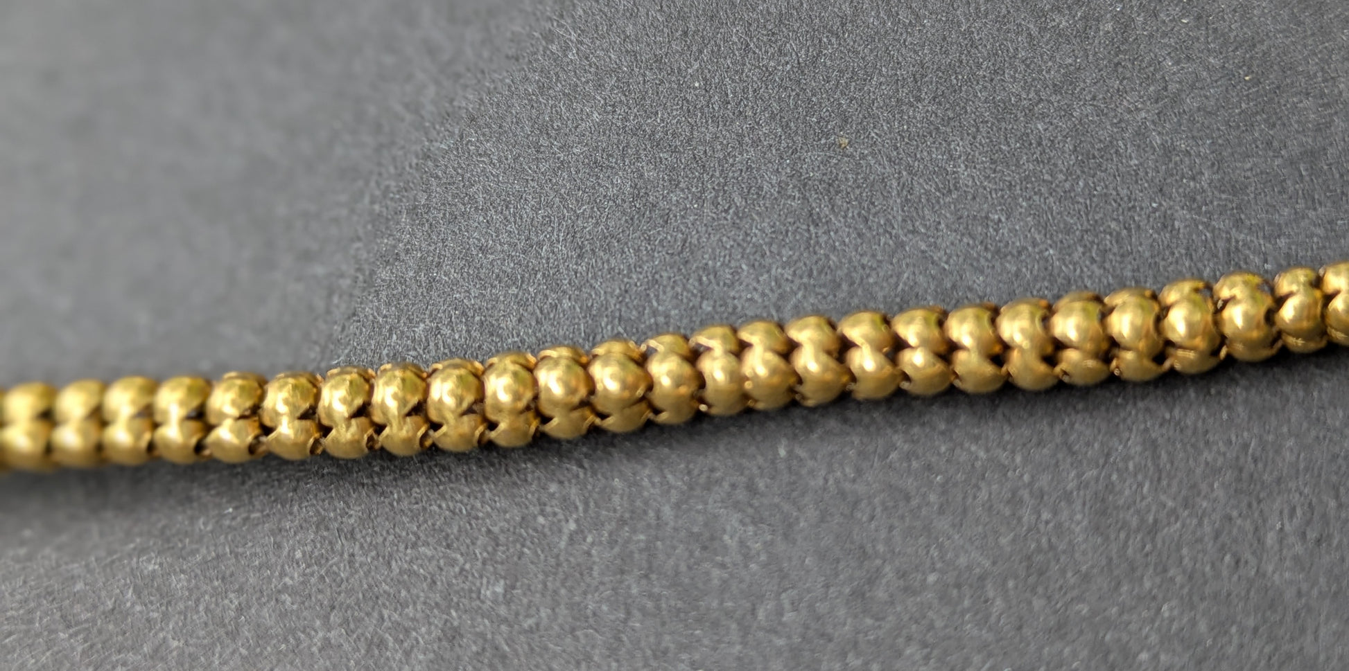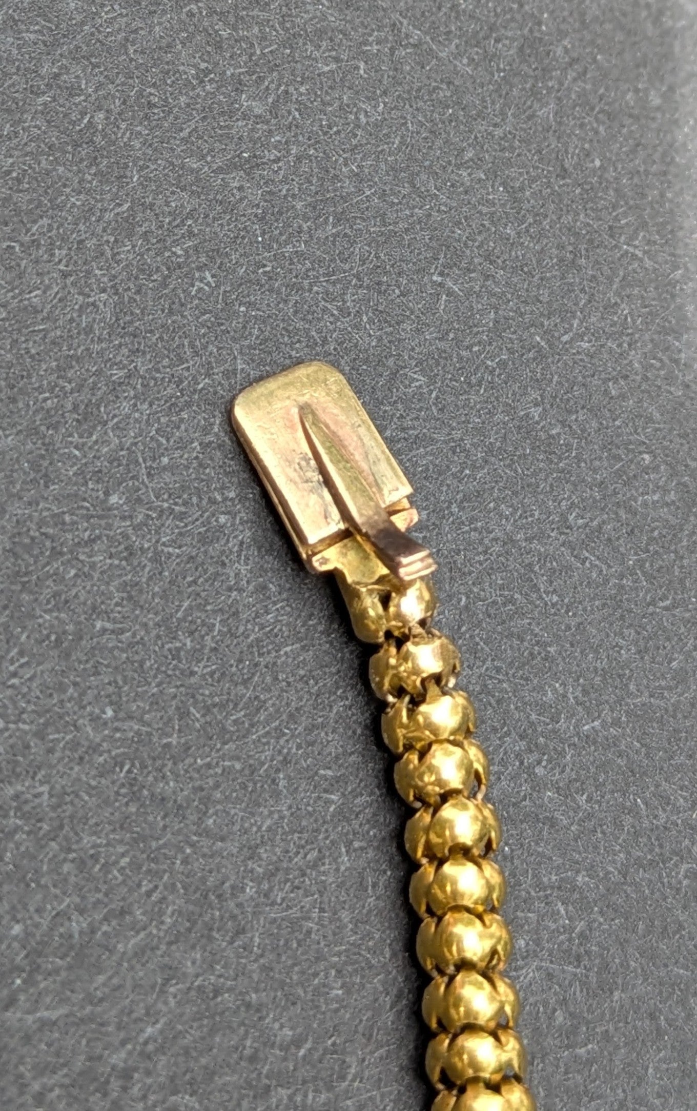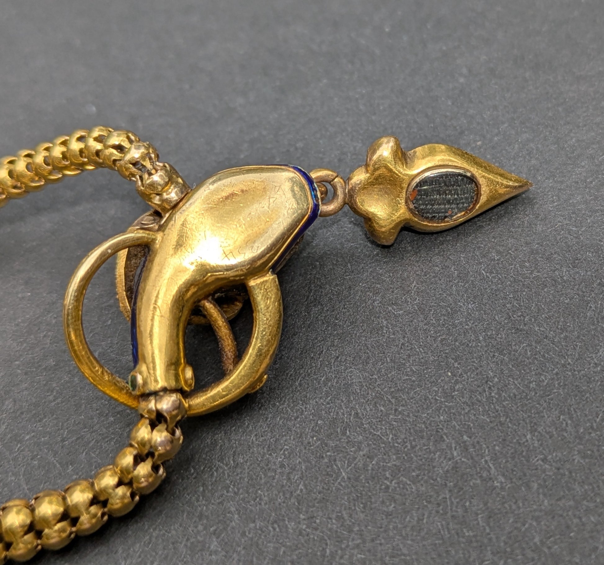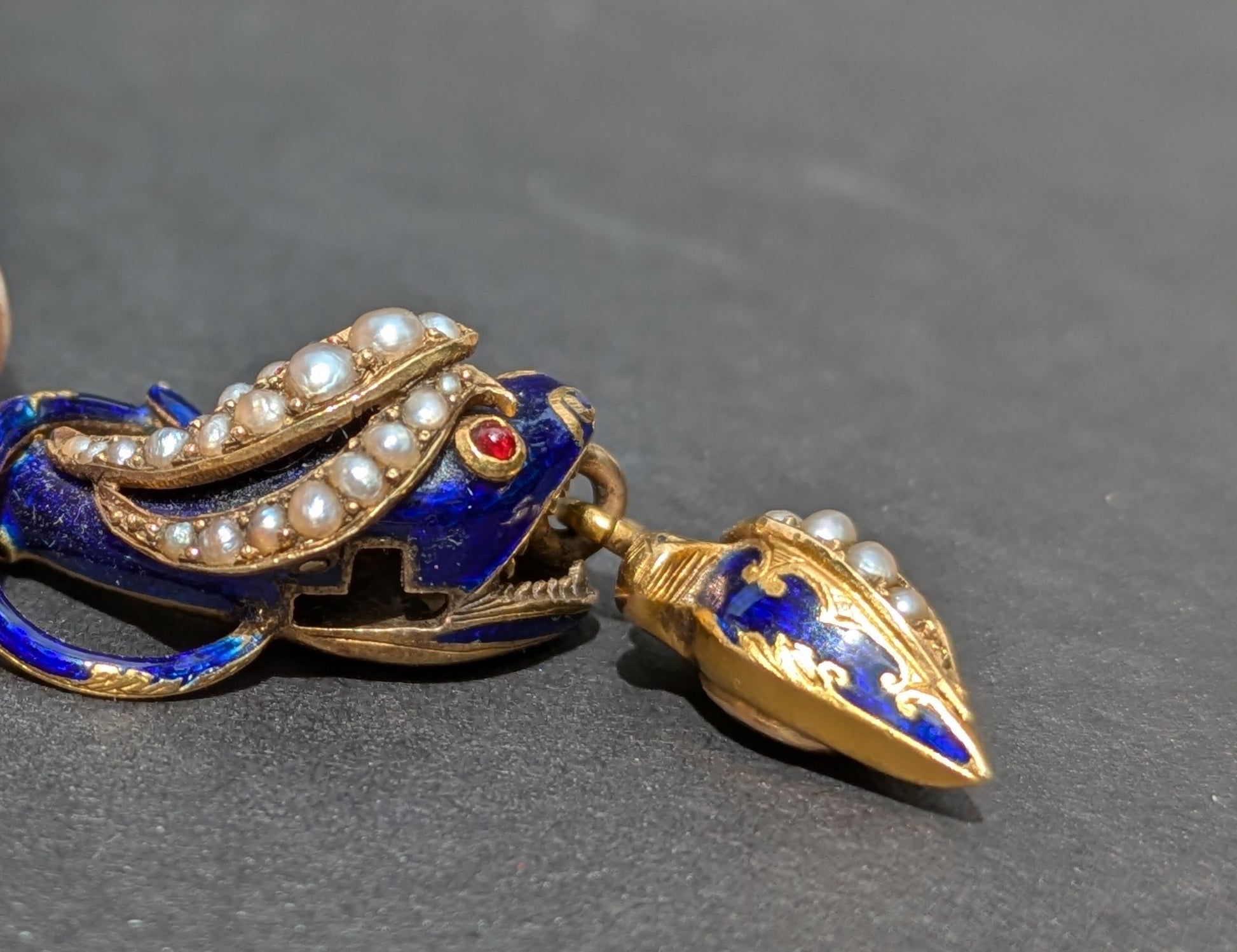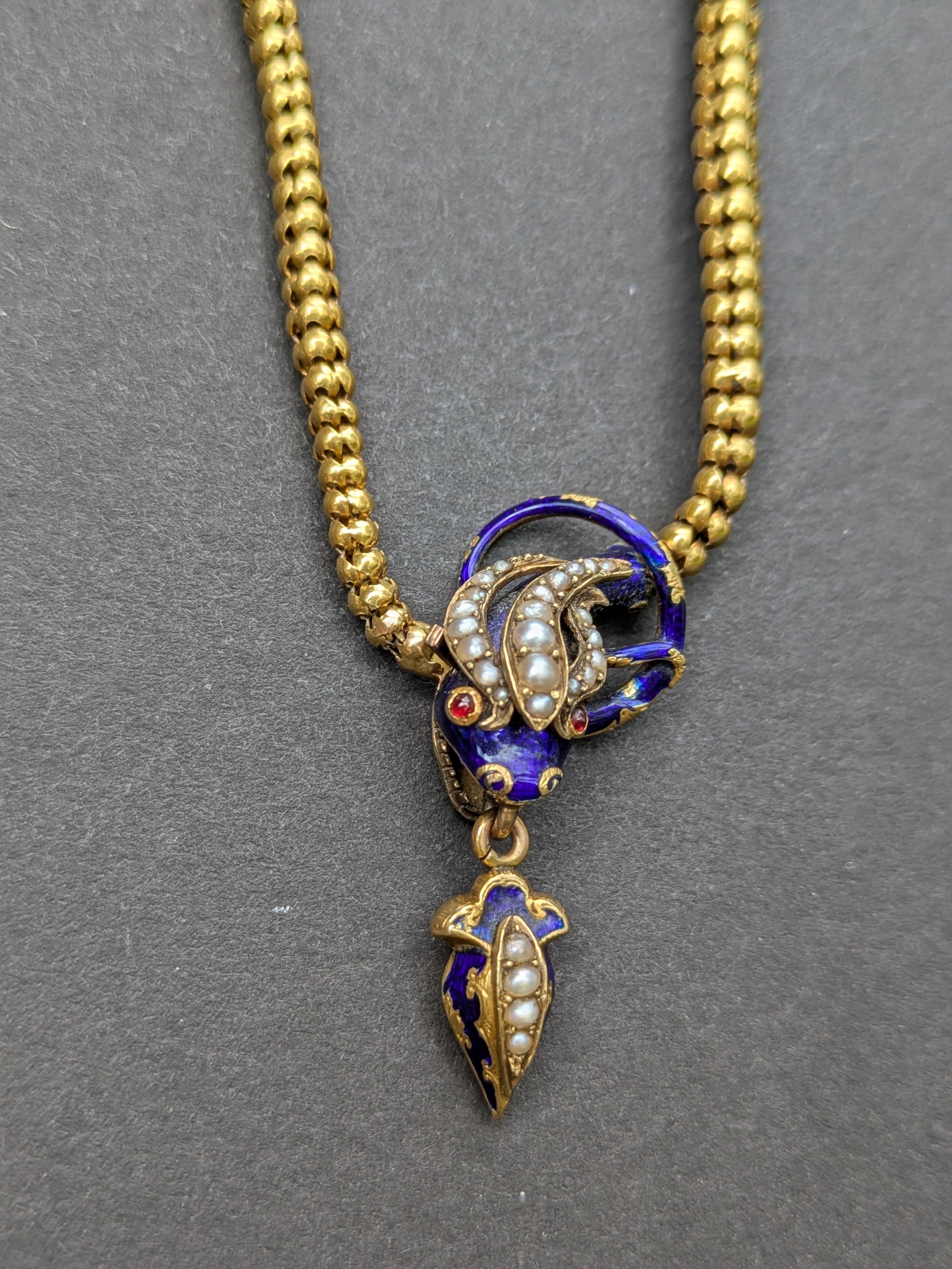 Late 1800s 14k Snake Necklace with Blue and White Enamel, Ruby Eyes, and Original Pearl Drop