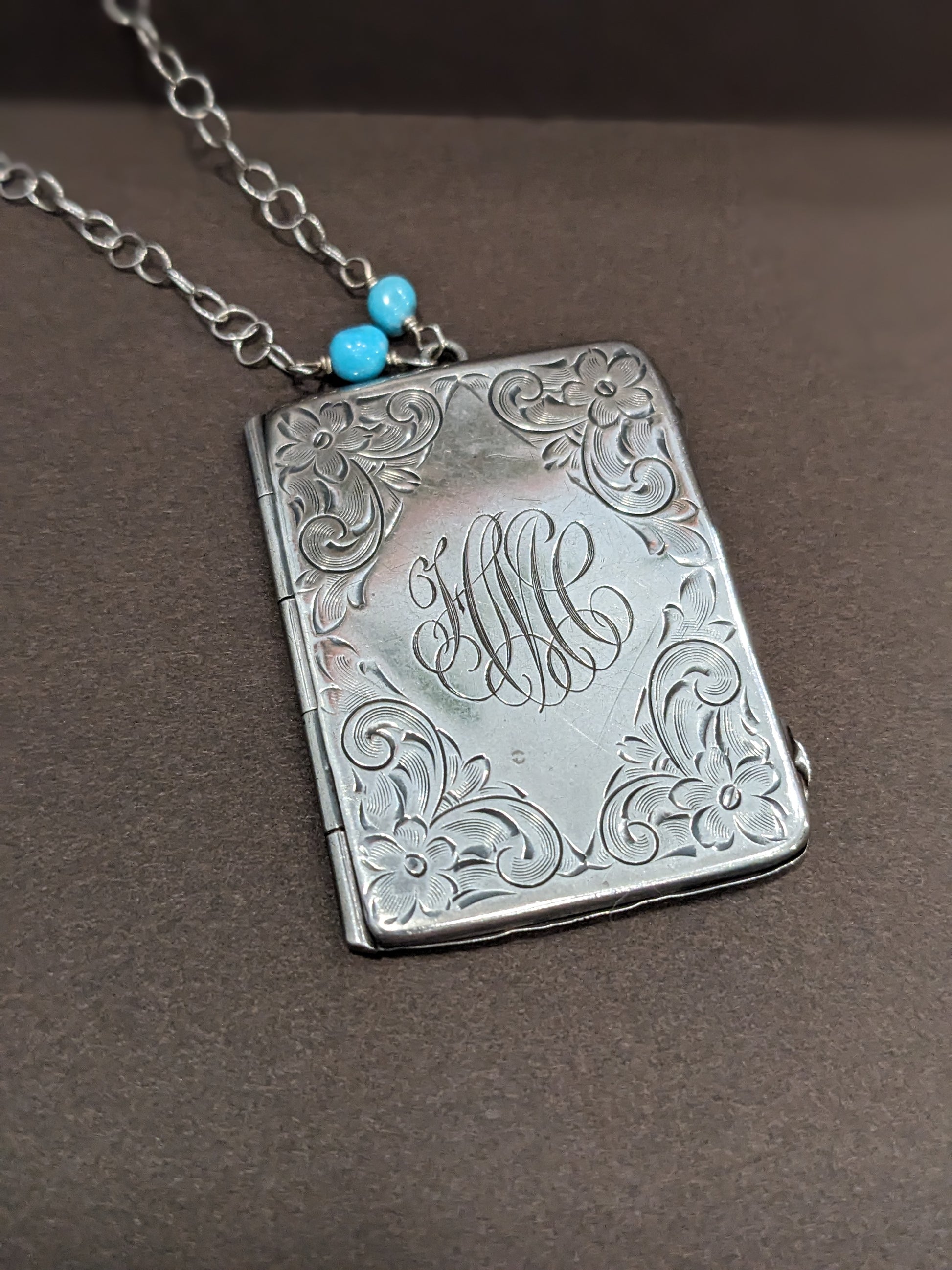 1900's Sterling Rectangular Locket with Sterling and Turquoise Chain