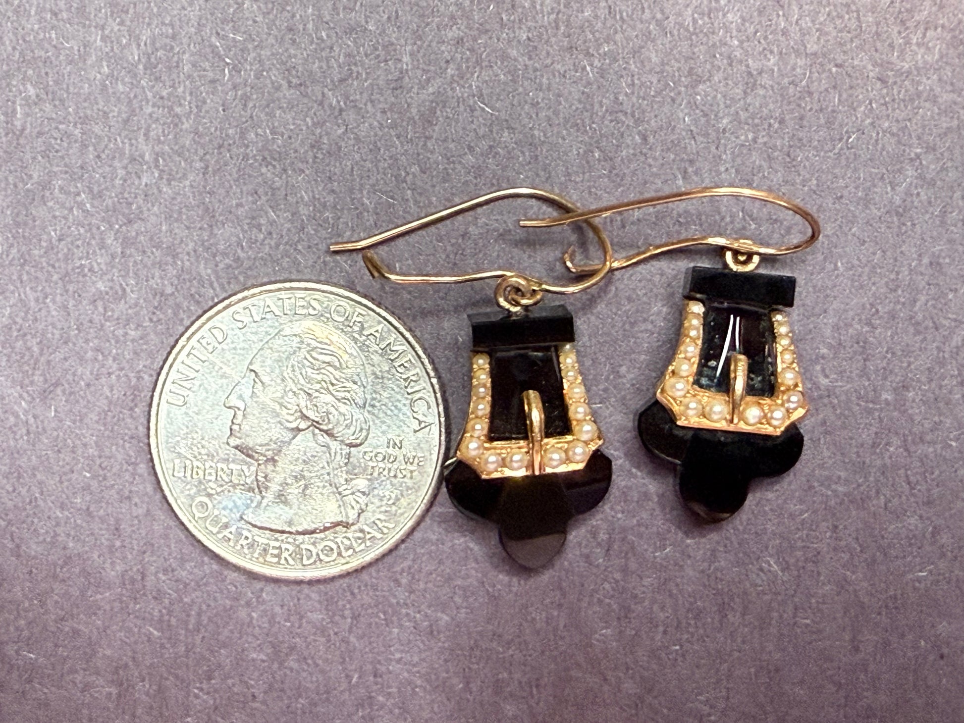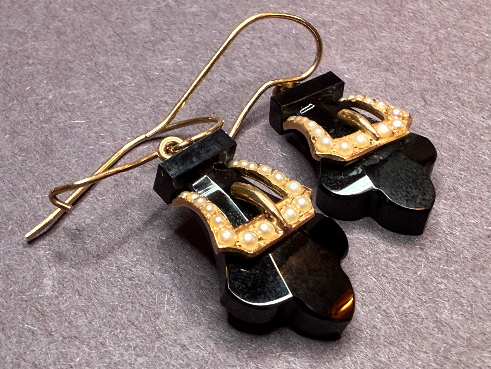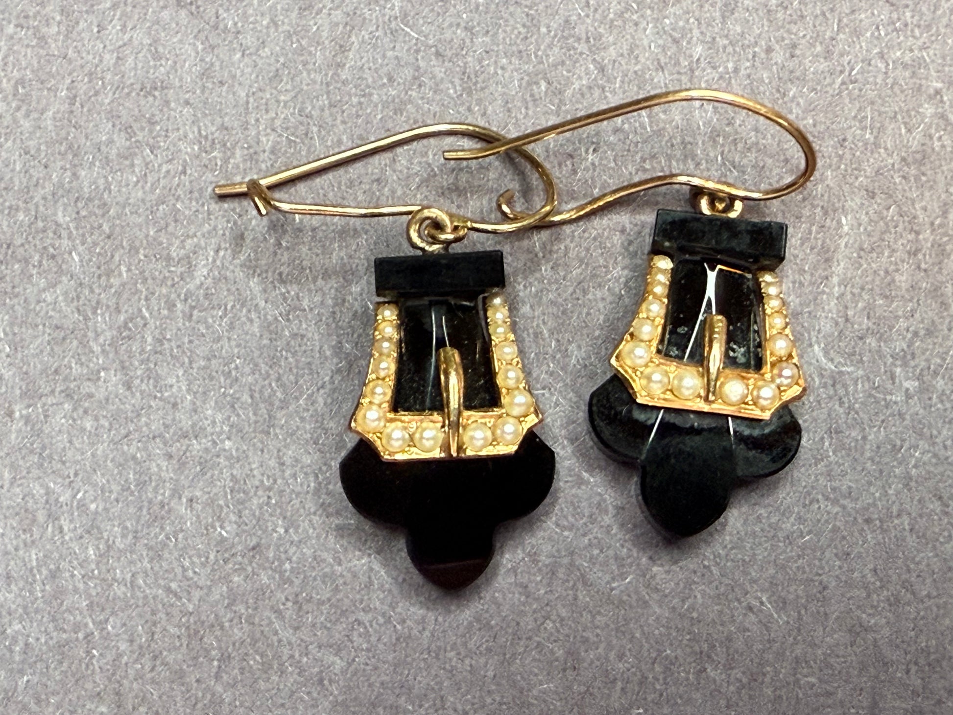 American Victorian Era 10k Onyx & Seed Pearl Buckle Earrings