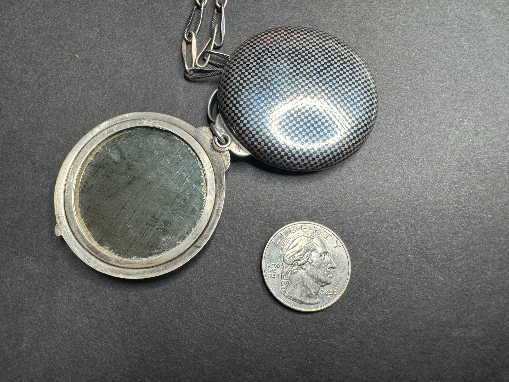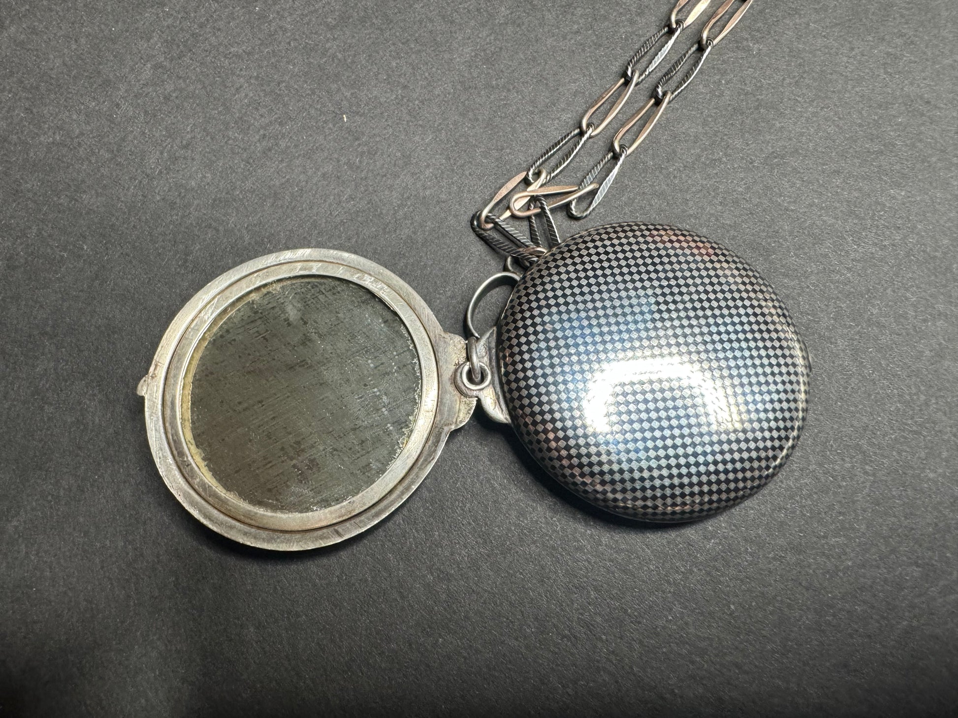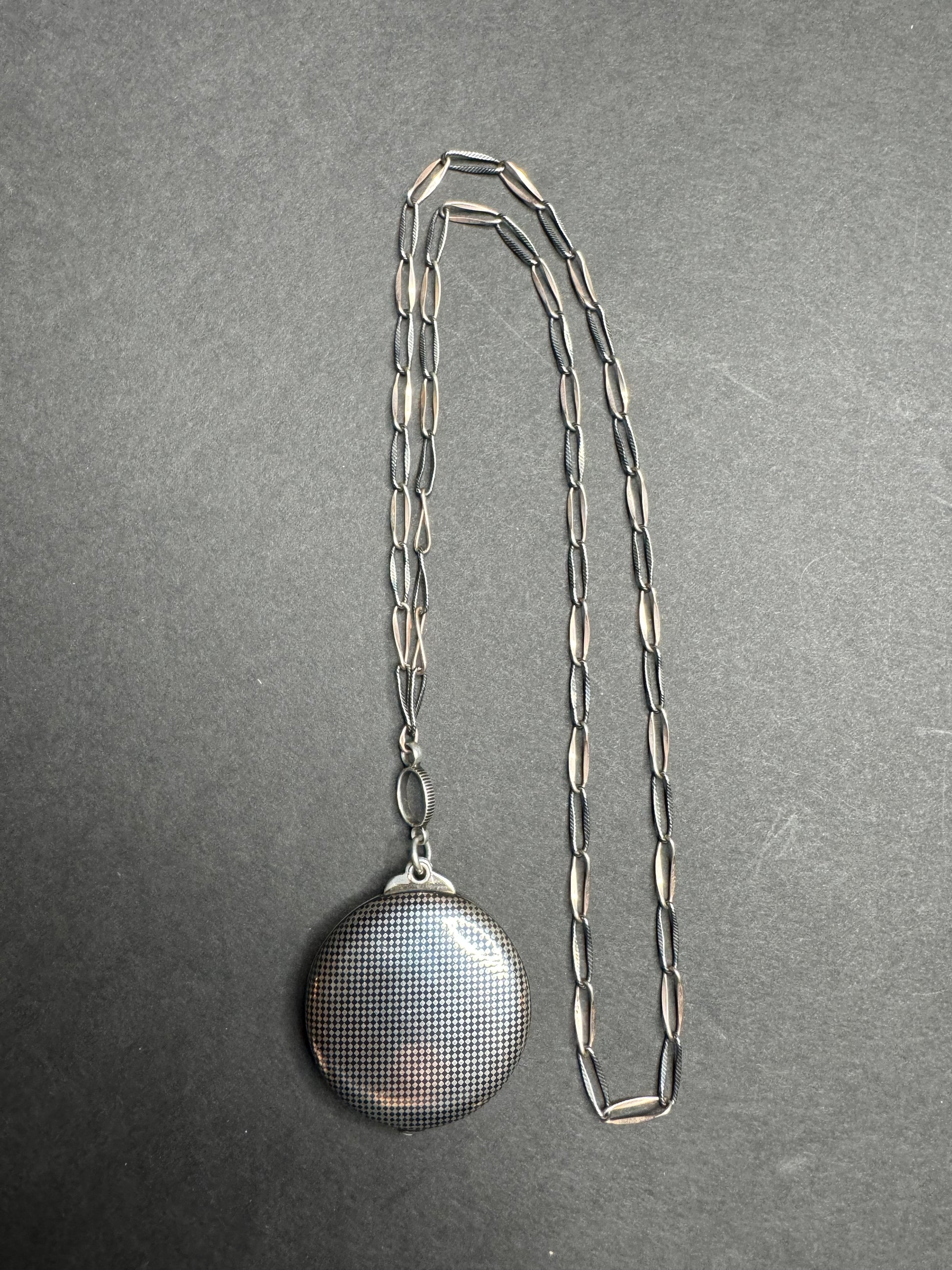 Art Deco Sterling and Rose Gold German Niello Necklace with Pocket Mirror