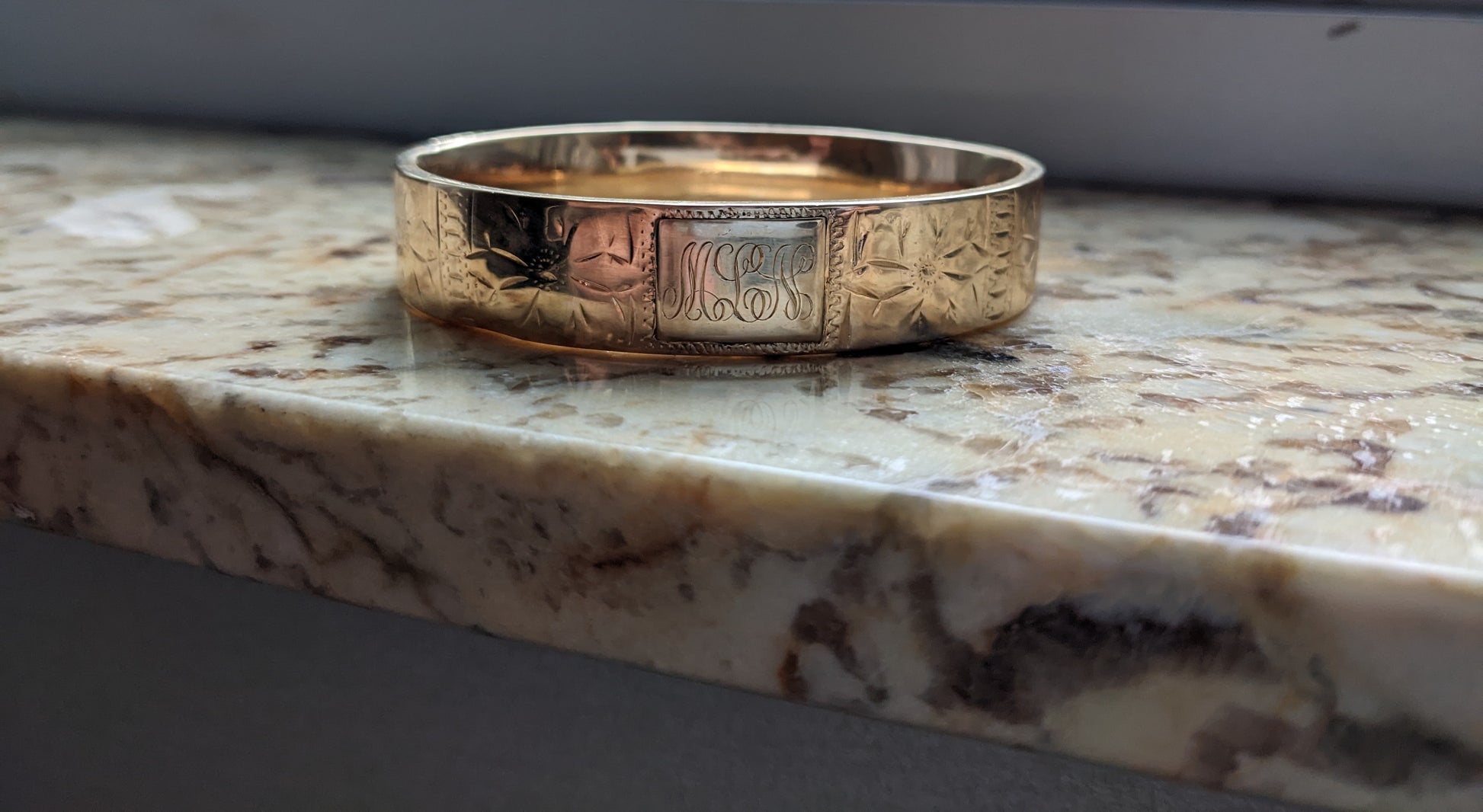 14K yellow gold bangle featuring engraved decoration and custom monogram