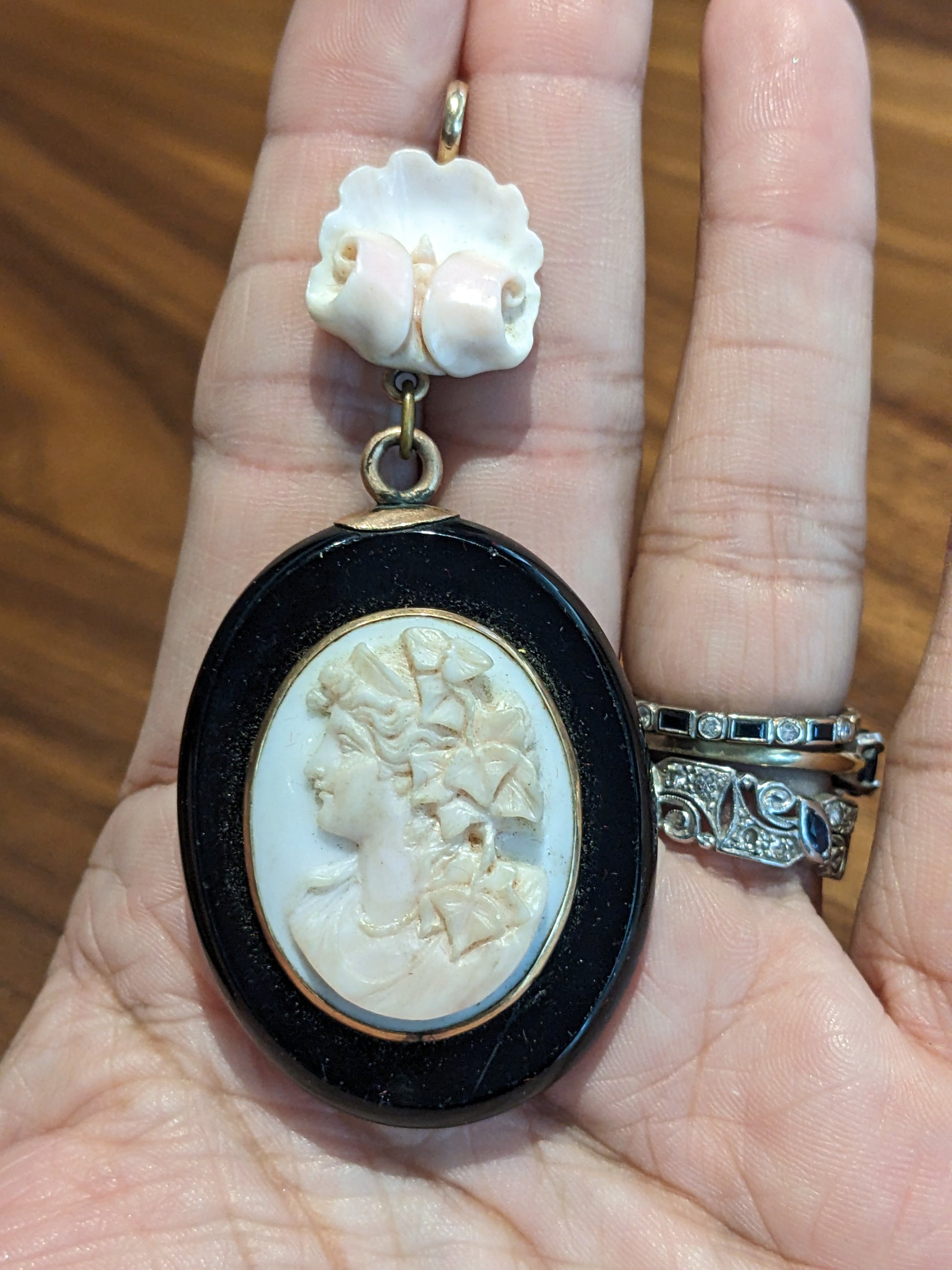oval onyx locket displaying an carved angel skin coral cameo and a locket verso with suspended from a 14kt yellow gold bail with angel skin coral carved shell pendant