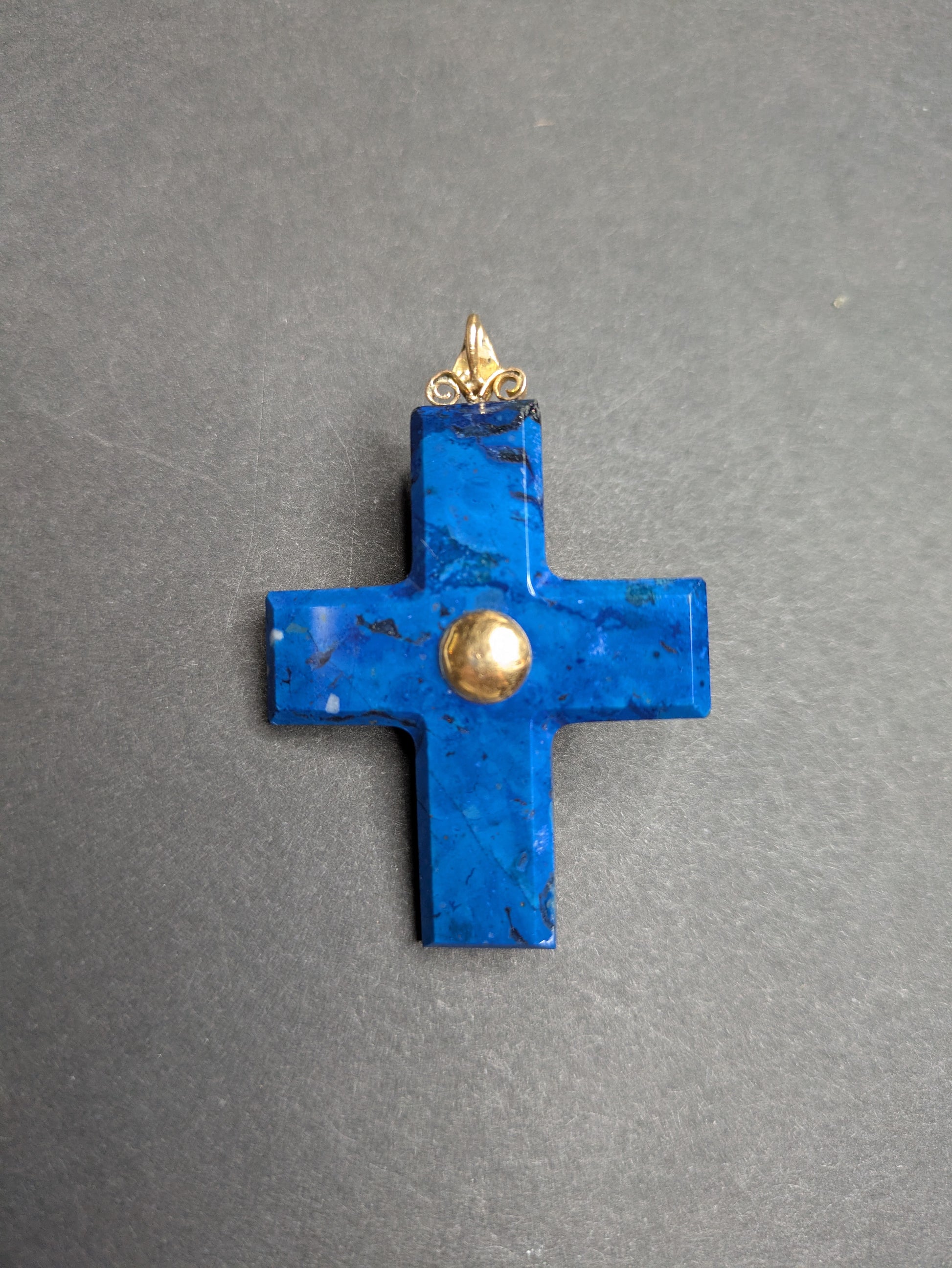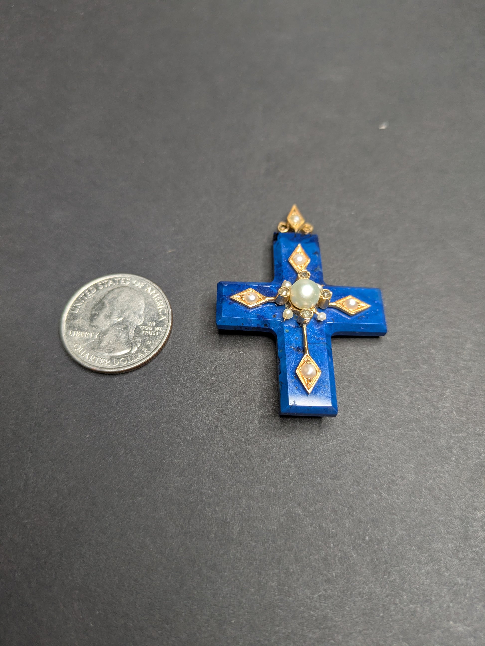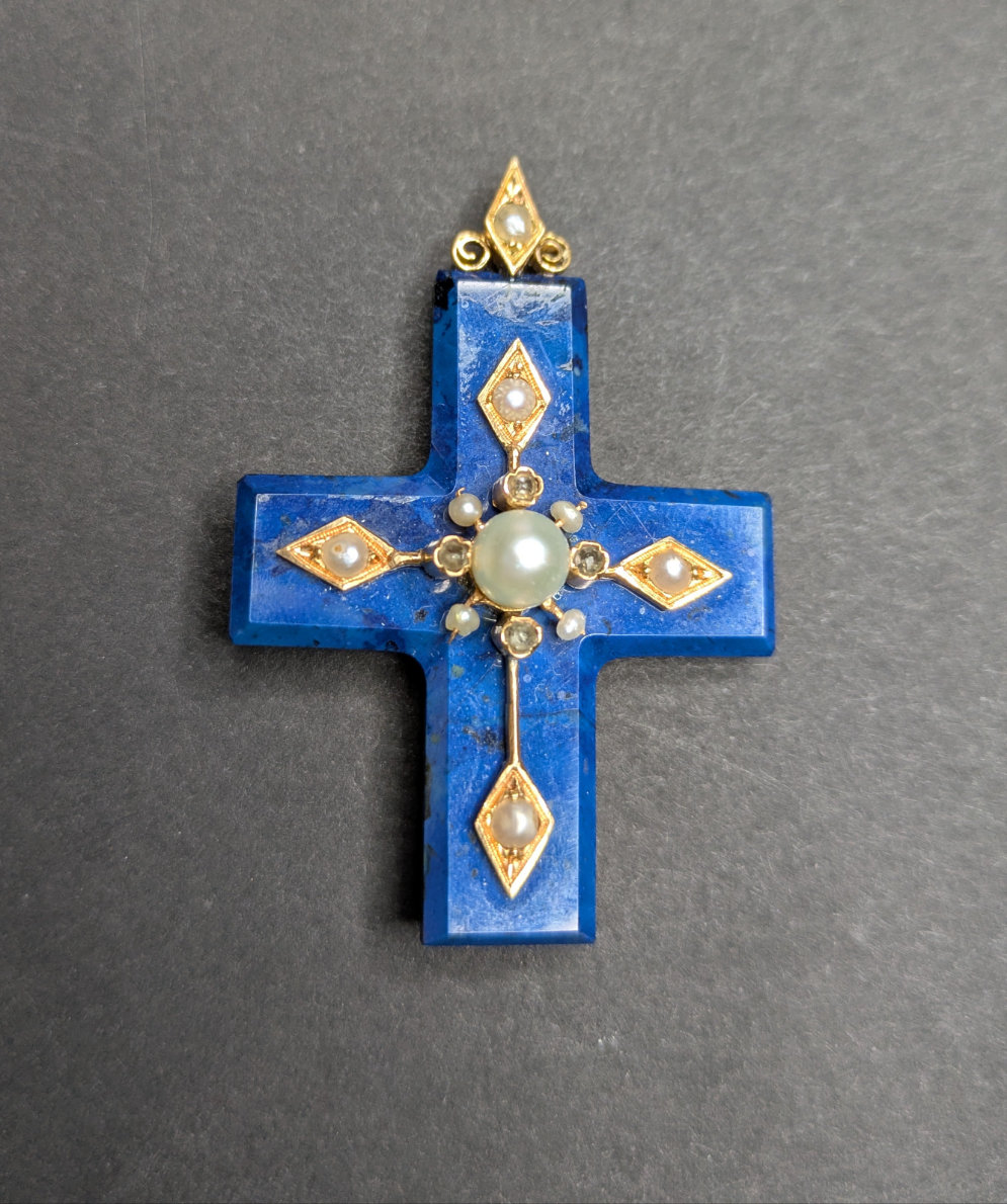 Carved Lapis Cross set with 14kt Pearls and Diamond pendant