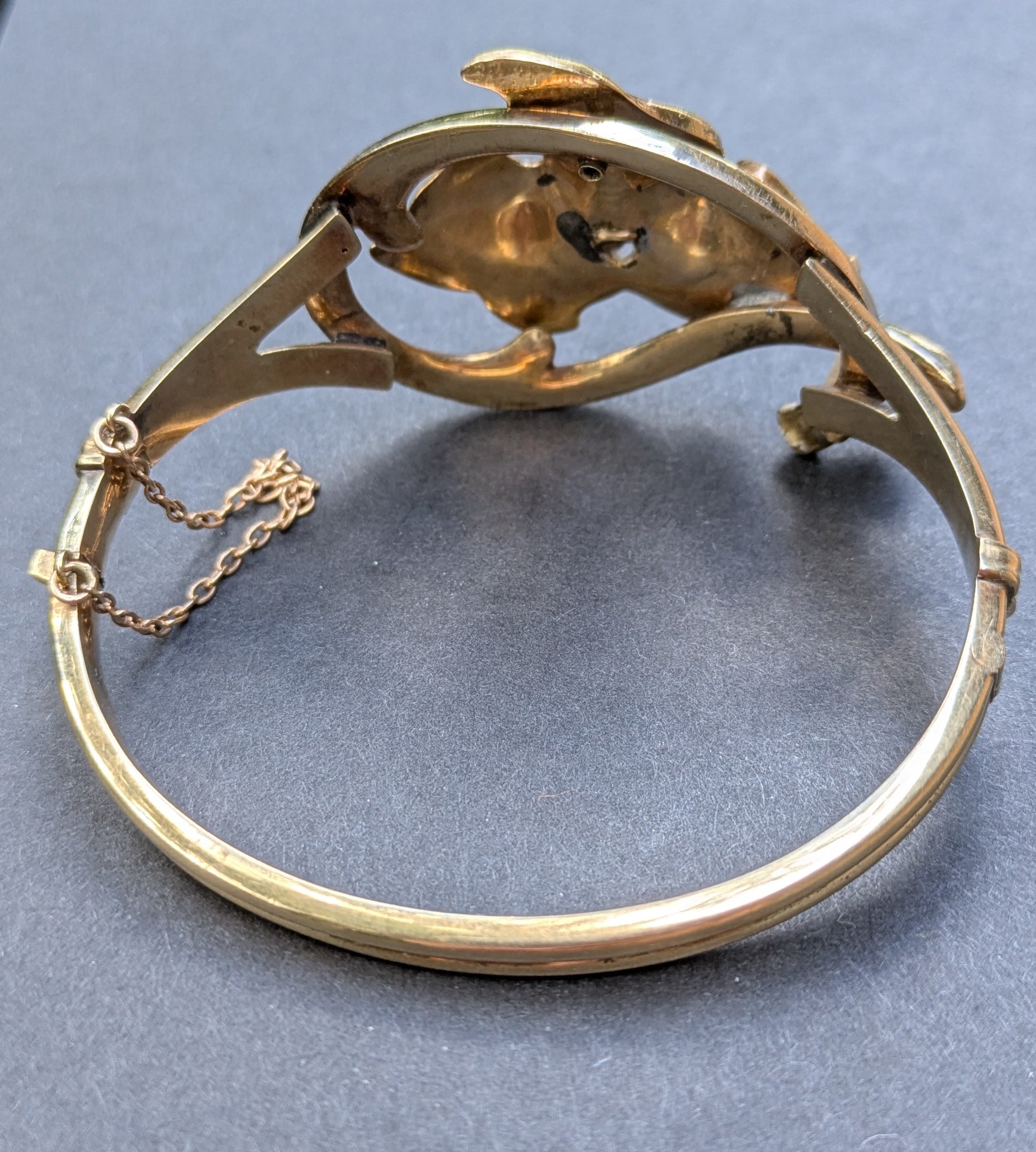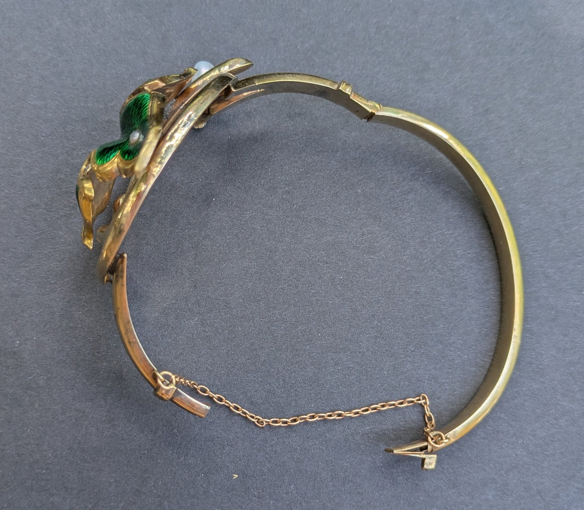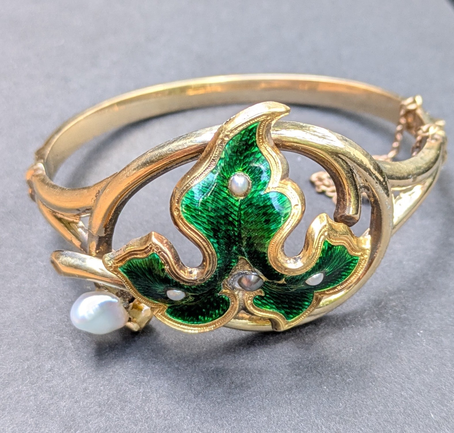 Early 1900's 14k Hinge Bangle Bracelet with Green Enamel and Seed Pearl