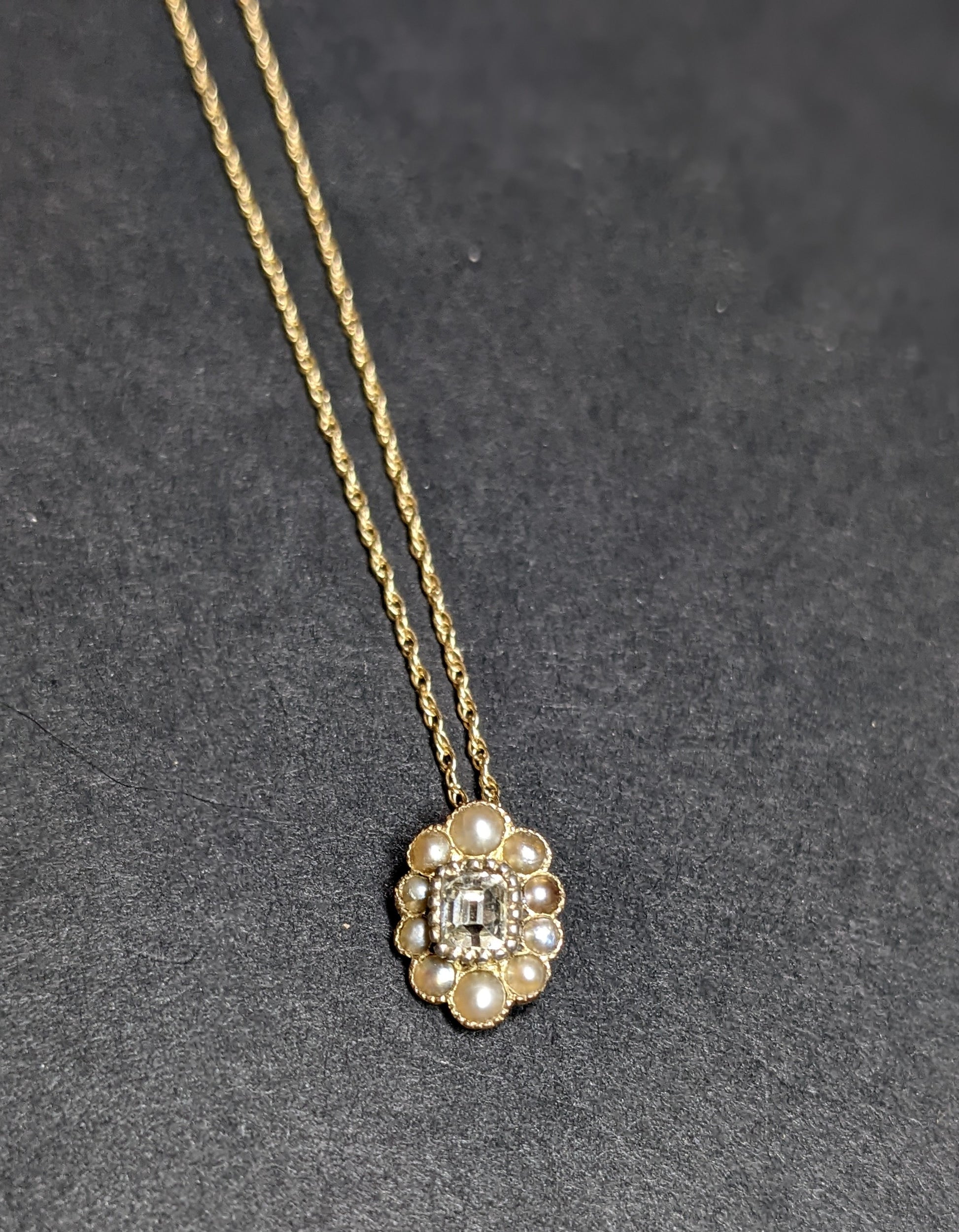 Early 1900s Step Cut Diamond and Half Pearl Necklace