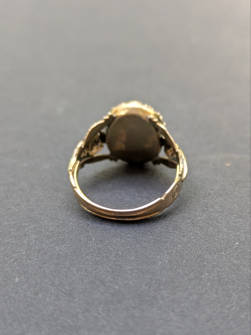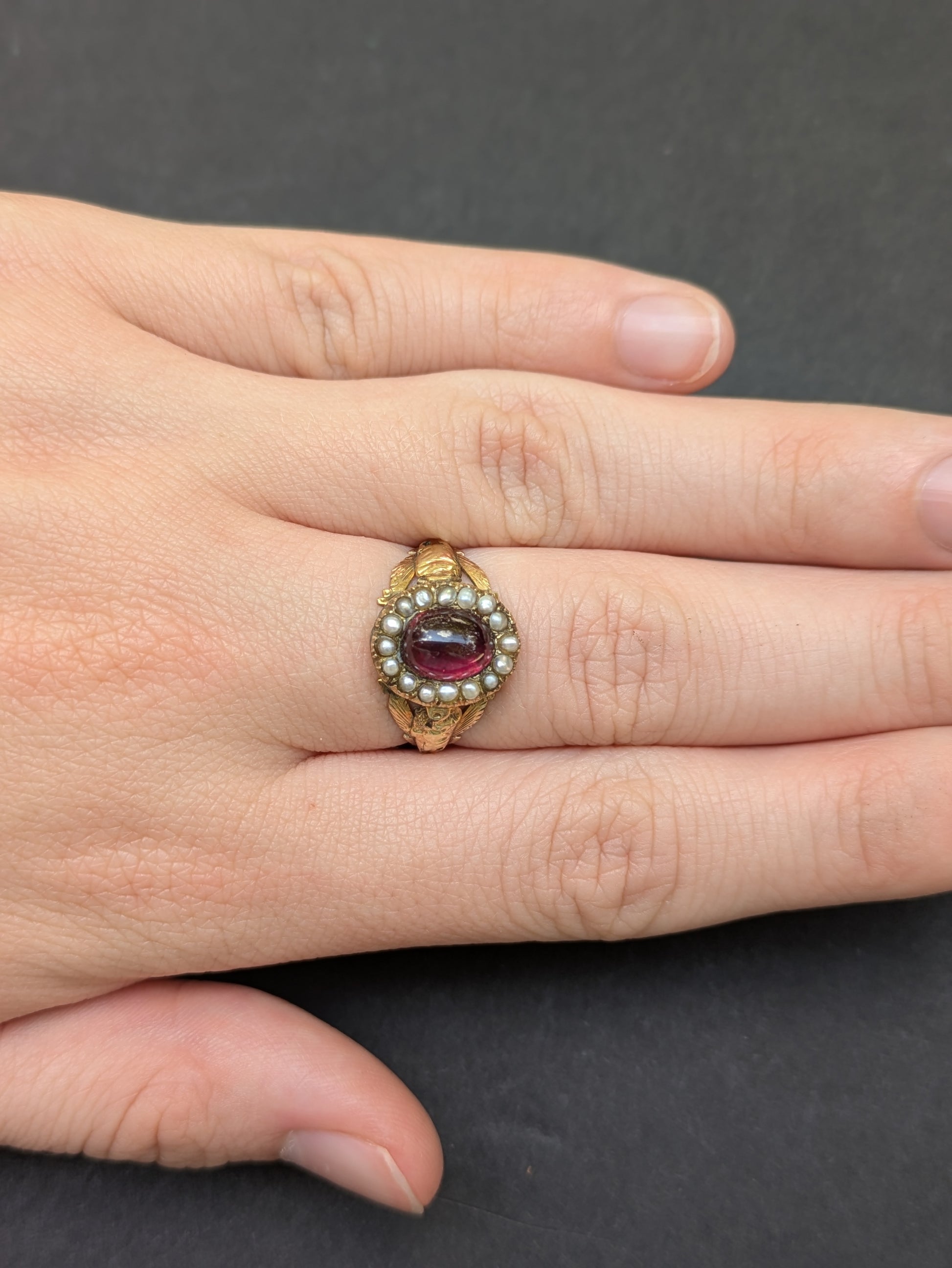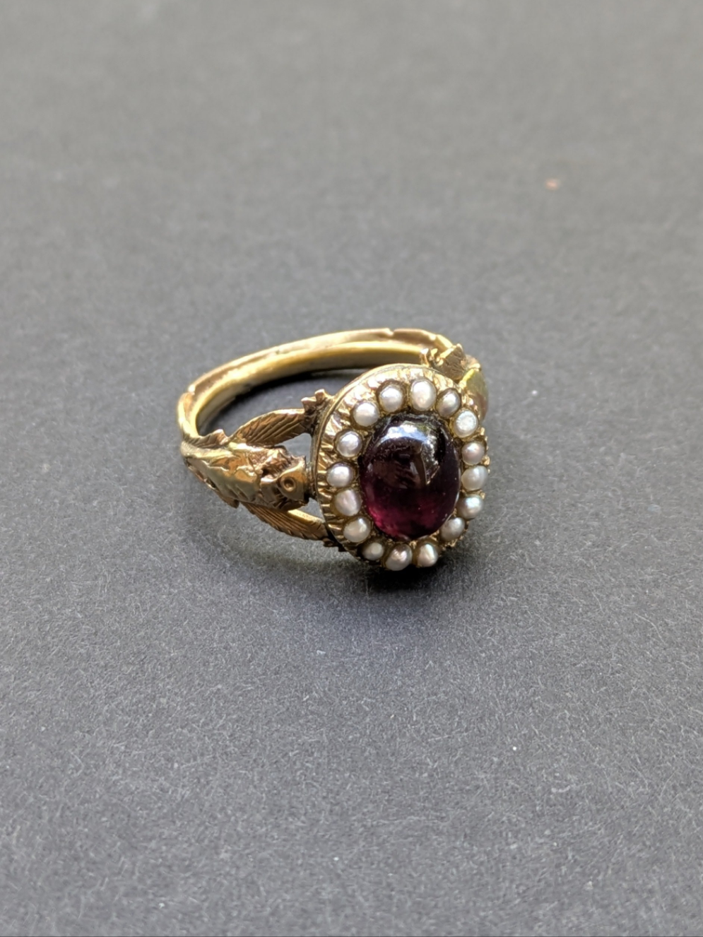 Foil Backed Garnet and Seed Pearl Ring with Floral Shoulders
