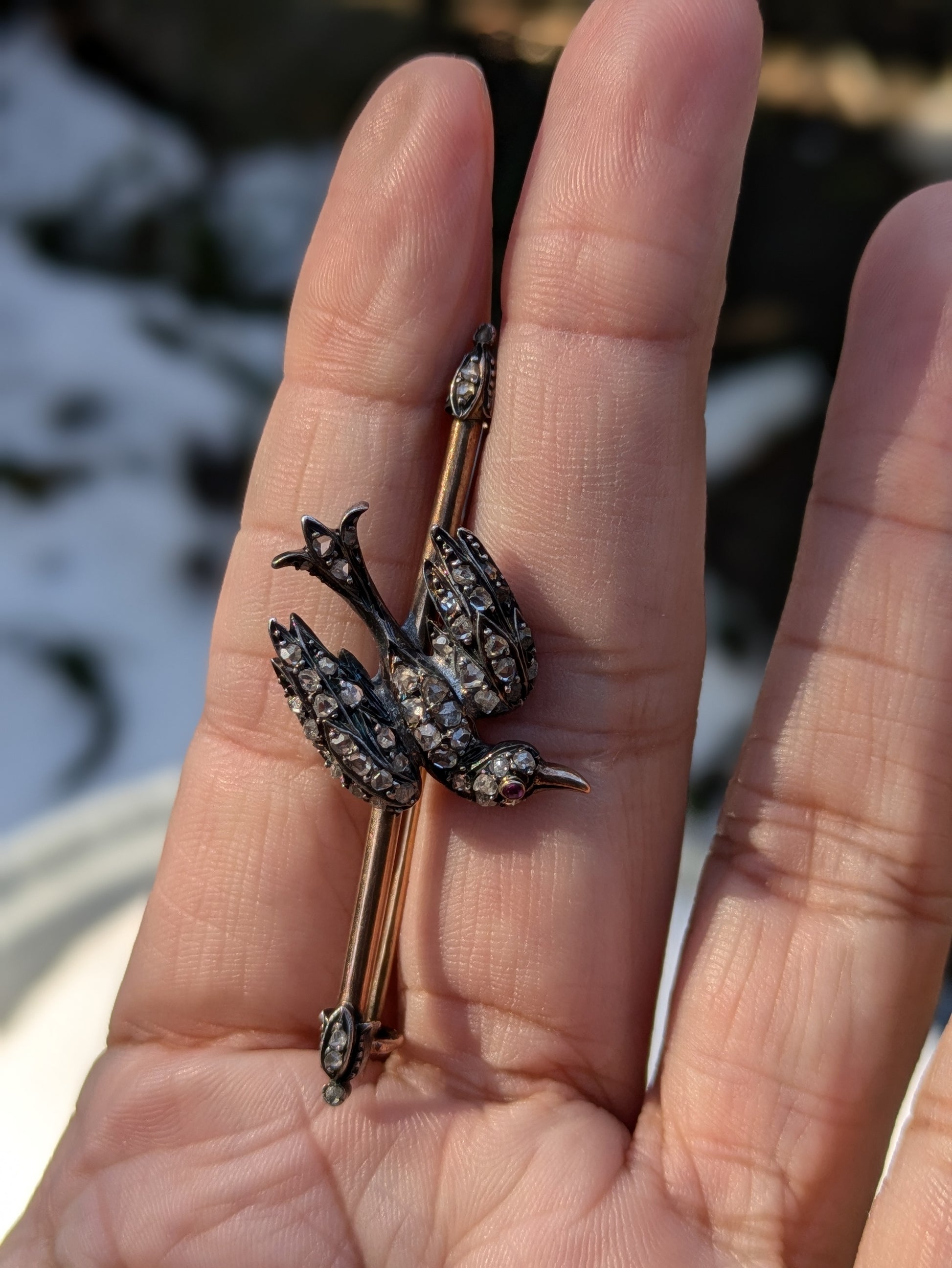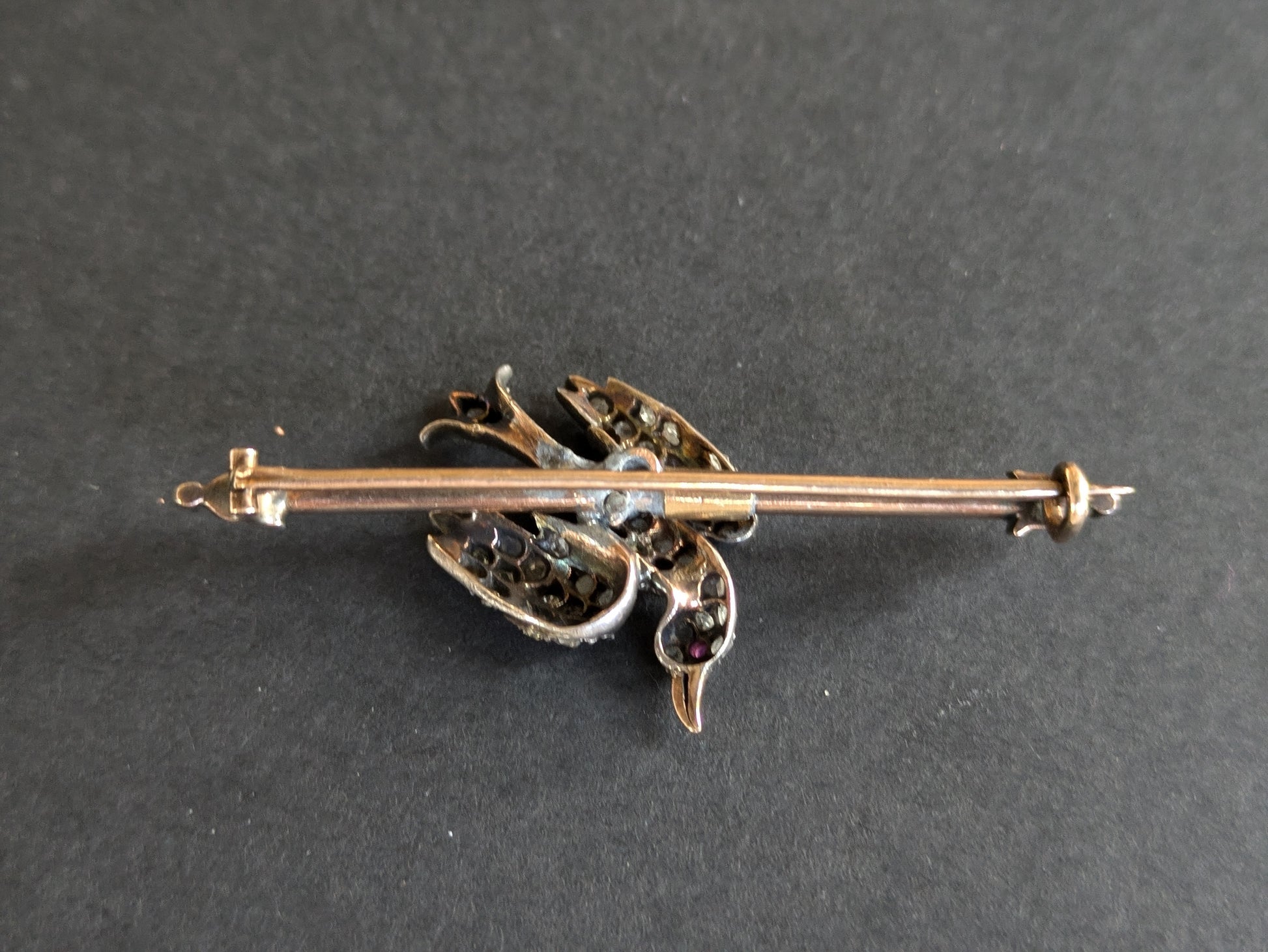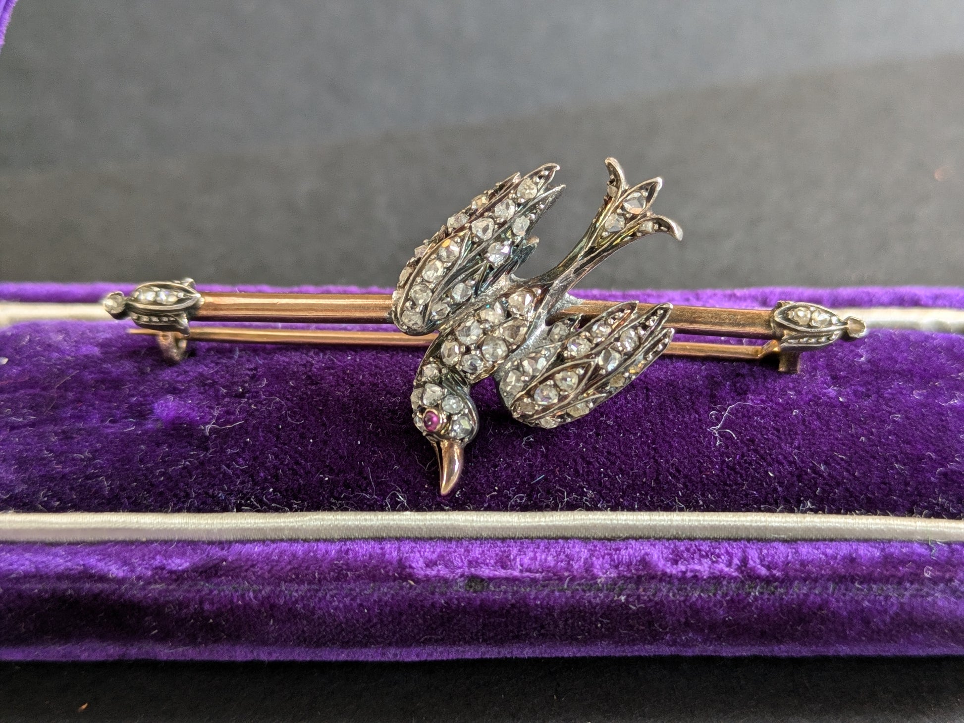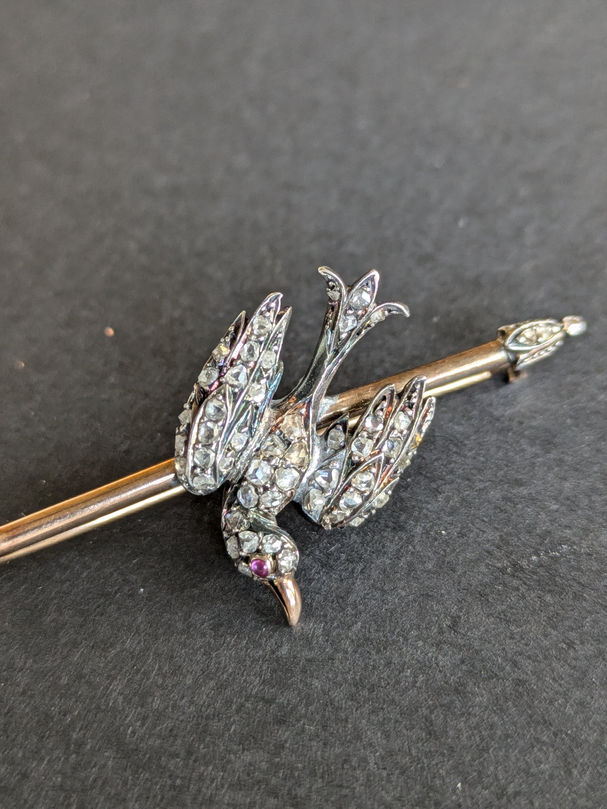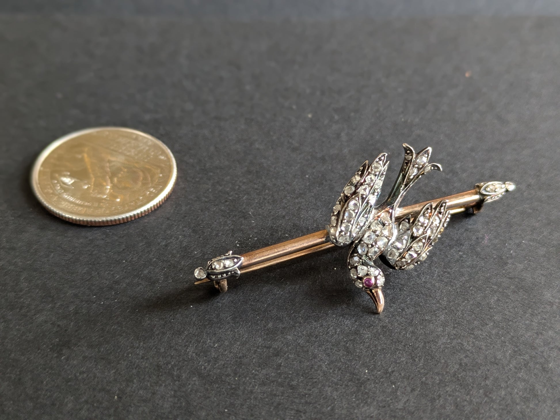 French 18k and Silver Napoleonic Bird Brooch with Single Cut Diamonds and Ruby