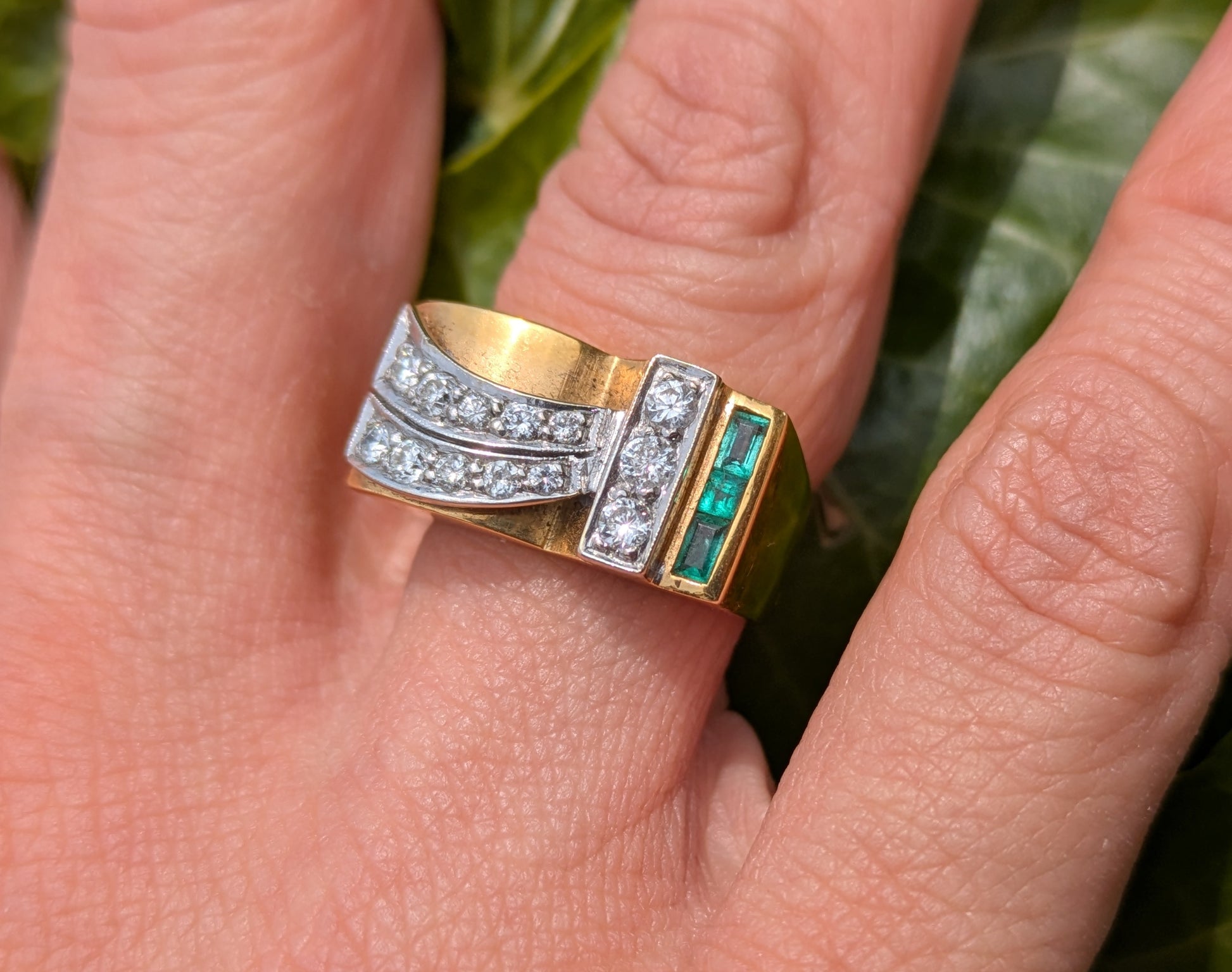 French Hallmarks Calibre Cut Emeralds and Old European cut Diamonds set in Platinum (Size 6.25)