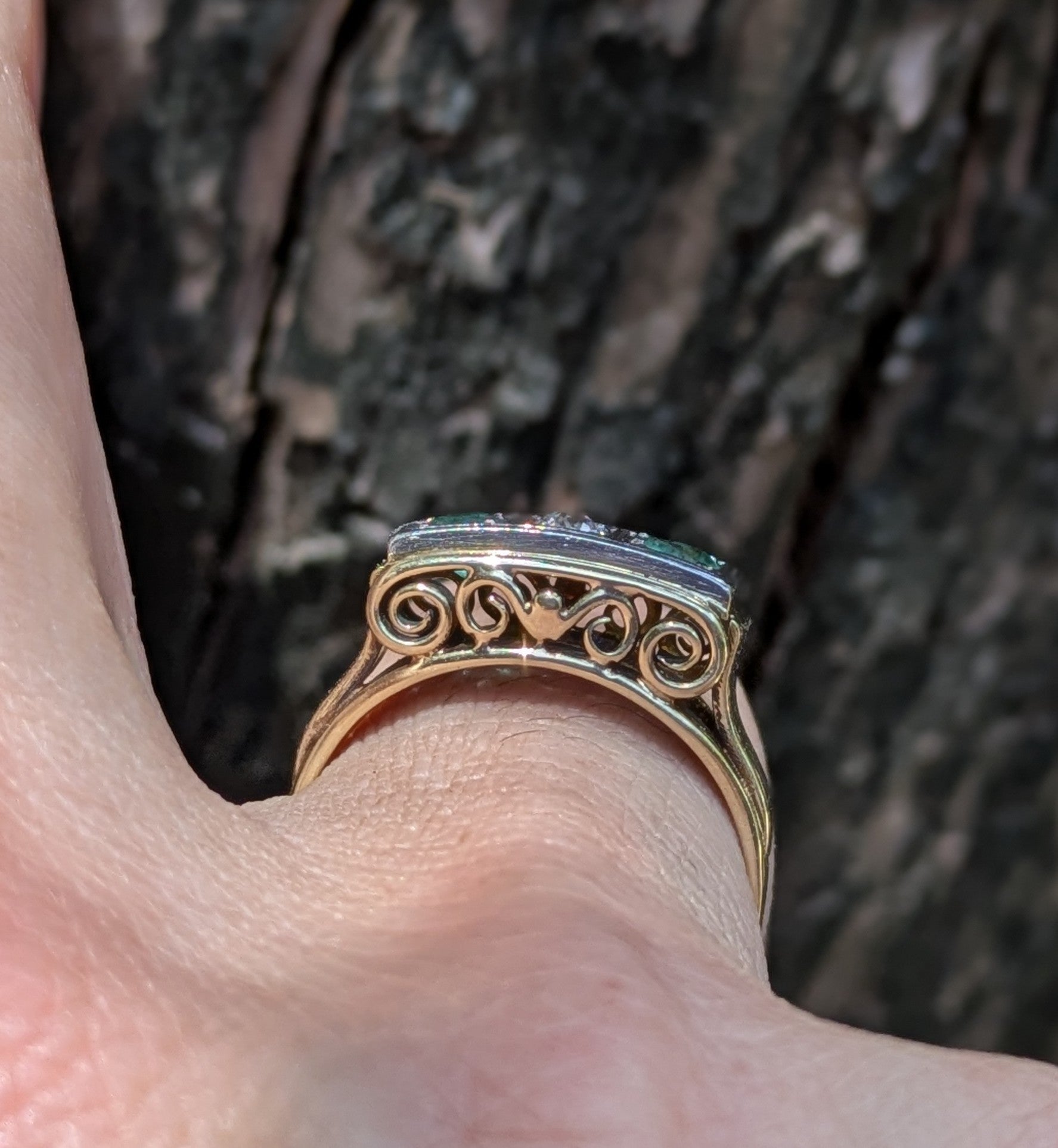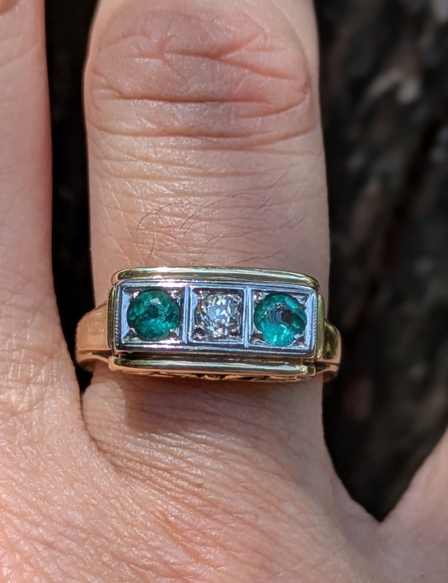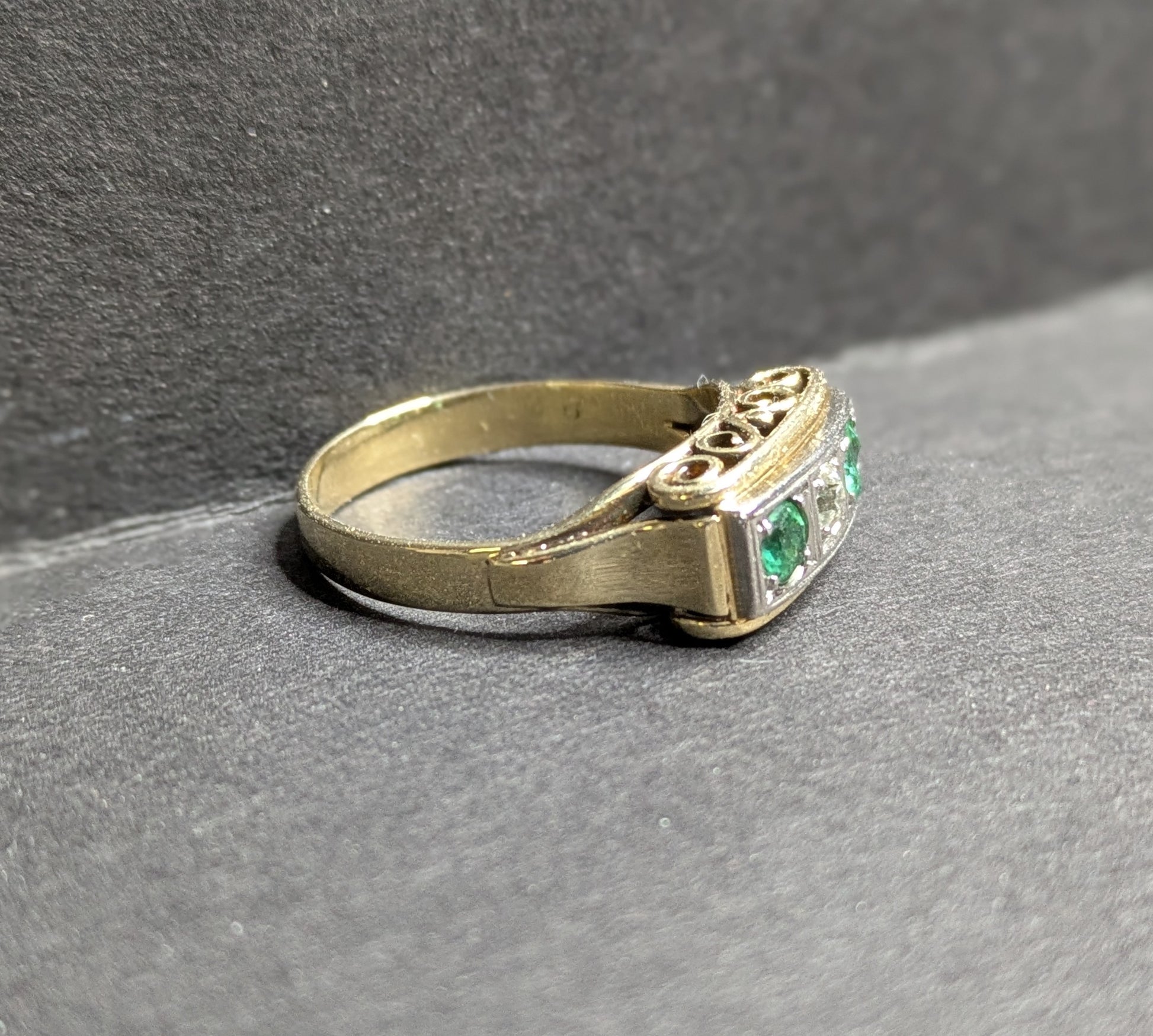 German 1950's 14k Three Stone Emerald and Diamond Ring