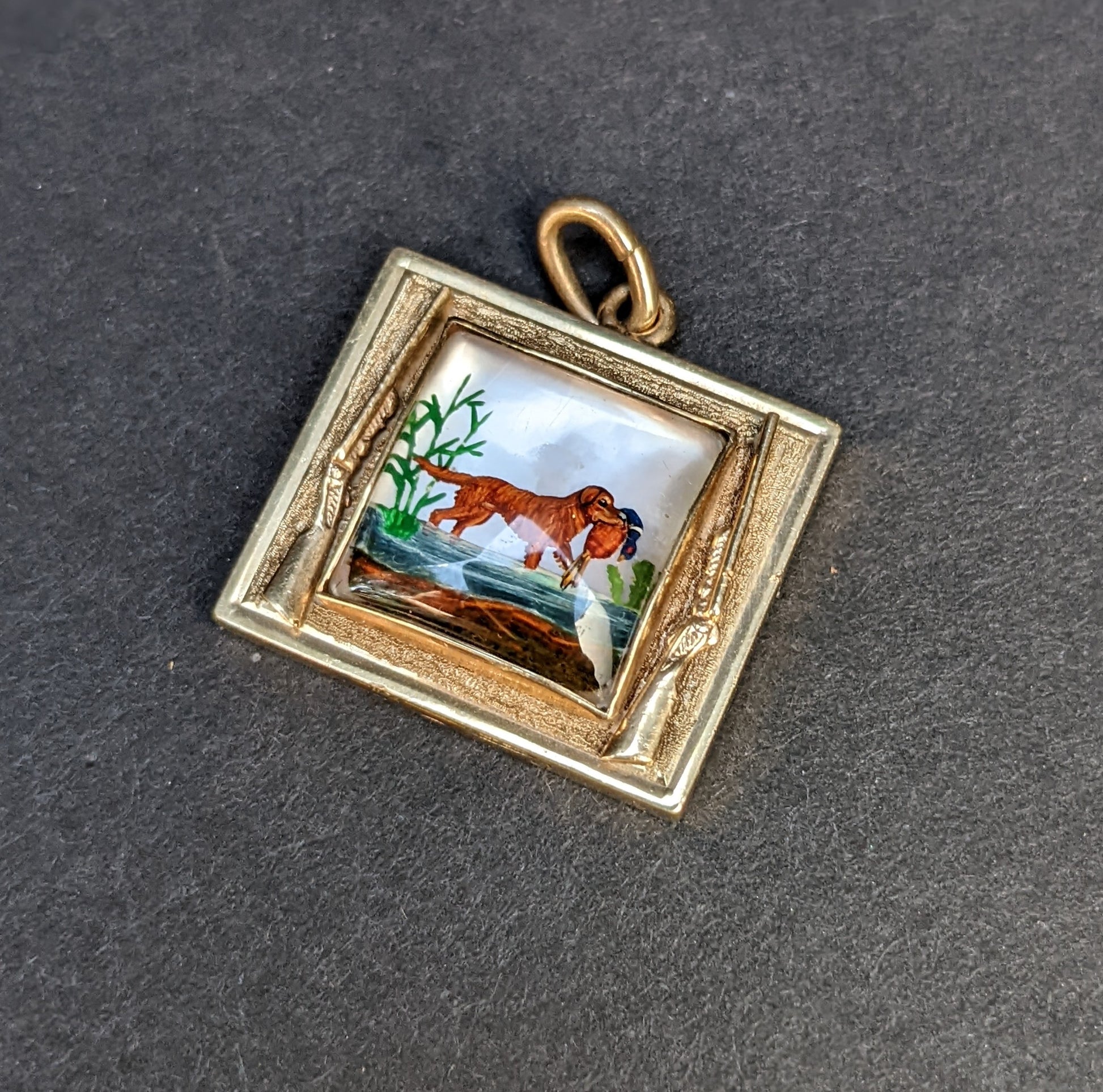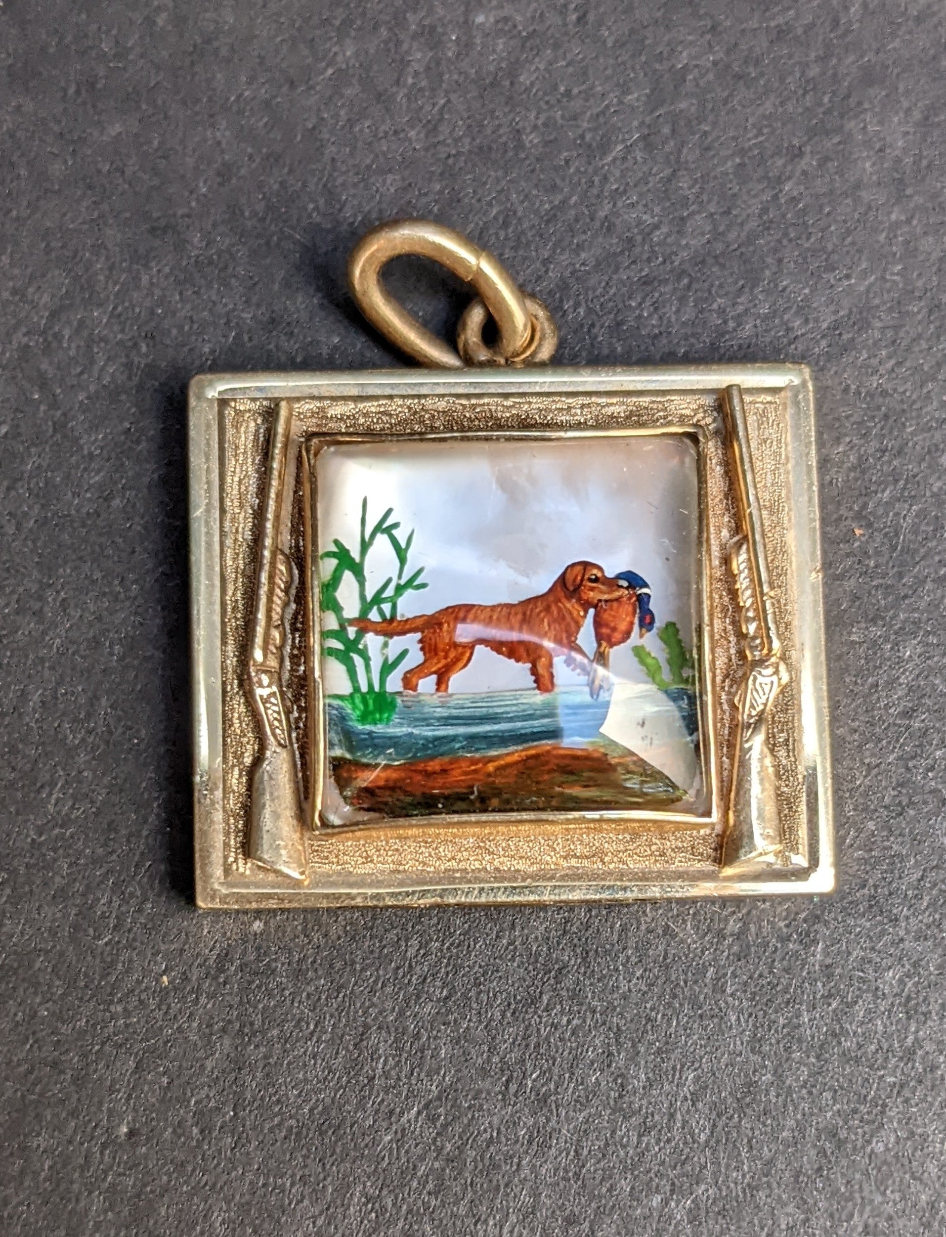 A lovely 9k Essex crystal with Golden Retriever and duck. The frame is atypical and includes 3 dimensional shotguns. Monogram-able