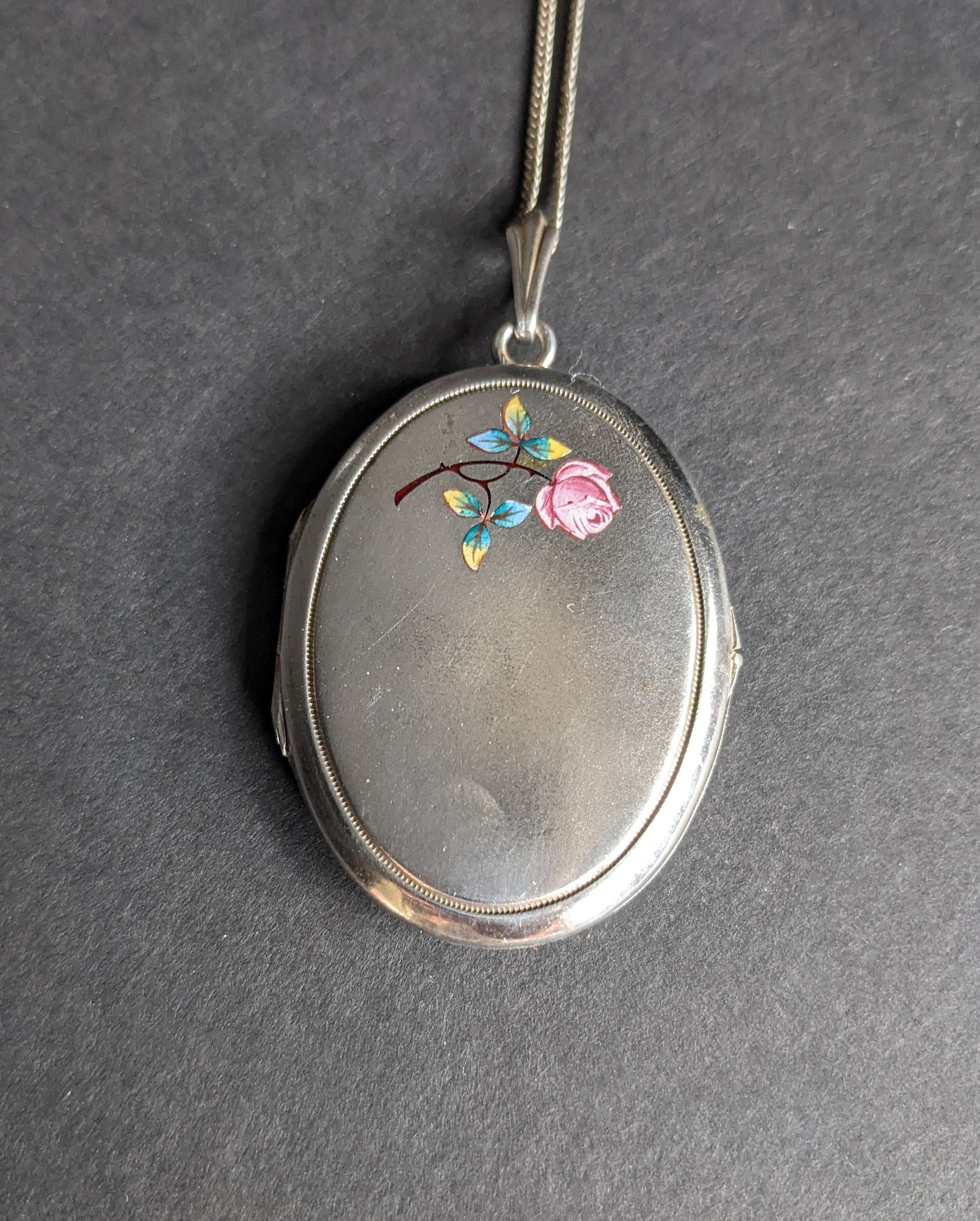 Large silver locket with enamel rose and monogram