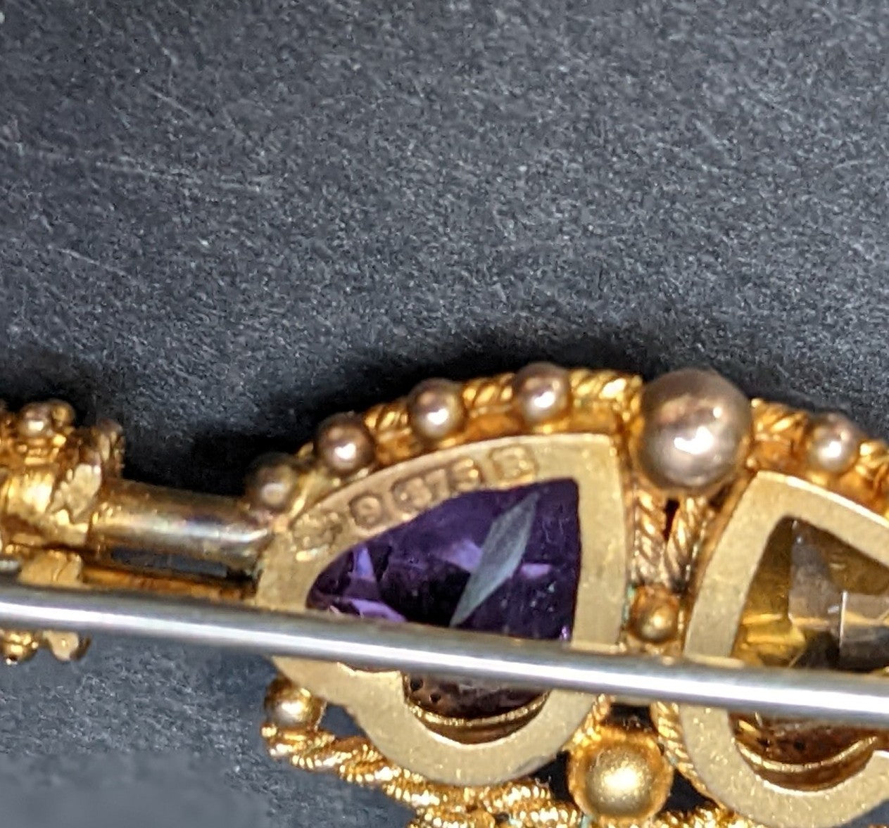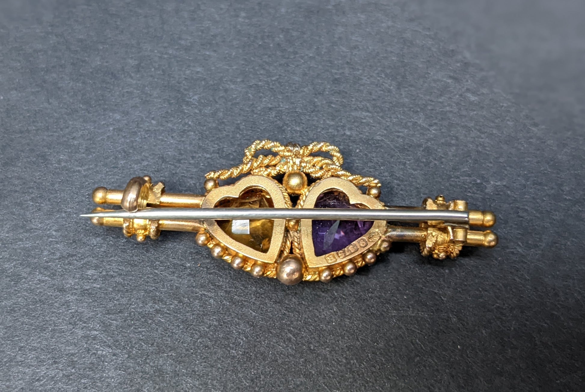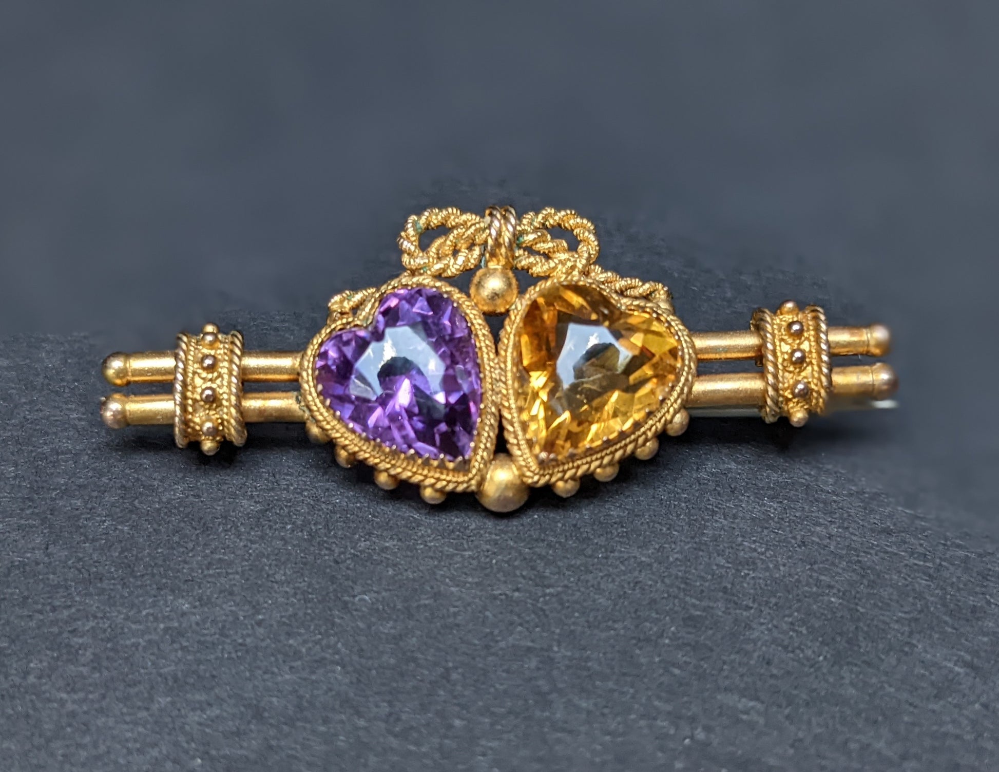 Citrine and amethyst are set in two entwined hearts. A very traditional Scottish symbol the Luckenbooth was often give as a betrothal or wedding gift.