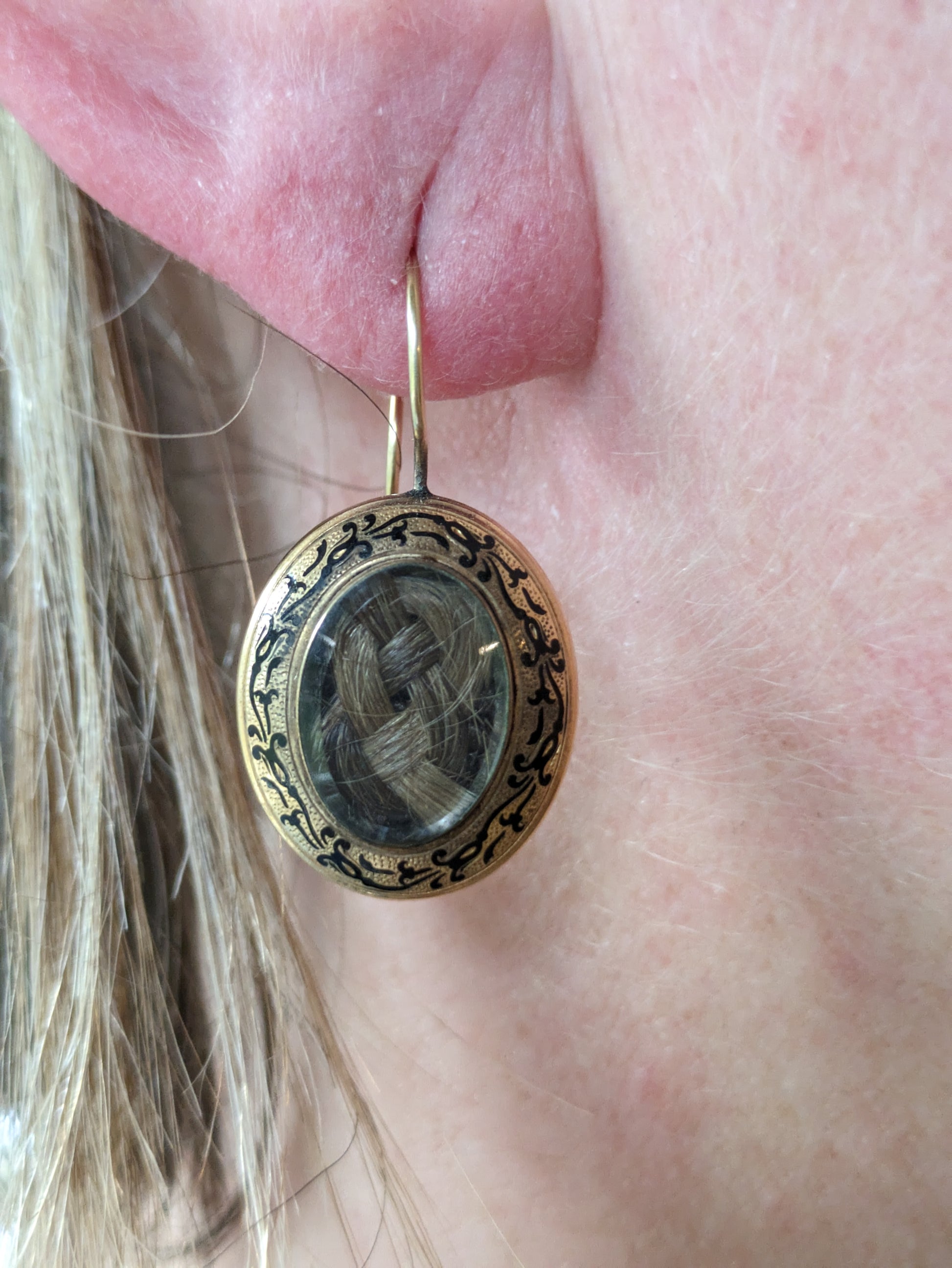 AA May 8 1871 Mourning earrings with hair and black enamel