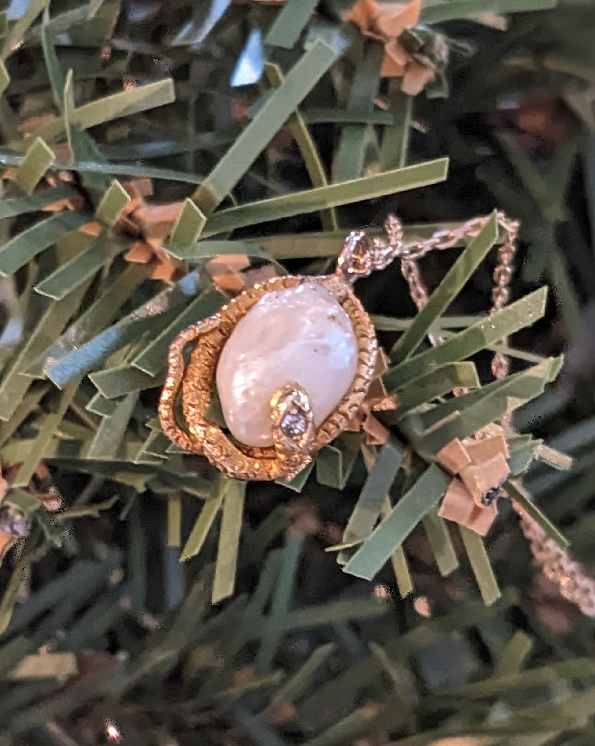 Natural pearl wrapped in snake with diamond head