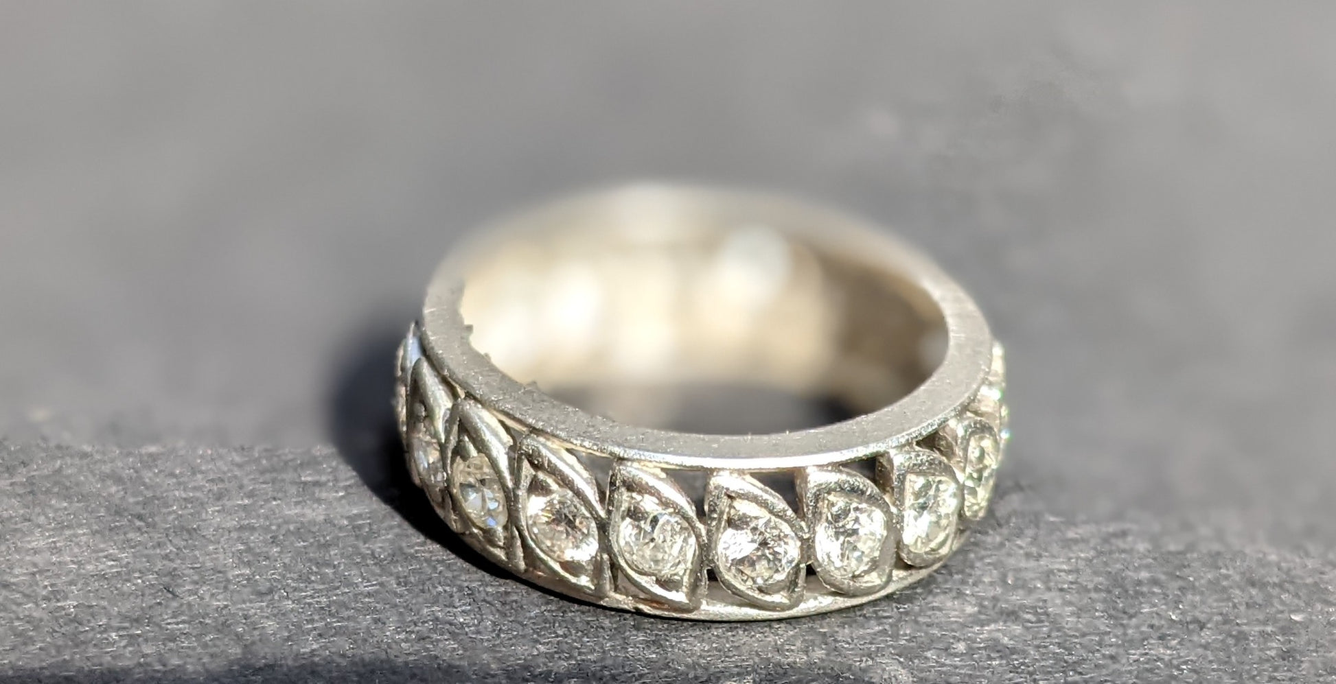 Beautiful platinum openwork ring with approx 1.25tcw. Each leaf is set with on Old European cut diamond.
