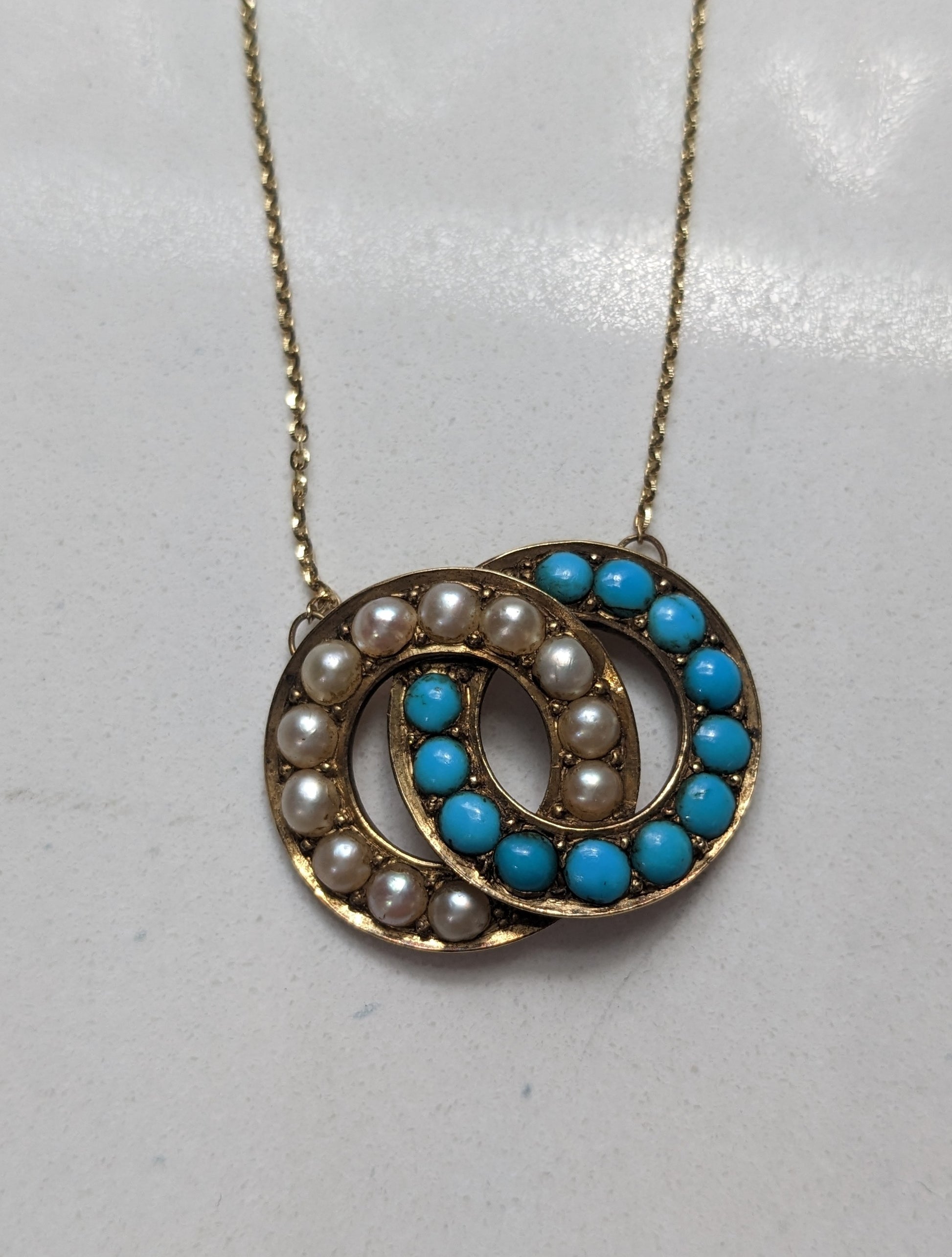 Turquoise and pearl, 15k gold piece, 1 inch wide
