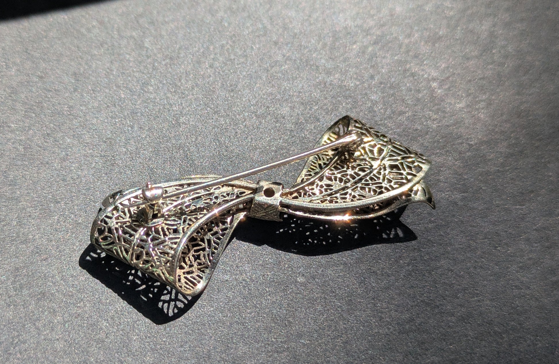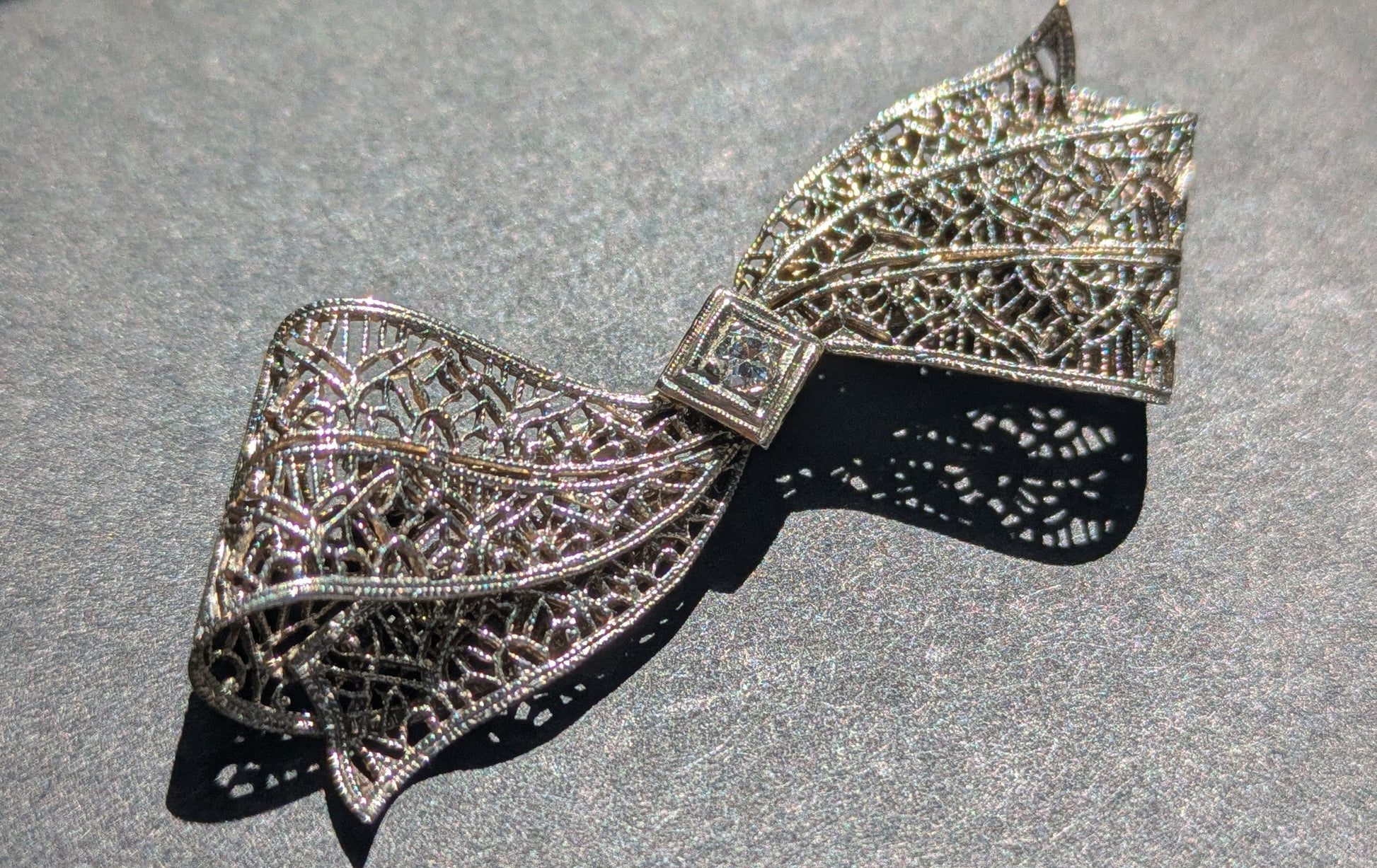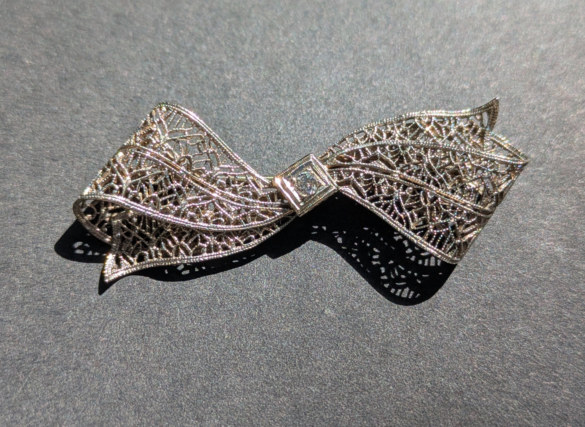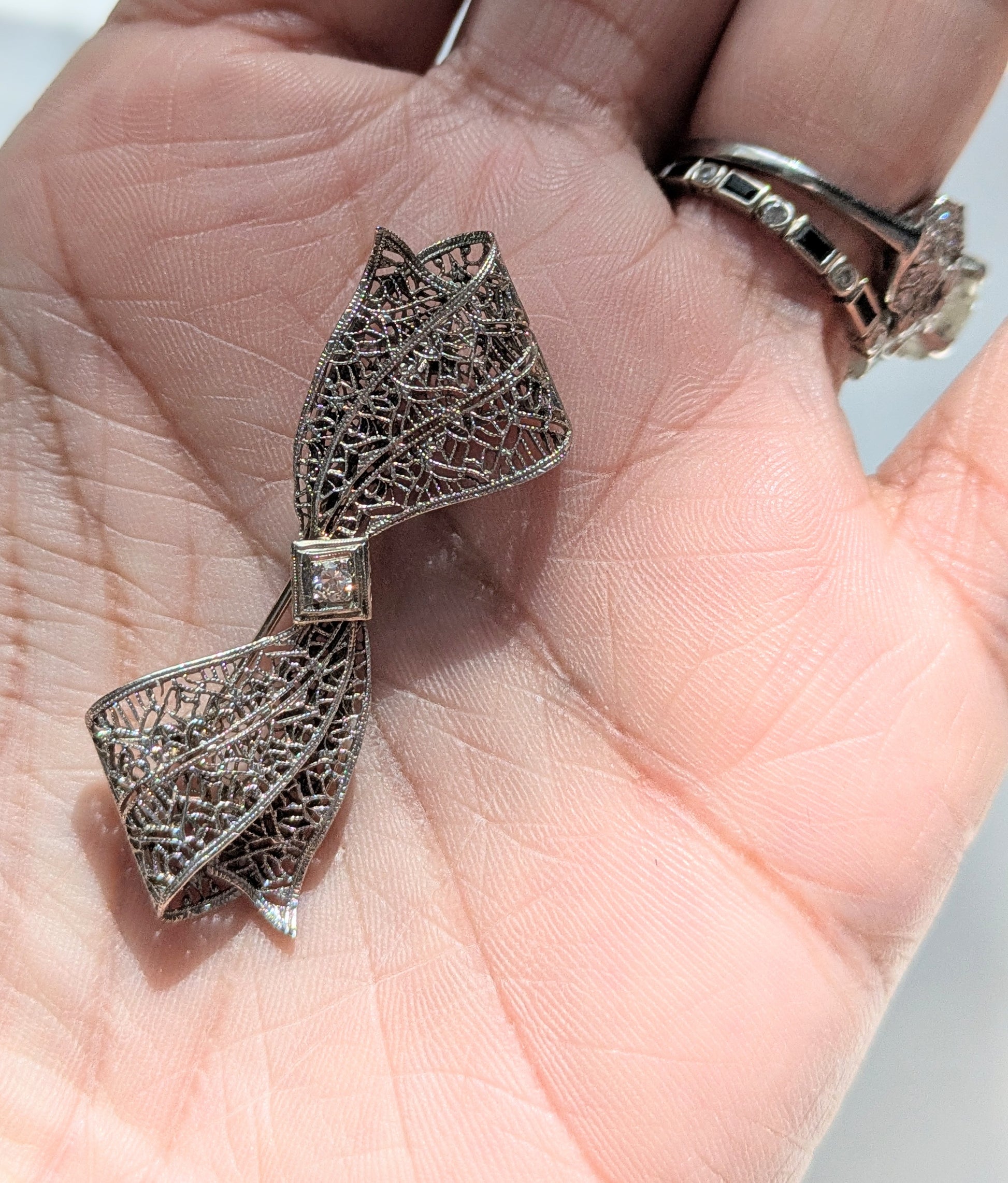 White Gold Filgree Bow Brooch with OEC Diamond